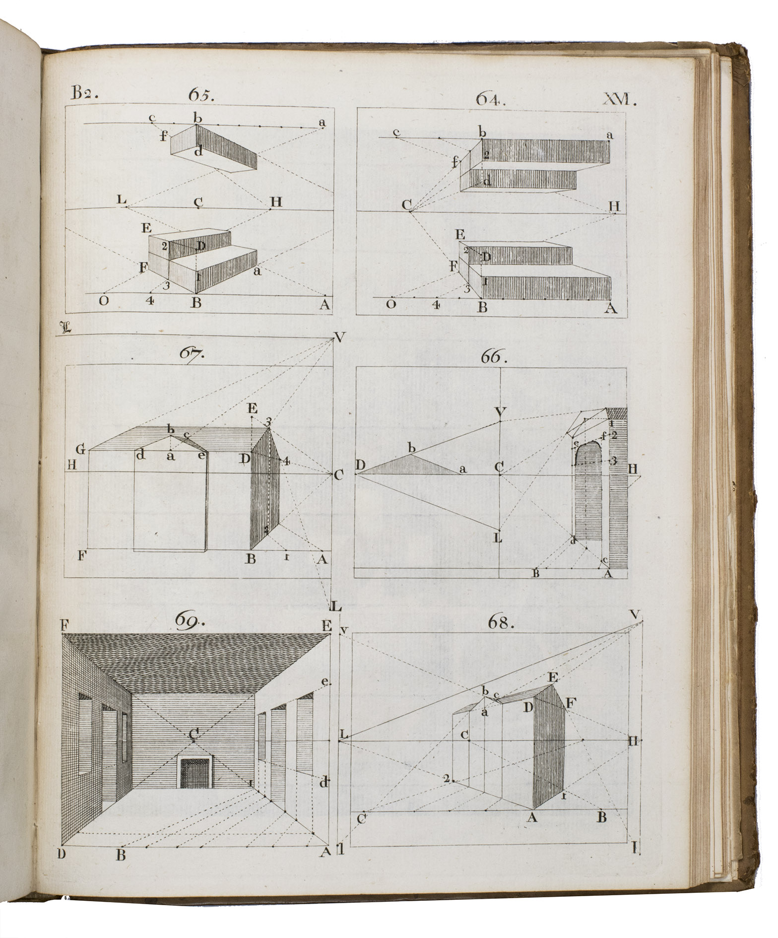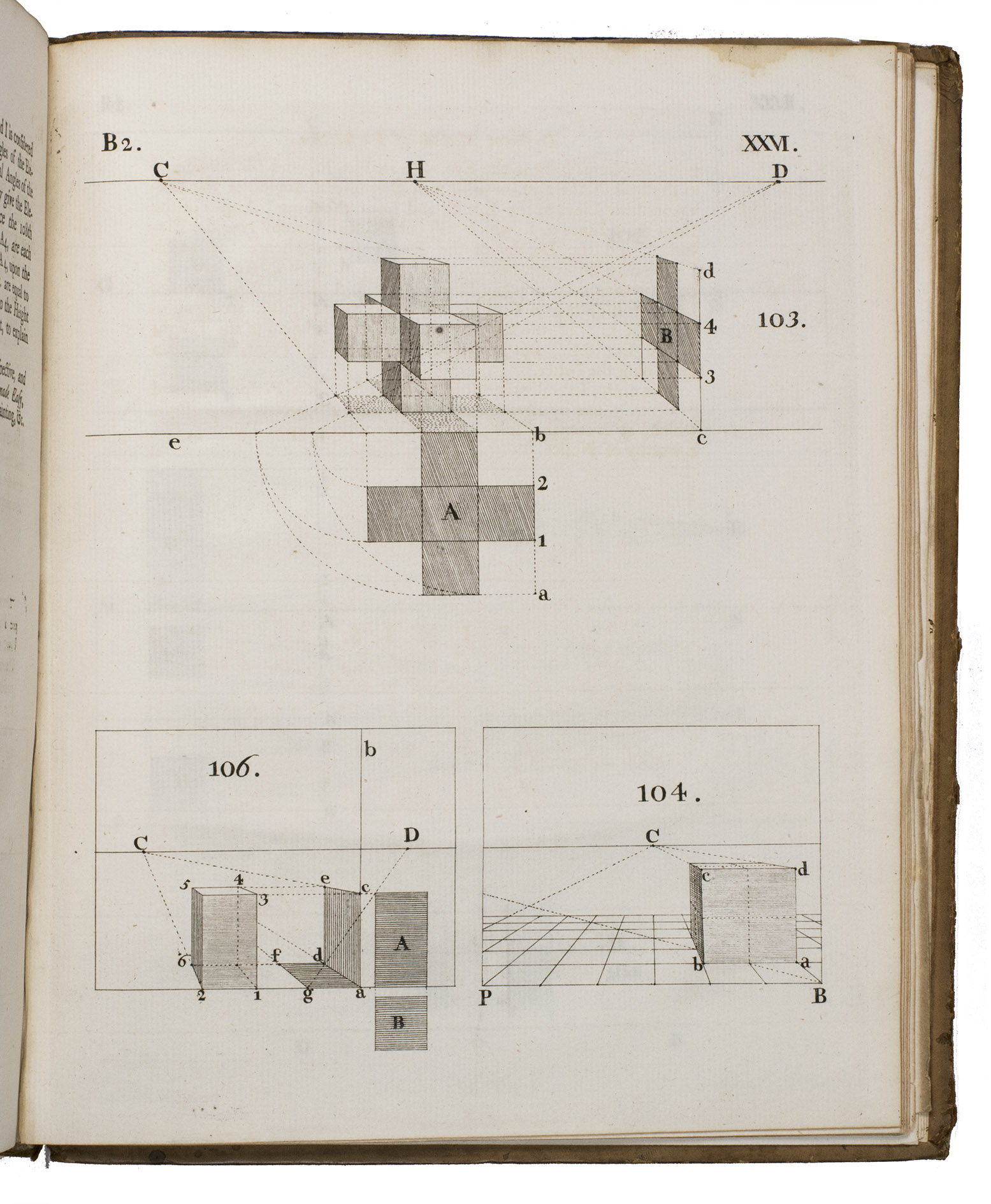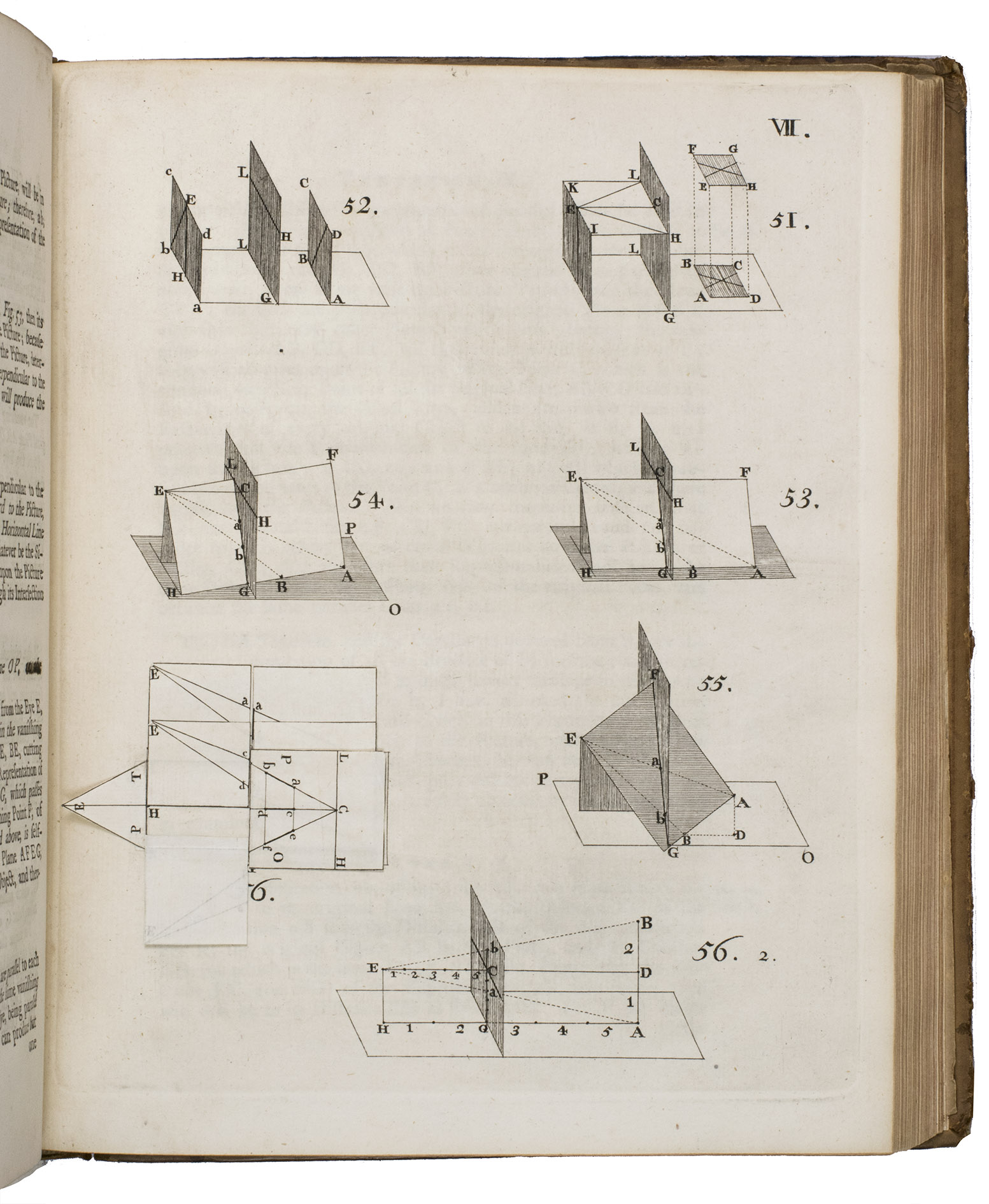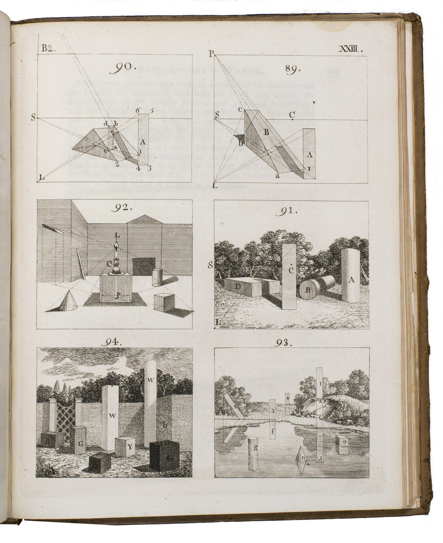 2 parts in 1 volume. Large 4to. With hundreds of perspectival figures, plans, and designs on 52 full-page engraved plates, including 2 intricate perspectival designs with movable parts, and several beautiful wholly finished perspectival designs. Further with the hilarious frontispiece by William Hogarth showing a lively river landscape with fishermen, boats, a cart riding over a bridge, a far away village church etc., drawn without any accurate use of perspective, which led to absurdities such as a woman leaning out of the upper window of a house in the foreground and offering a light to a man with a pipe on top of a hill in the background. Contemporary calf, spine ribbed and gilt. [1], [1 blank], [2], IV, XVI, 78; [1], [1 blank], 84, [15], [1 blank], [1], [1 blank] pp.