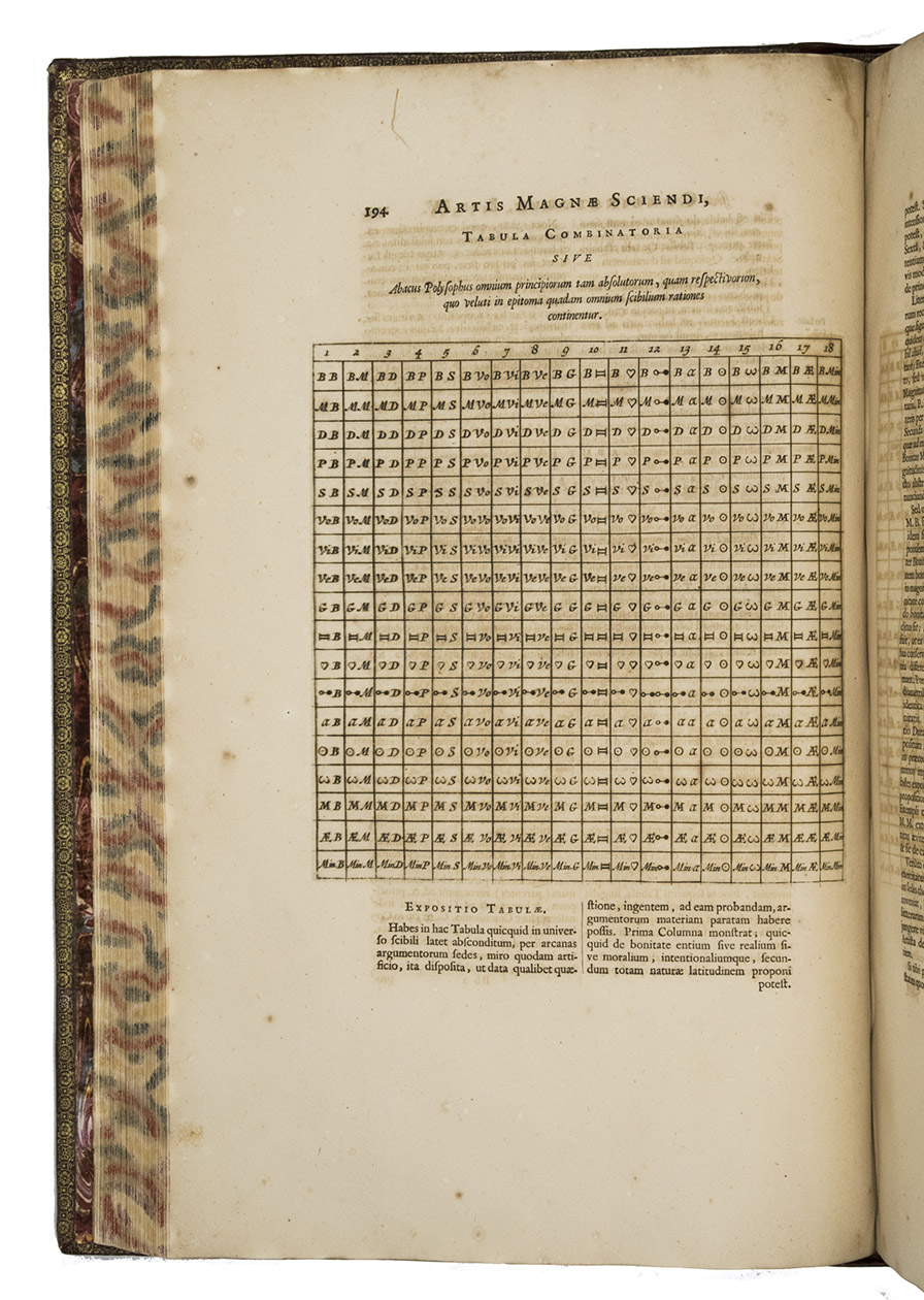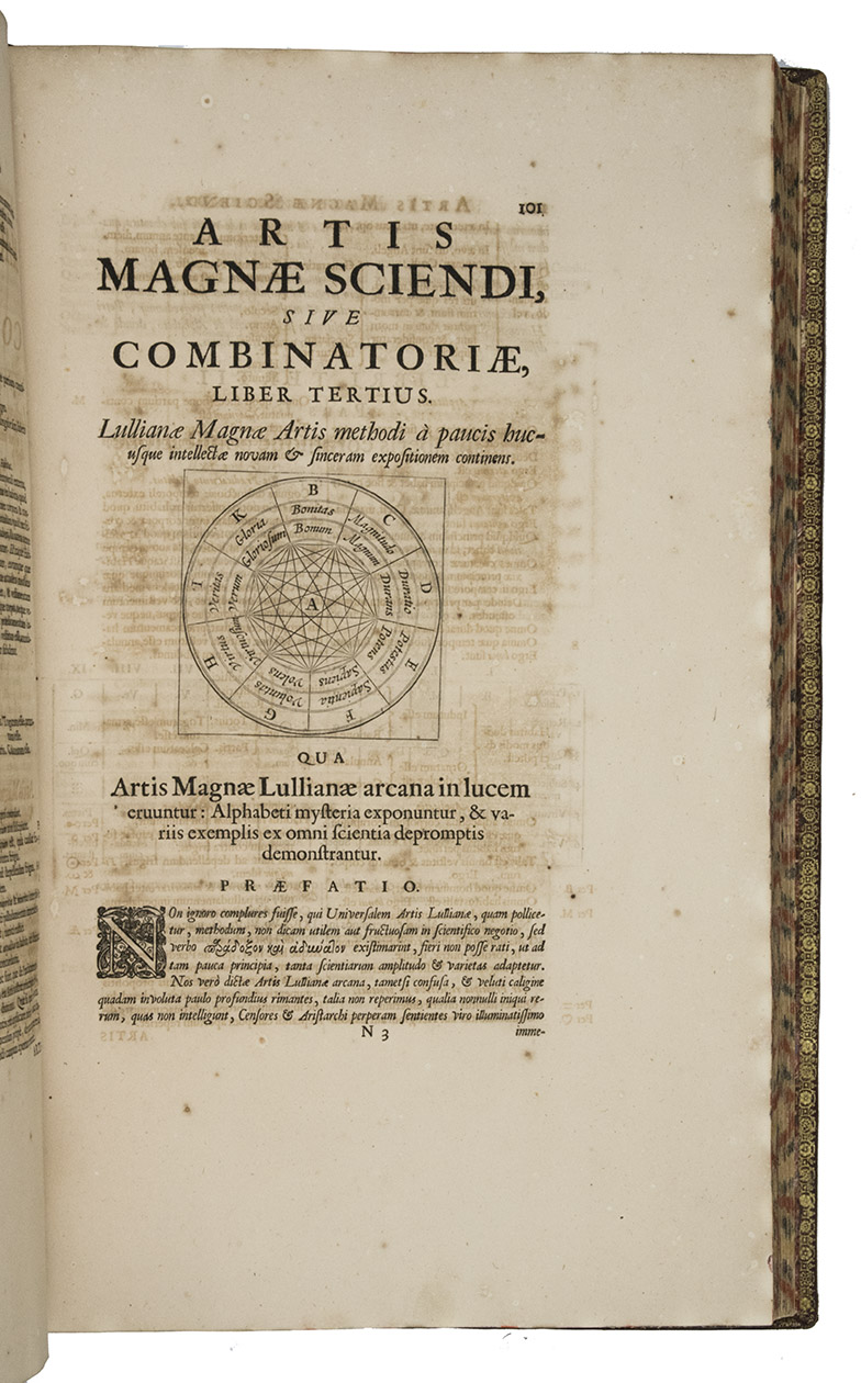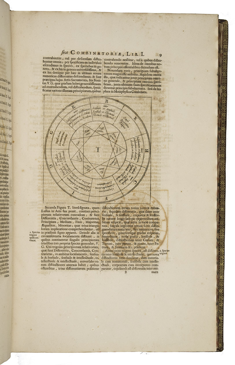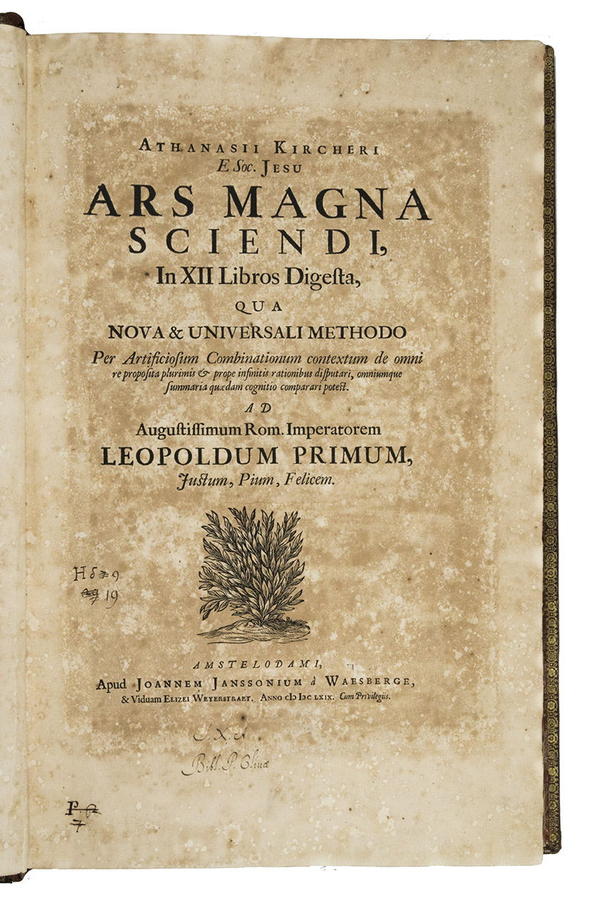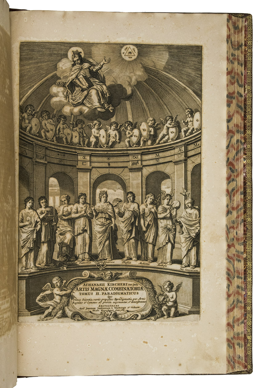 Ars magna sciendi, in XII libros digesta, qua nova & universali methodo ... [vol. 2 half-title:] Artis magnae seu combinatoriae sciendi, ... [titles on the frontispieces:] Ars magna sciendi sive combinatoria [vol. 1] Artis magnae combinatoriae [vol. 2].
