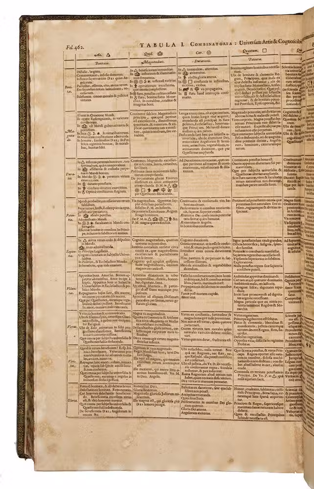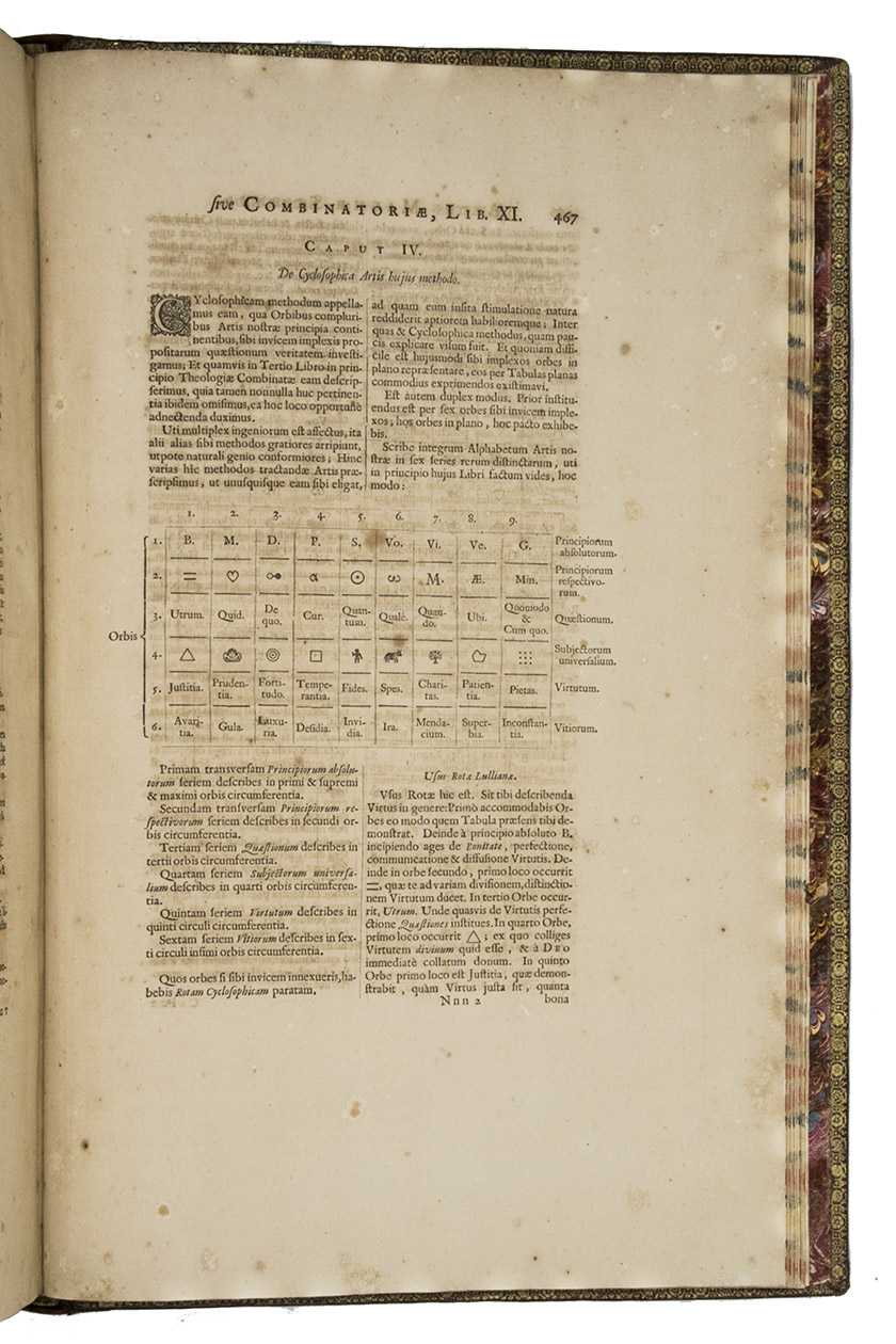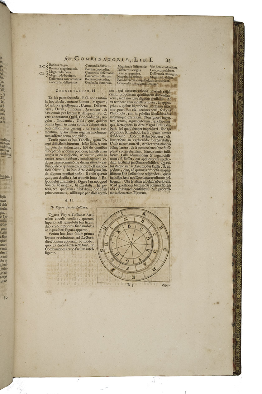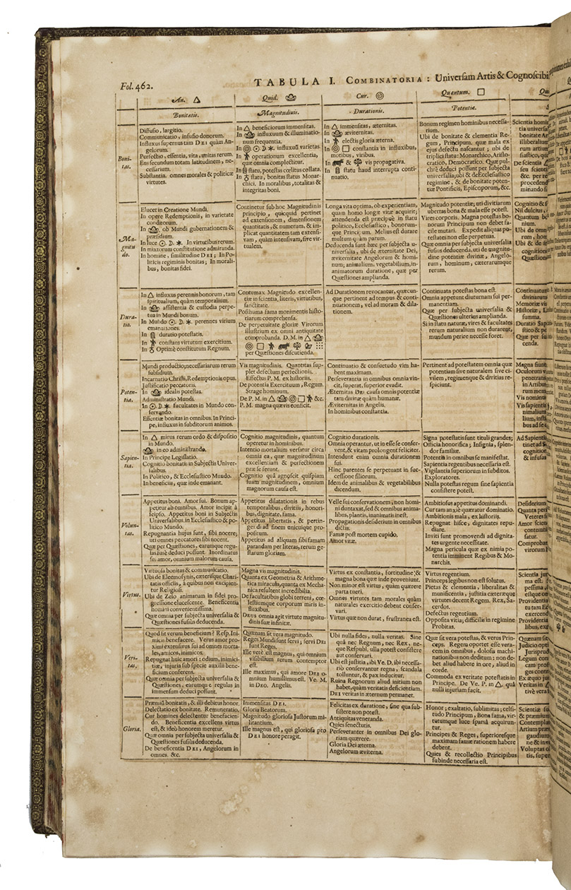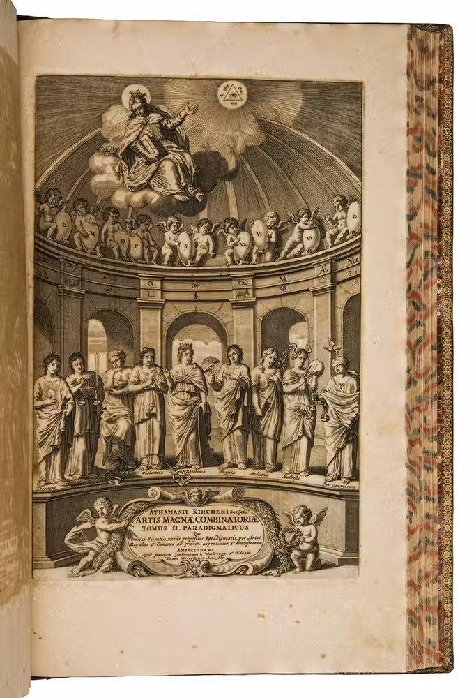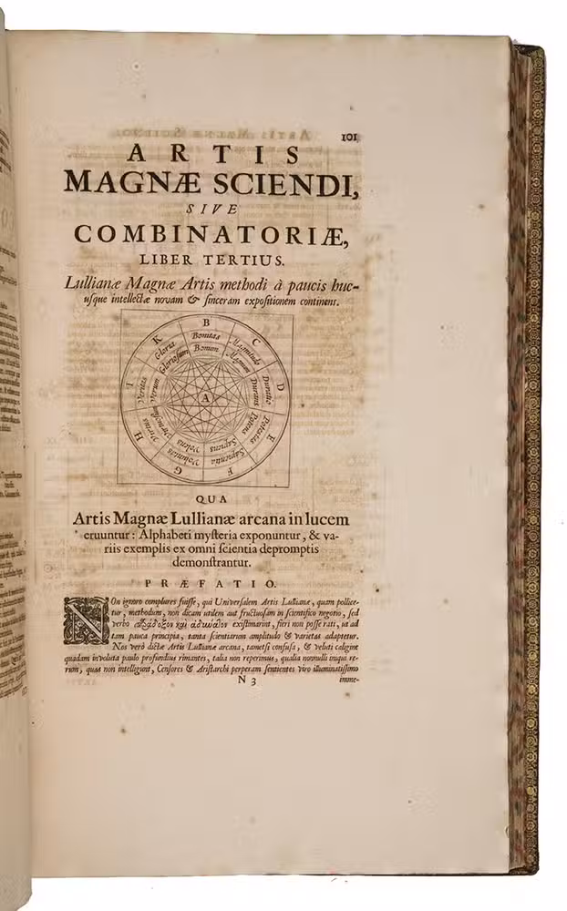 Ars magna sciendi, in XII libros digesta, qua nova & universali methodo ... [vol. 2 half-title:] Artis magnae seu combinatoriae sciendi, ... [titles on the frontispieces:] Ars magna sciendi sive combinatoria [vol. 1] Artis magnae combinatoriae [vol. 2].