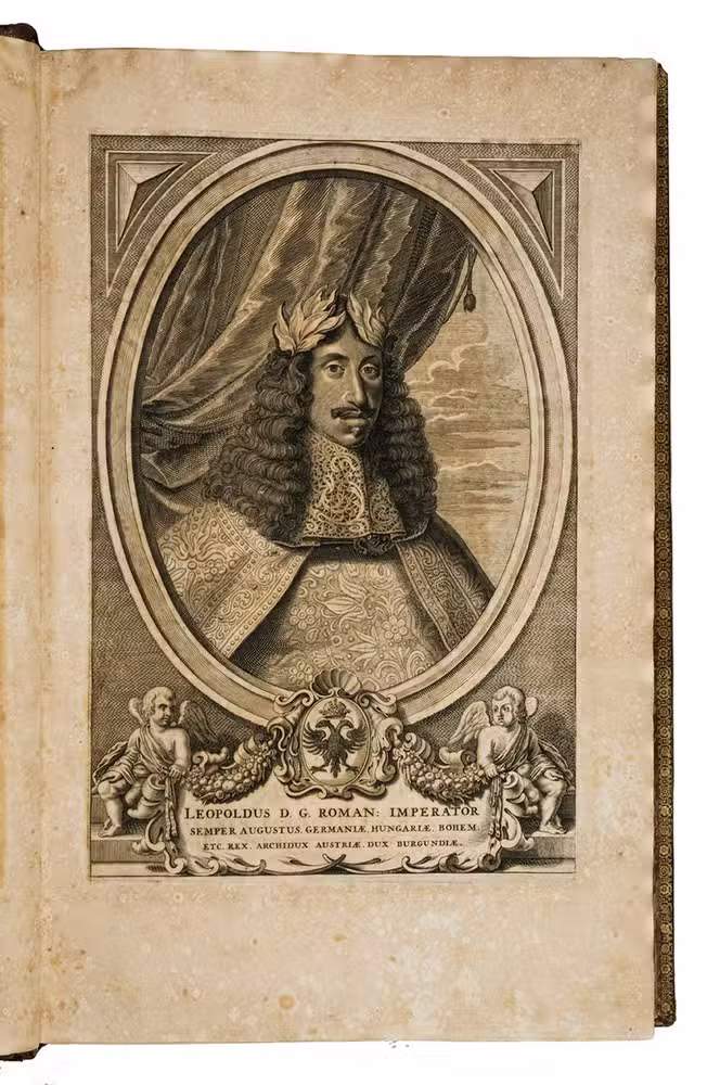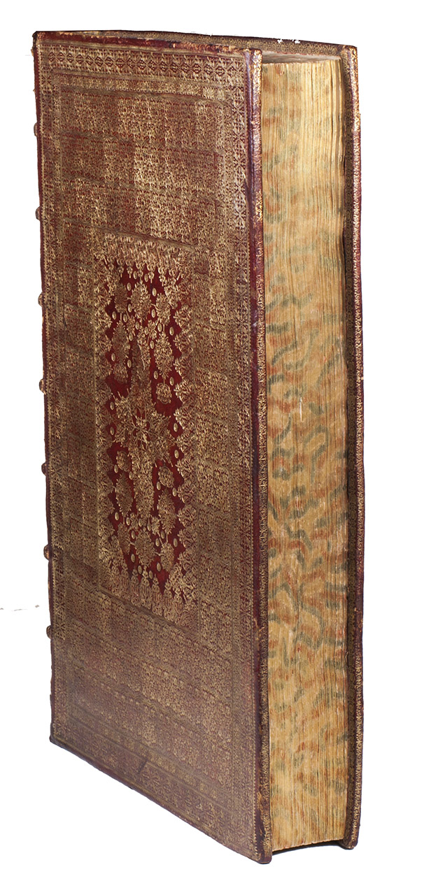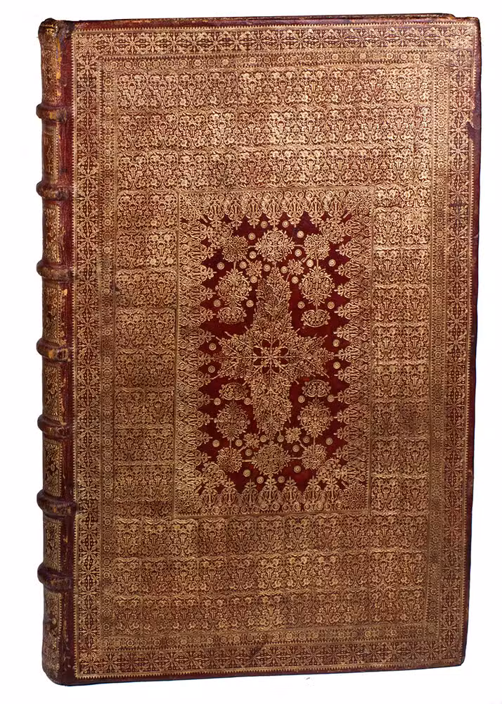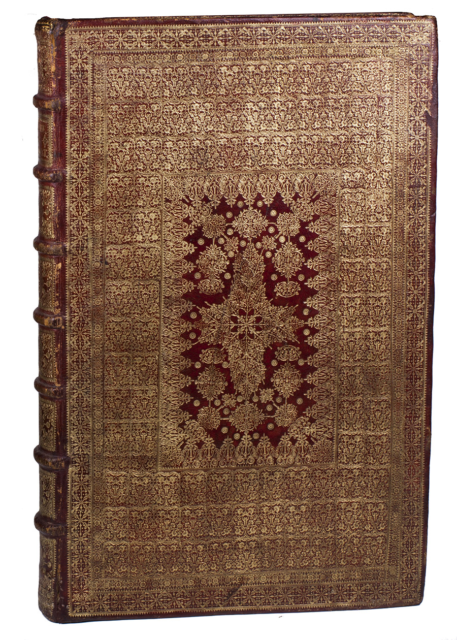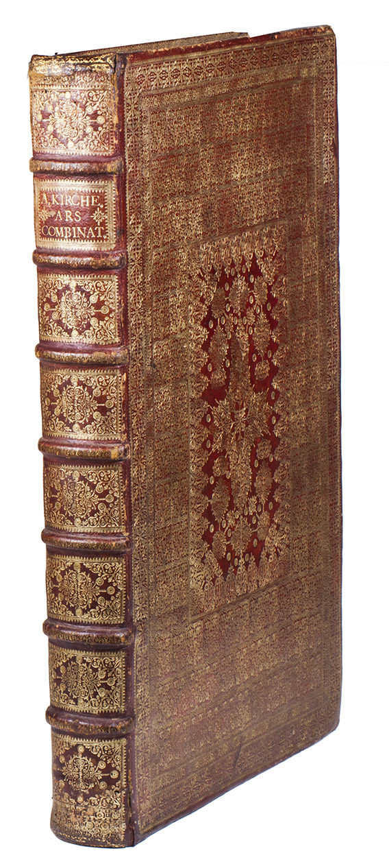 With the contemporary owner's inscription of Giovanni Paolo Oliva at the foot of the title-page and the armorial bookplate of the Bibliotheca Philosophia Hermetica in Amsterdam. Browned and foxed as usual, a few leaves severely, with the ink of both the letterpress text and the engravings sometimes leaving a browned offset or showing through on the reverse, but otherwise in good condition. The foot of the spine has a crack in the front hinge and a few worm holes and repaired tears in the backstrip (all in the lowest 4 cm); the head of the spine also has a few worm holes but only minor damage. The binding is otherwise in very good condition, with only minor scuff marks around the extremities and with nearly all of the tooling clear and well-preserved. The turn-ins have browned the outer edges of the marbled paste-downs, and the free endleaves are more severely browned than the leaves of the book itself. De Backer & Sommervogel IV, cols. 1066-1067 (Kircher 28); Breslauer cat. 107 [1984?], p. 188 & cat. 110 [1992?], no. 107 (the present copy); Caillet 5771; Dünnhaupt, Bibliogr. Handbuch, Kircher 23; Ferguson I, p. 467; Findlen, Athanasius Kircher, pp. 7, 35, 83-85 & passim; Fletcher, Athanasius Kircher (2011), pp. 415-417 , 495, 557-558 & 567 (no. 24); Honeyman 1827 (incompl.); Merrill, Athanasius Kircher 22 (2 copies, 1 lacking 1st frontispiece & 1 lacking portrait); Thorndike VII, p. 567; for the Morgan Library copy in a nearly identical binding: H. de la Fontaine Verwey, "The binder Albert Magnus ...", in Quaerendo, 1 (1971), pp. 158-178, at p. 163, note 3; Mirjam Foot, Henry Davis gift I (1978), p.246; Dorothy Miner/Walters Art Gallery, History of bookbinding (1957) 434 (ill.); Howard Nixon, Broxbourne Library (1956), p. 154; Sothebys London, 13 July 1948 (Baron Horace de Landau coll.), lot 69; Sothebys London, 13 March 1956 (J.W. Hely-Hutchinson coll.), lot 391 (ill.); for Van Waesberge: Van Eeghen, De Amsterdamse boekhandel IV, pp. 257-163.