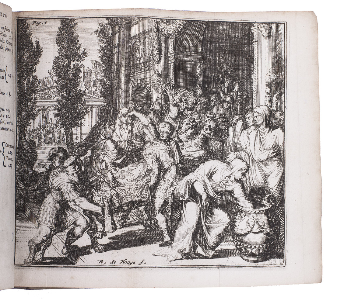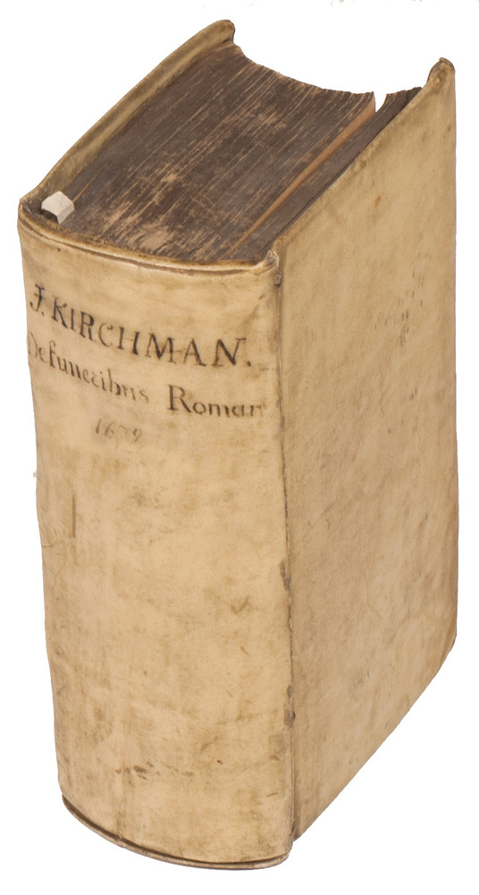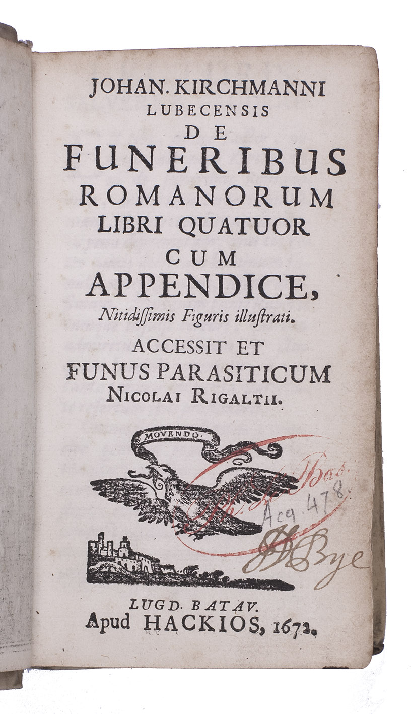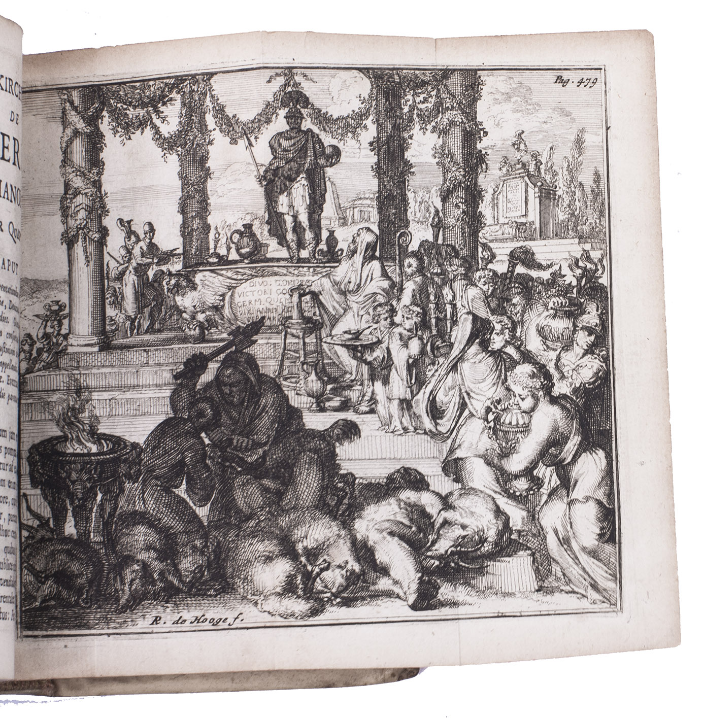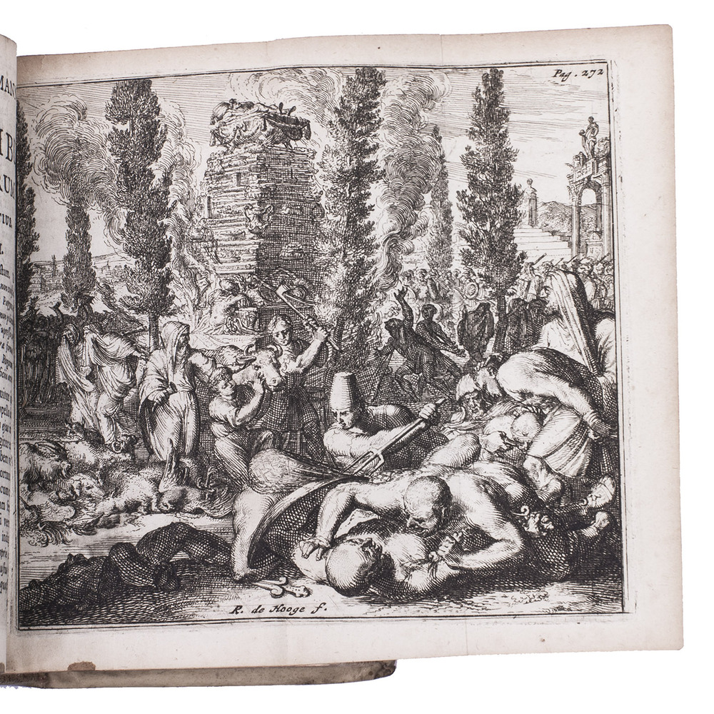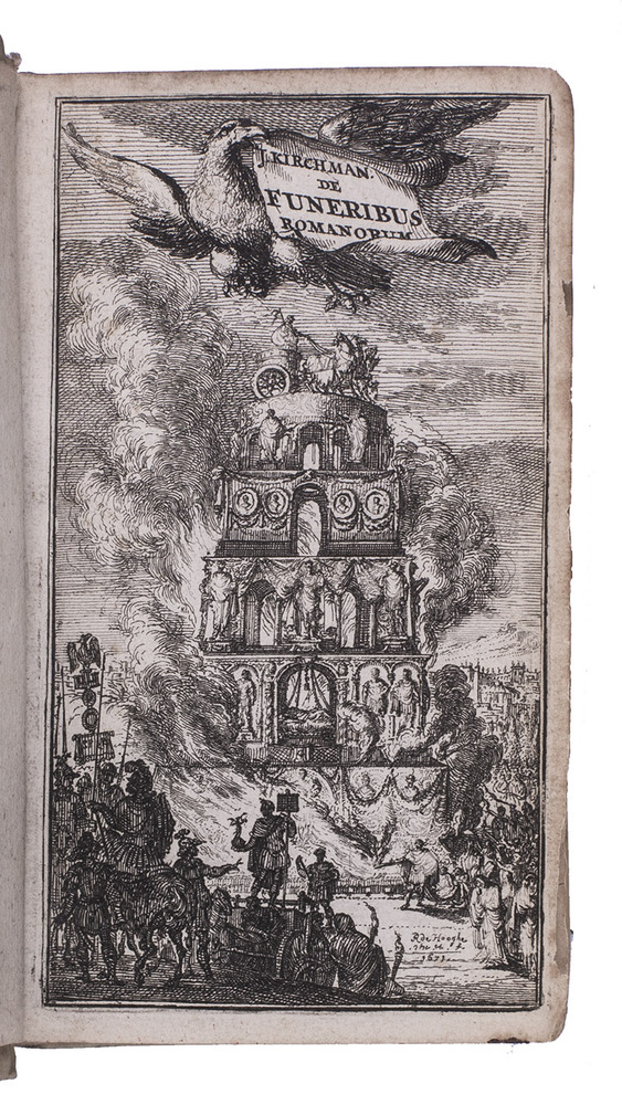 Ad 1: Late edition, the first published in the Netherlands, of an historical work on the funeral rites in ancient Rome, by the German Philologist Johann Kirchmann (1575-1643), illustrated with a frontispiece and four vivid engravings by the Dutch engraver Romeyn de Hooghe (1645-1708), published here for the first time. The book is divided into four parts, each opening with one of the folding engraved plates, showing pyres, processions, people in mourning and more. The text covers the many different funeral rites and ceremonies that were common in ancient Rome, citing numerous ancient authors. It deals with burial sites, cremations, tombs and graves, offerings, processions, etc. Added at the end is a brief treatise by the French librarian Nicolas Rigault (1577-1654), describing how to keep parasites away from corpses.