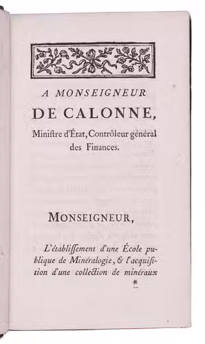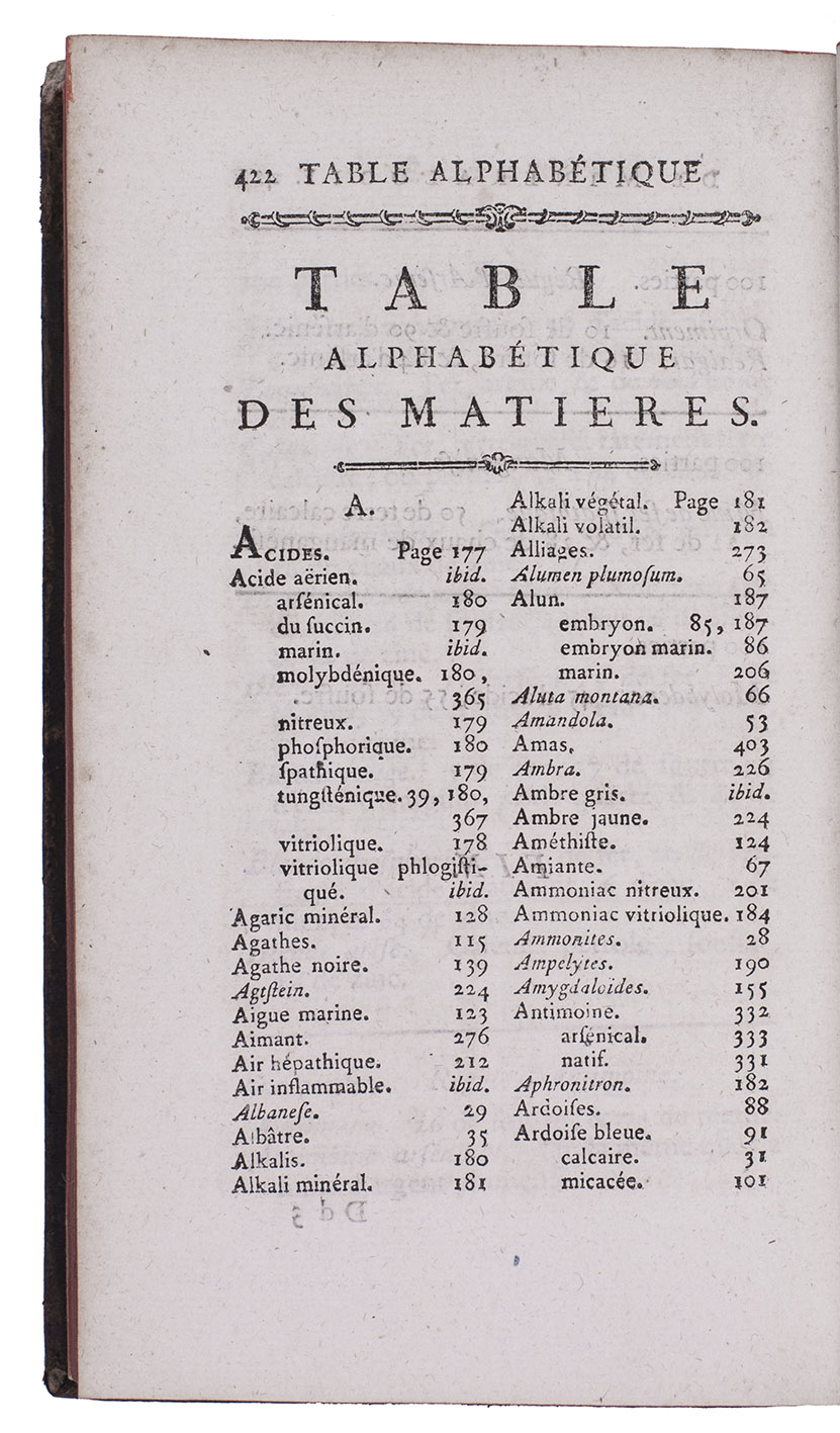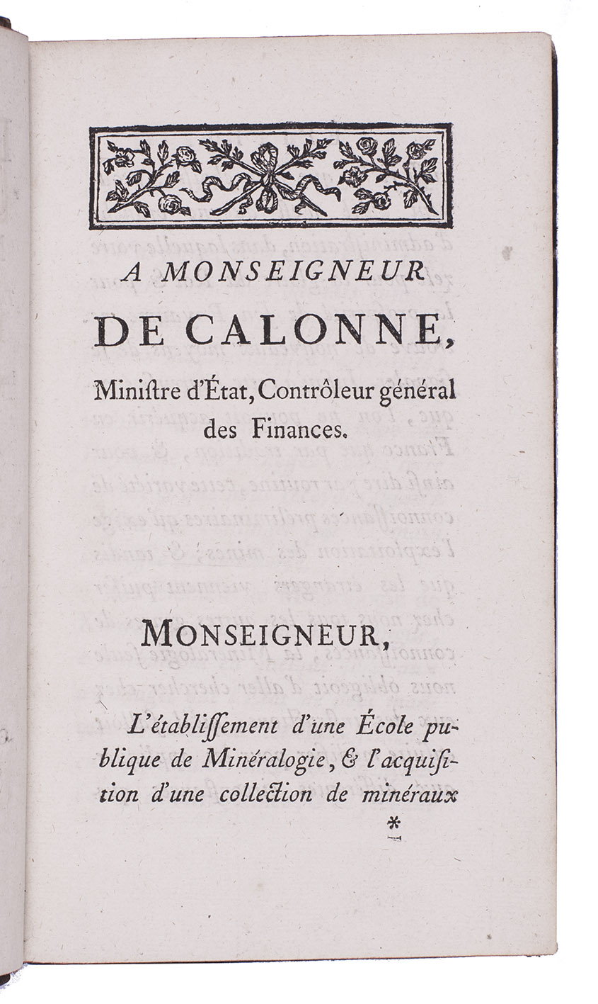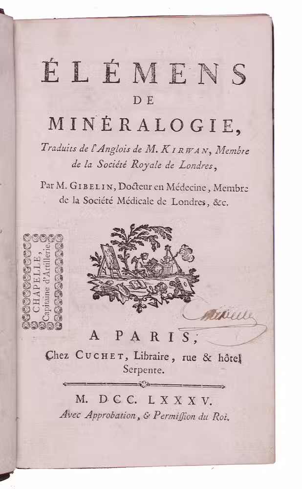 First edition of the French translation of a well-known mineralogical work by the Irish chemist, mineralogist and geologist Richard Kirwan (1733-1812). The original English was first published as Elements of mineralogy in 1784, and was "the first systematic mineralogy in English that classifies minerals by their chemical composition" (Schuh). The book opens with a preface, in which Kirwan discusses the position of mineralogy within science in Britain, comparing it to progresses made in France, Germany and Scandinavia. "He concludes that mineralogy must be considered a branch of chemistry. In this regard, Kirwan follows Cronstedt and uses the latter's basic classification, subjugating the mineral species into earths and stones, salts, inflammables and metals, based upon the species' chemistry" (Schuh).