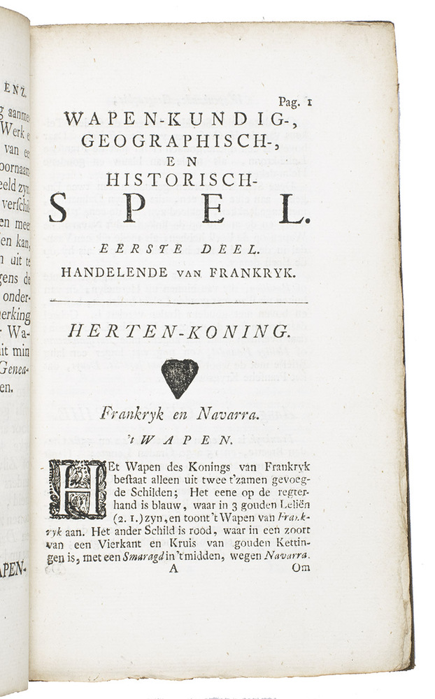 Vermakelyk wapen-kundig, geographisch, en historisch spel, betreffende de voornaamste heerschende staten in Europa. En dienende om de jonge lieden, inzonderheid die van een meer als gemeene geboorte of educatie zyn, de wapen-kunde, geographie en historie gelyk als speelender wyze te leeren.