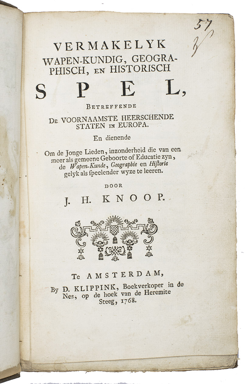 This booklet for the heraldic game was written by Johann Herman Knoop (1700-1778), who was curator of the garden of Princess Maria Louisa in Leeuwarden.