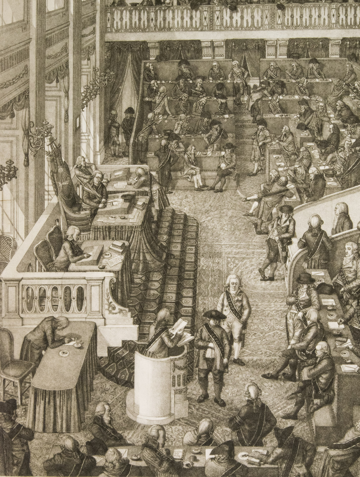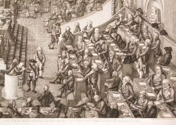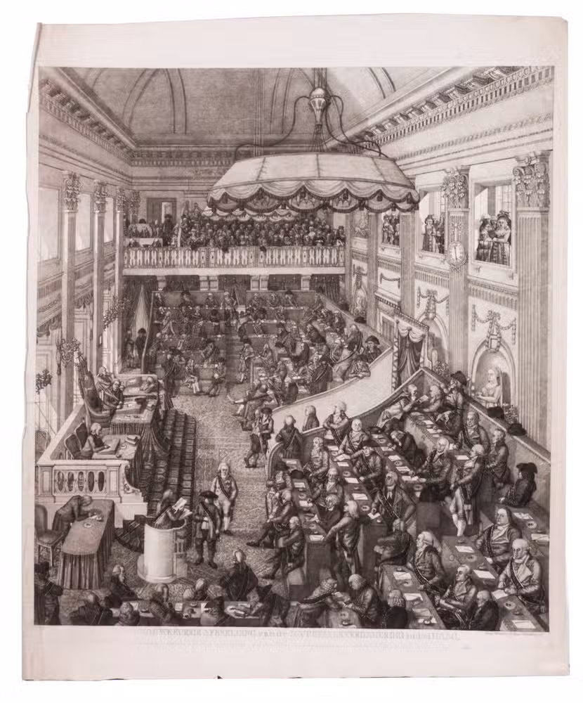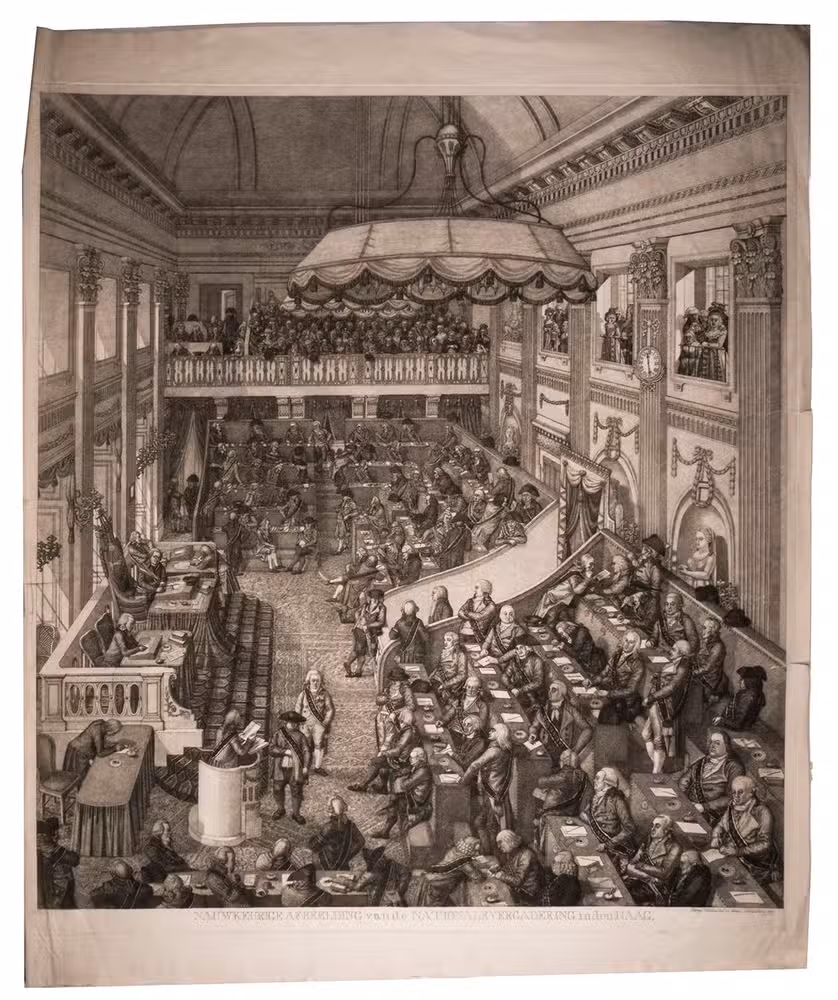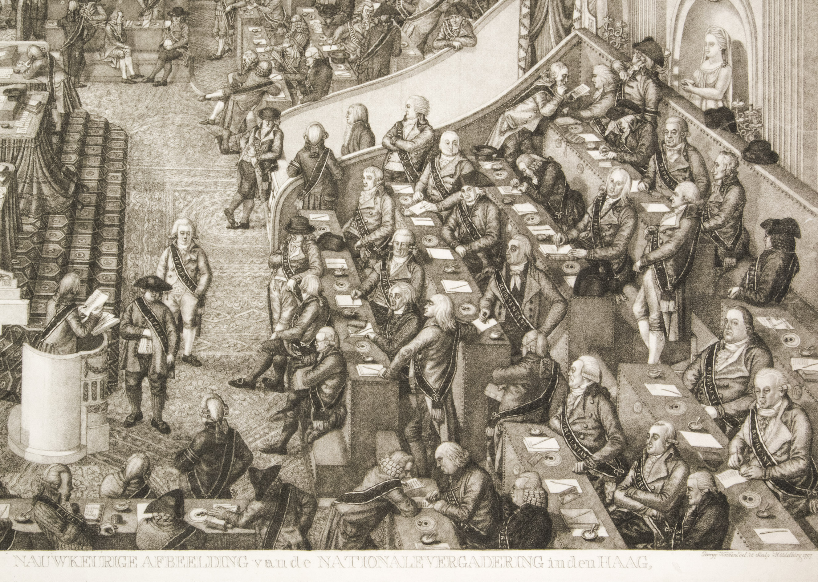 Large engraving of a meeting during the first session of the first democratically elected parliament of (most of) the Netherlands. The Batavian Republic was the new revolutionary state which replaced the United Republic of the Netherlands in 1795. The first session of the democratically elected parliament lasted from March 1796 to August 1797 and had the important task of writing a constitution.