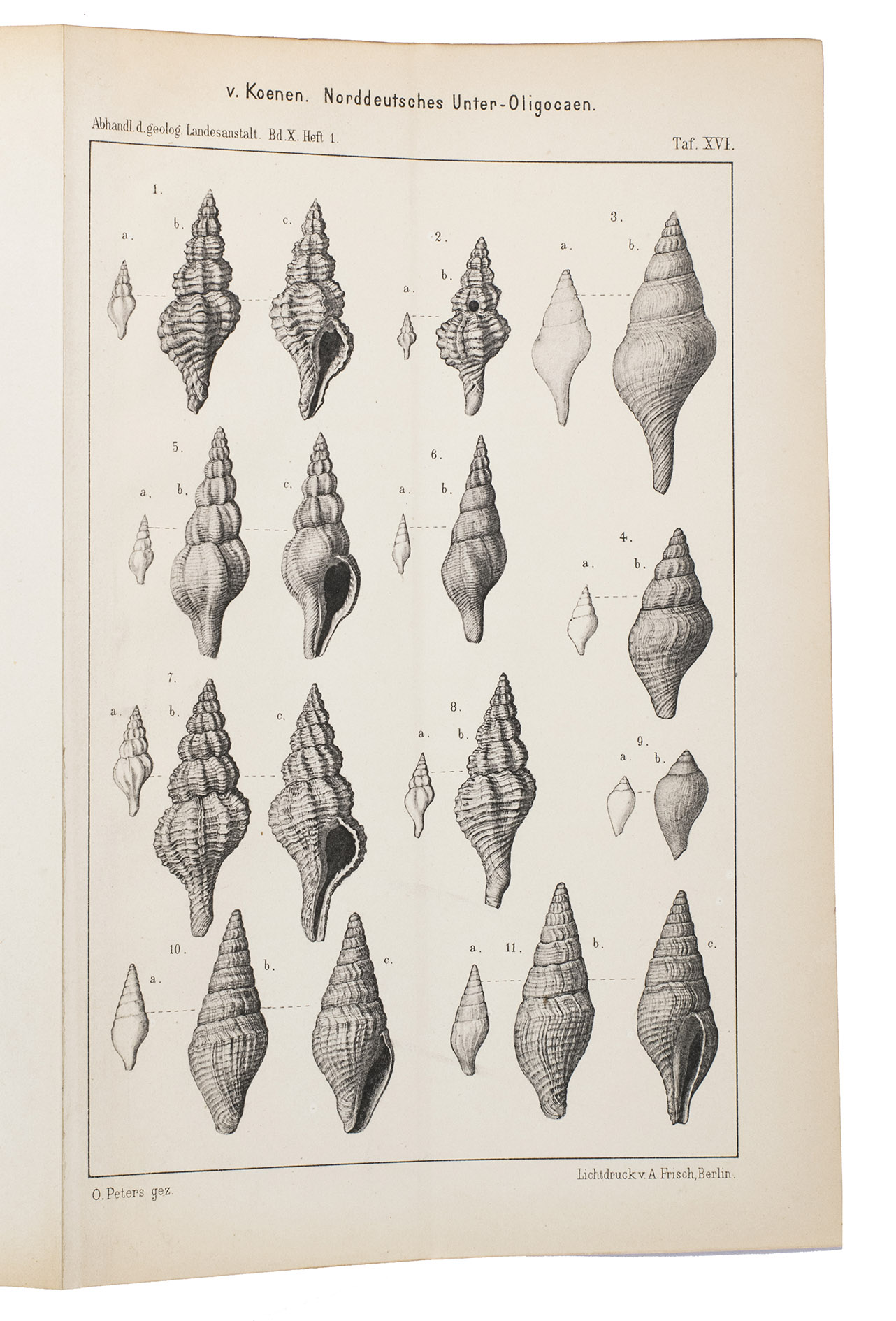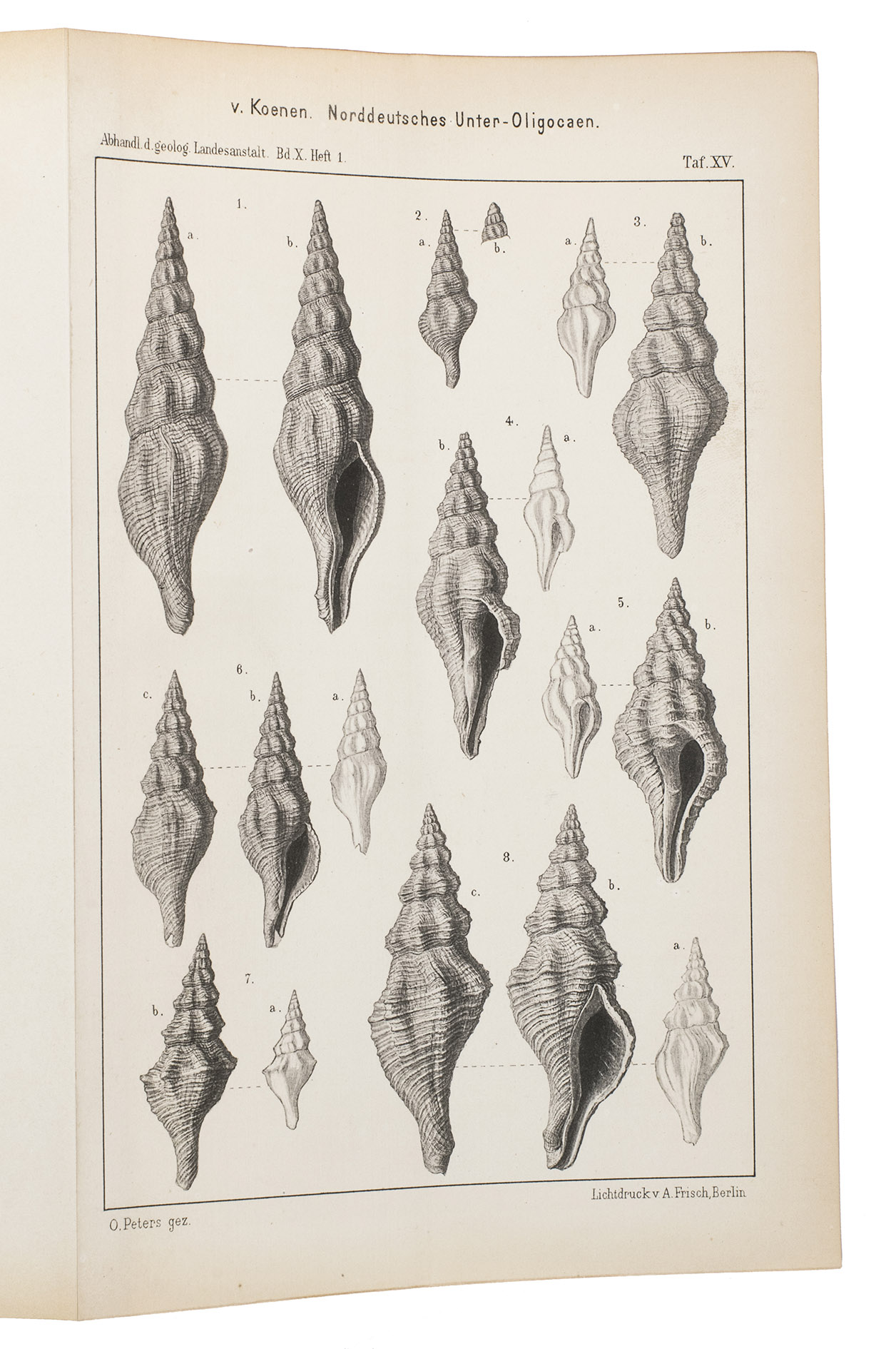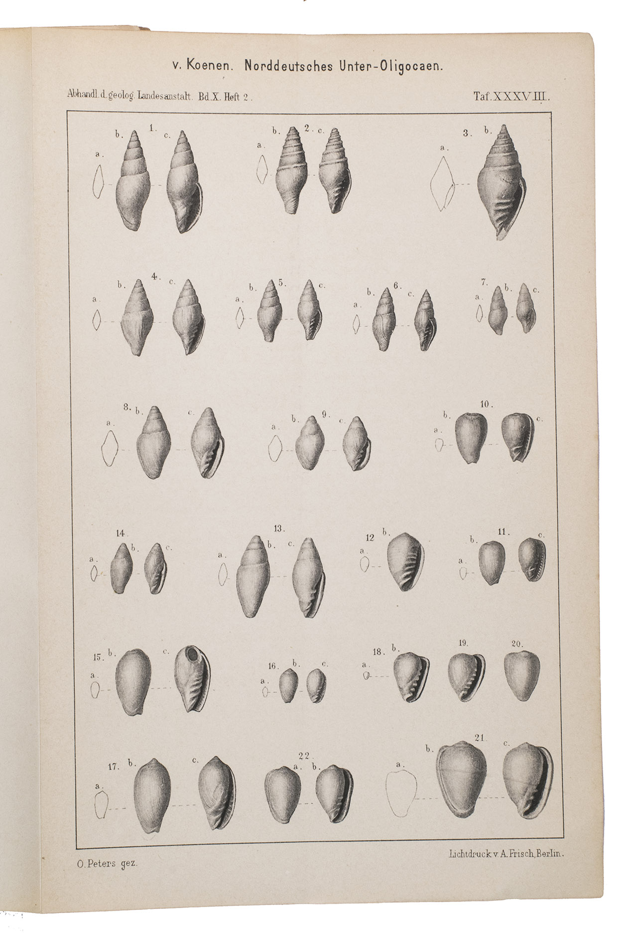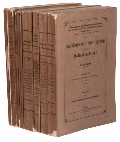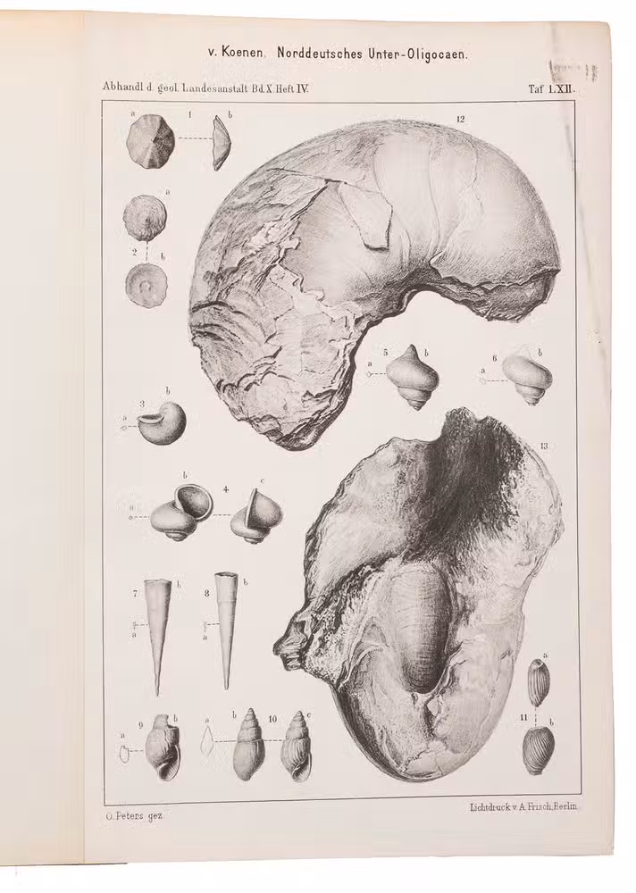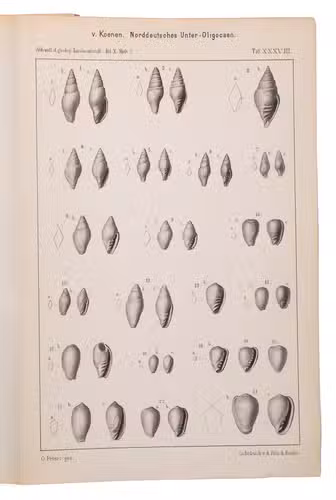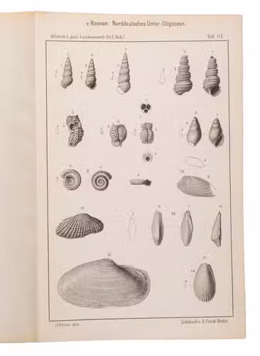 Richly illustrated scientific work written by Adolf von Koenen (1837-1915), which deals with the mollusks of the Lower Oligocene in northern Germany. It was published by the Royal Prussian Geological Survey as a part of the Abhandlungen zur geologischen Specialkarte von Preussen und den Thüringischen Staaten. Band X, Heft 1-7. The work examines various families of marine gastropods, including Strombidae, Muricidae, Buccinidae, Naticidae, Pyramidellidae, Eulimidae, Cerithidae, and Turritellidae. The work is divided into several volumes and contains detailed descriptions and illustrations of the mollusk species. It is an important source for research into the paleontology of the North German Lower Oligocene and the evolution of mollusks in this region.