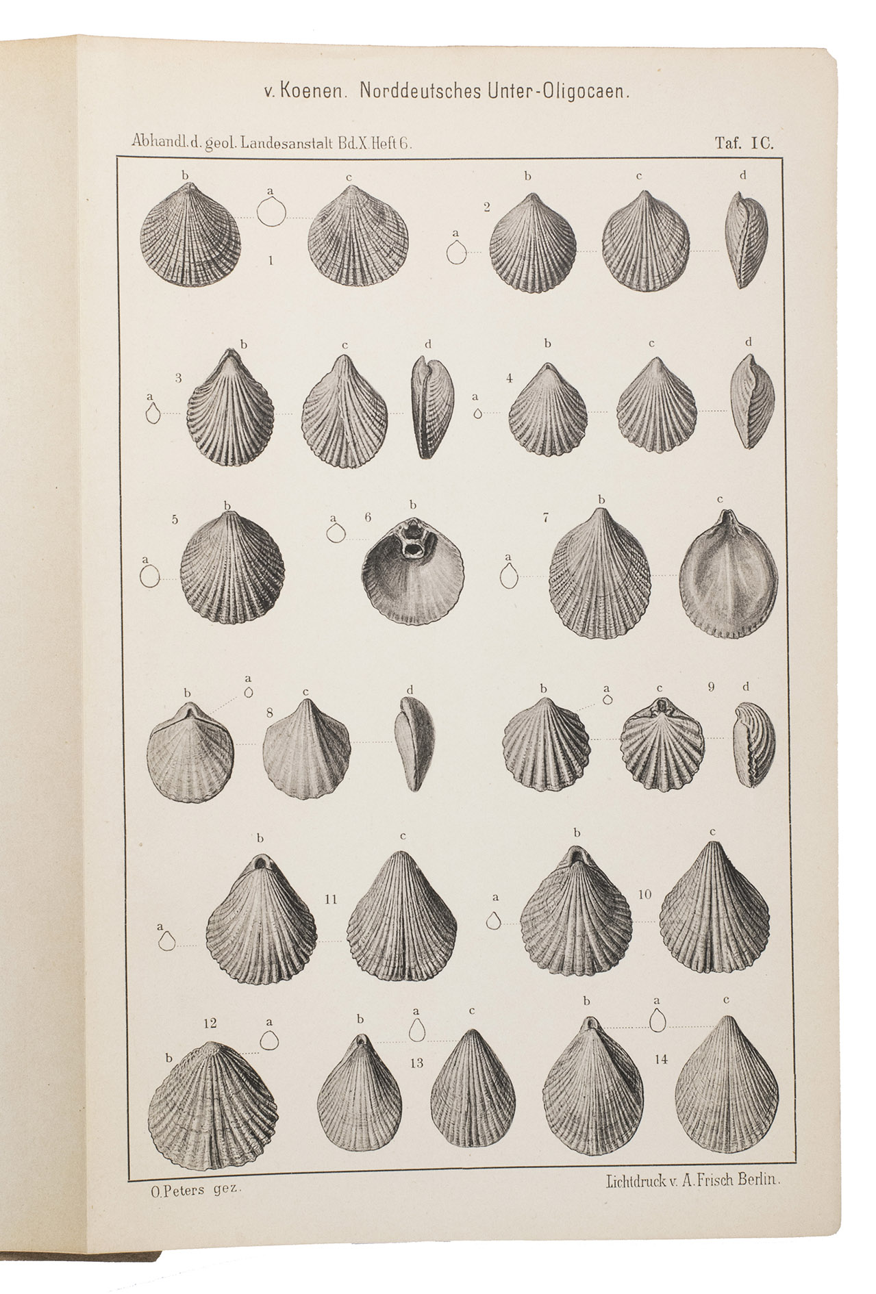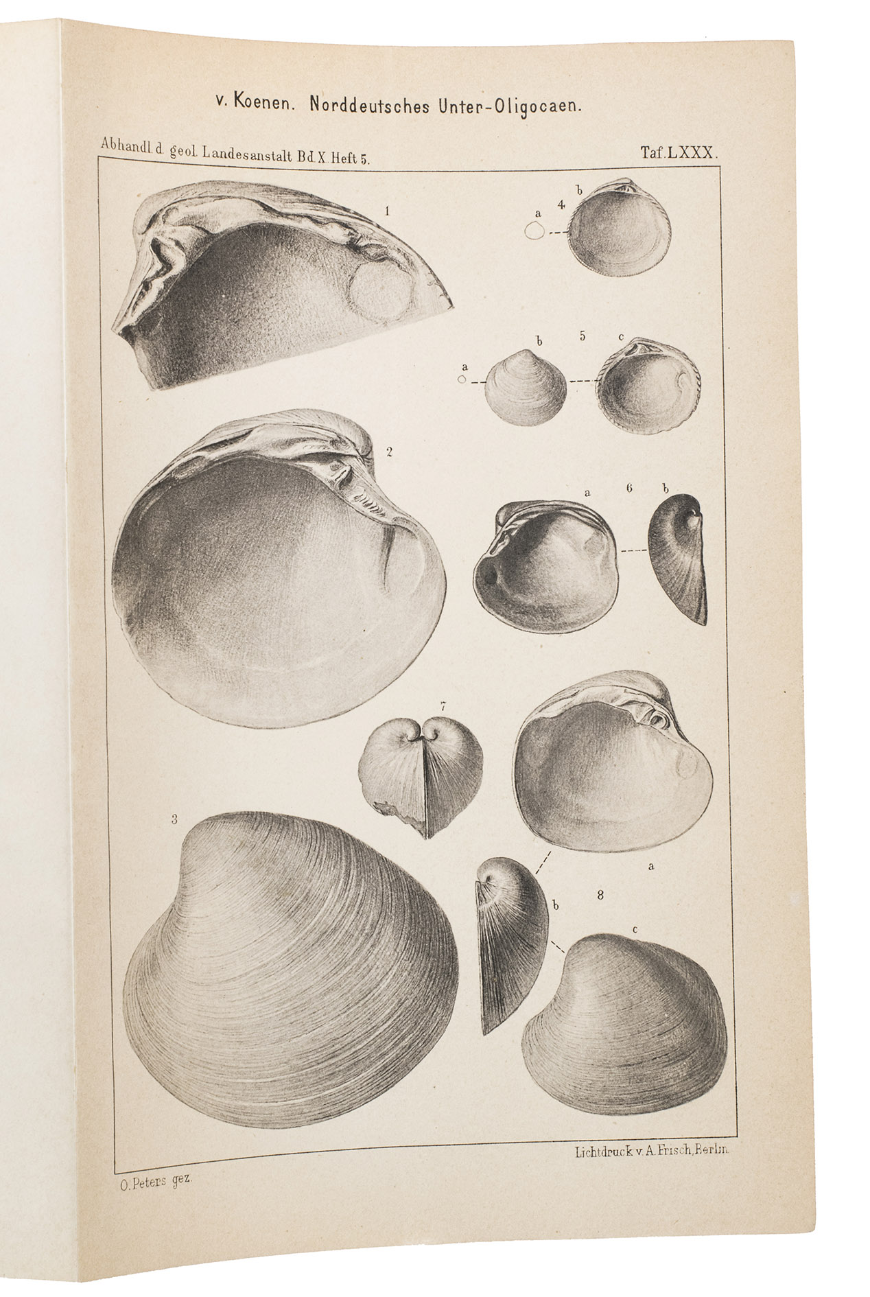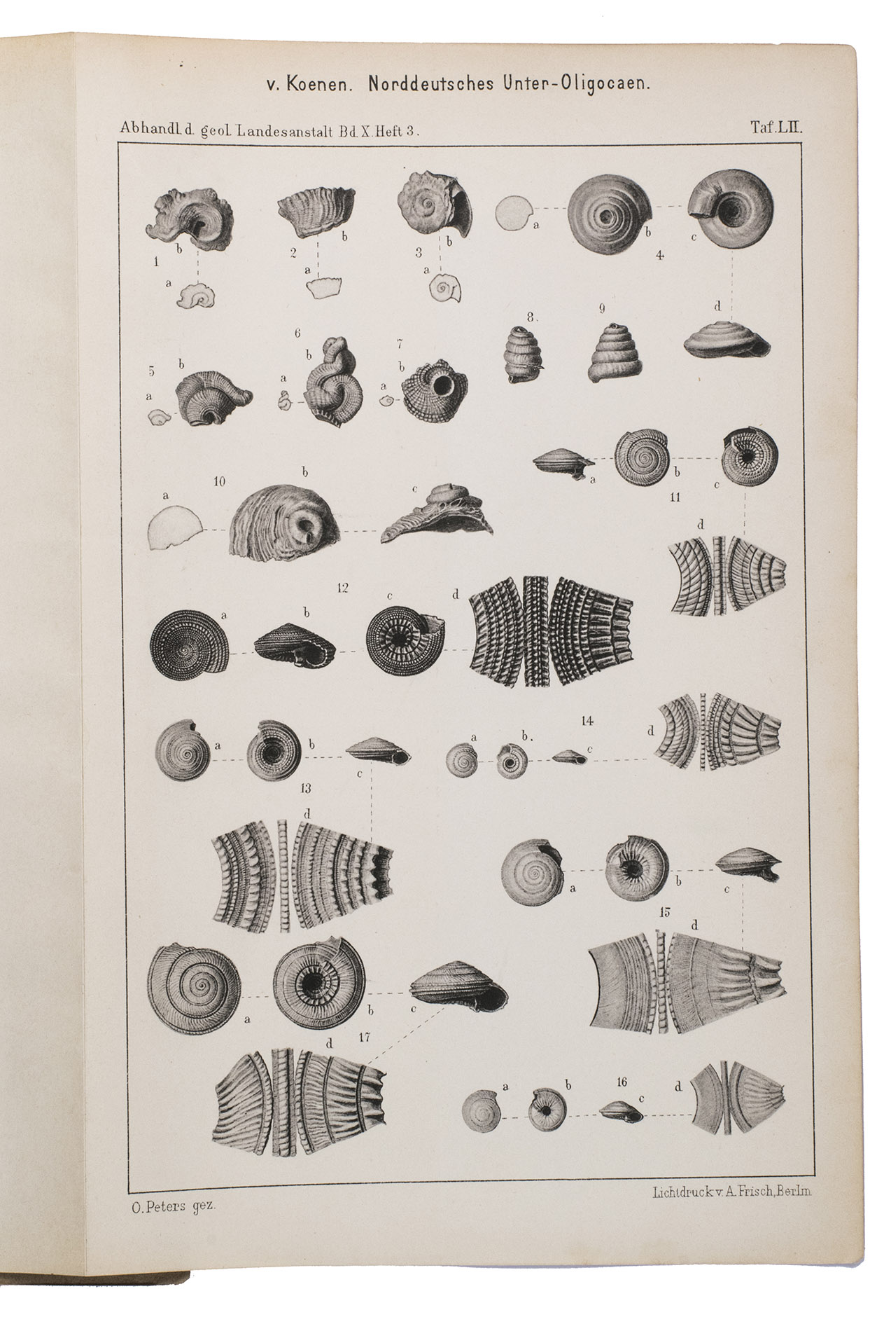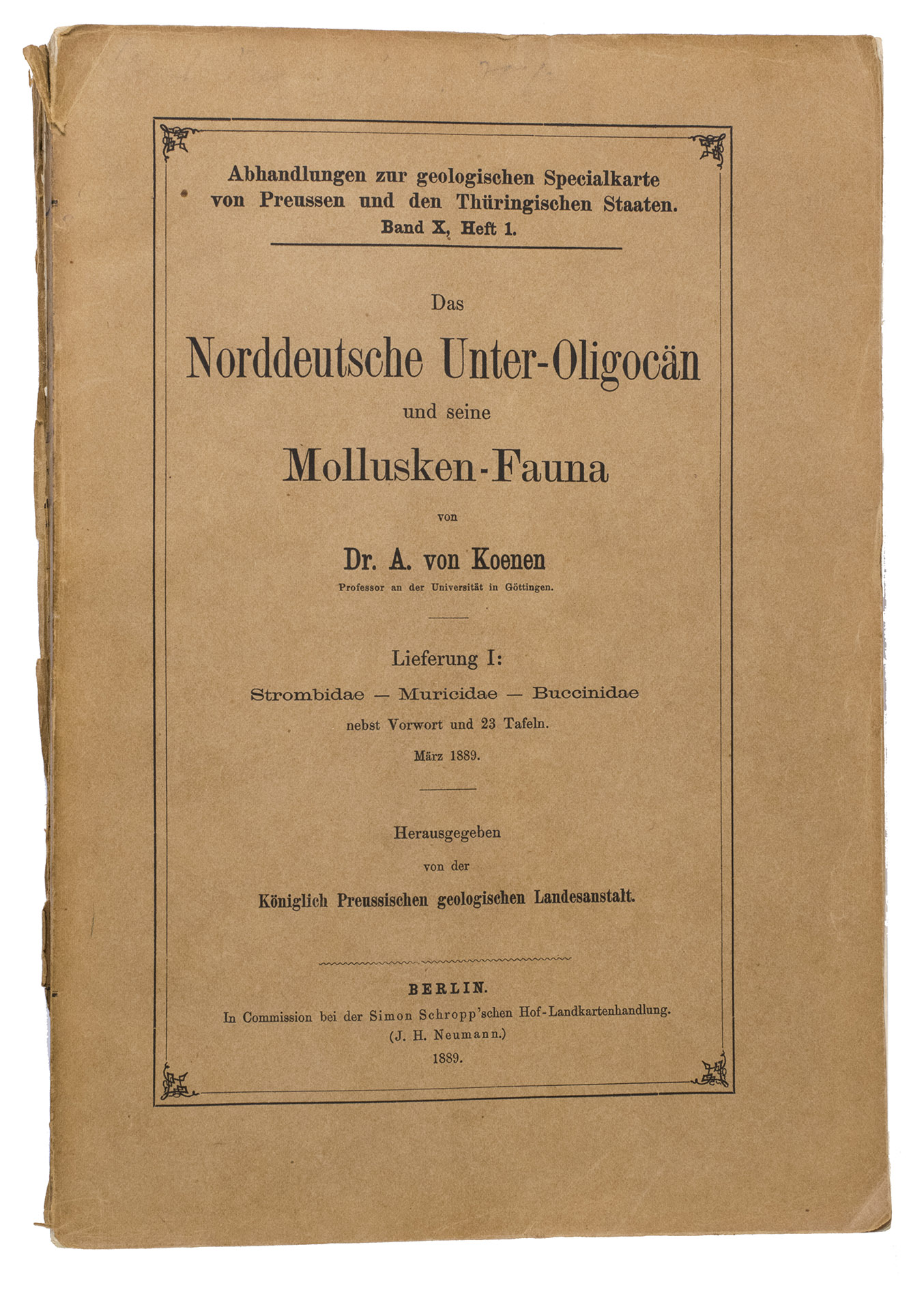 Richly illustrated scientific work written by Adolf von Koenen (1837-1915), which deals with the mollusks of the Lower Oligocene in northern Germany. It was published by the Royal Prussian Geological Survey as a part of the Abhandlungen zur geologischen Specialkarte von Preussen und den Thüringischen Staaten. Band X, Heft 1-7. The work examines various families of marine gastropods, including Strombidae, Muricidae, Buccinidae, Naticidae, Pyramidellidae, Eulimidae, Cerithidae, and Turritellidae. The work is divided into several volumes and contains detailed descriptions and illustrations of the mollusk species. It is an important source for research into the paleontology of the North German Lower Oligocene and the evolution of mollusks in this region.