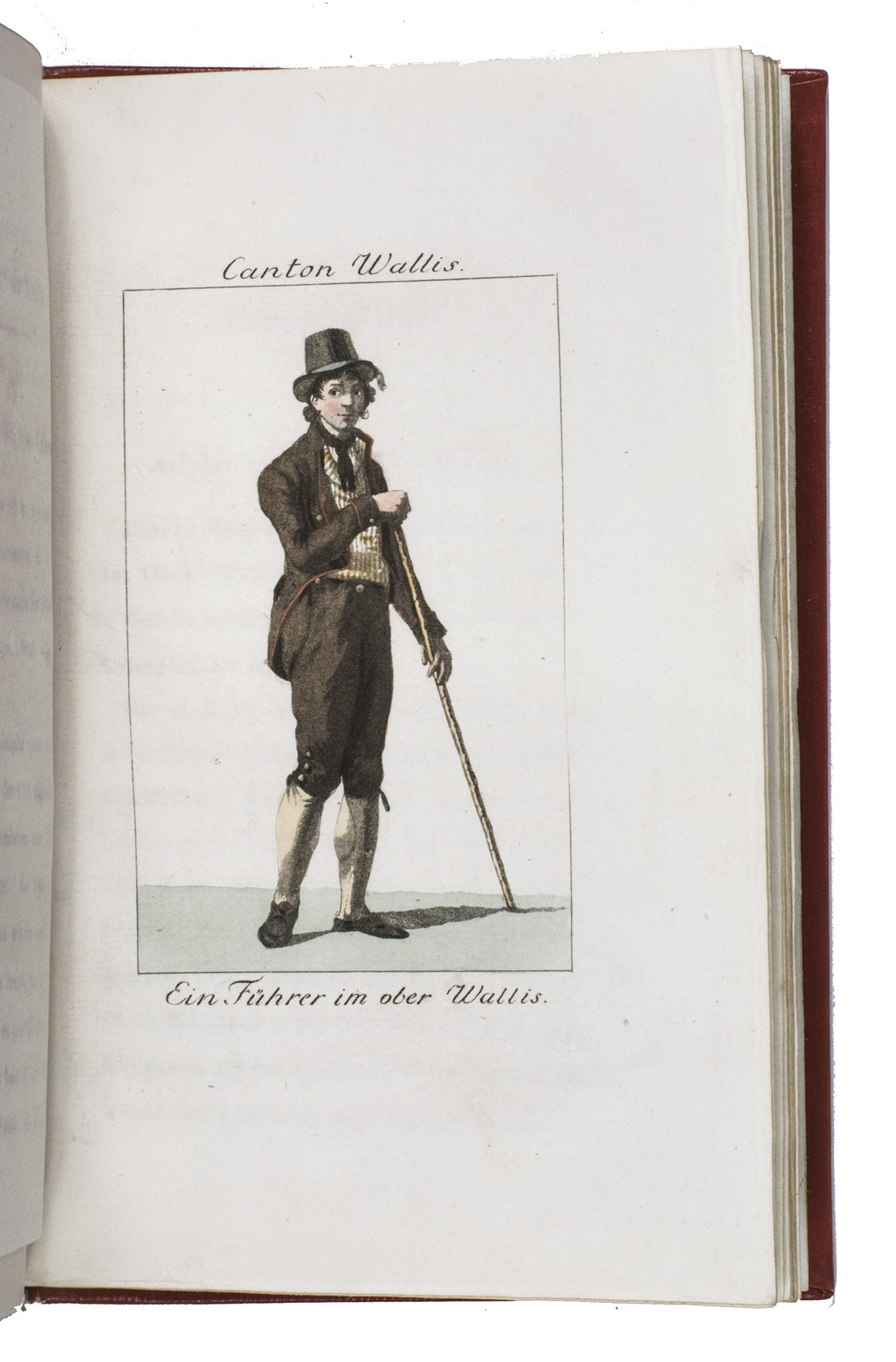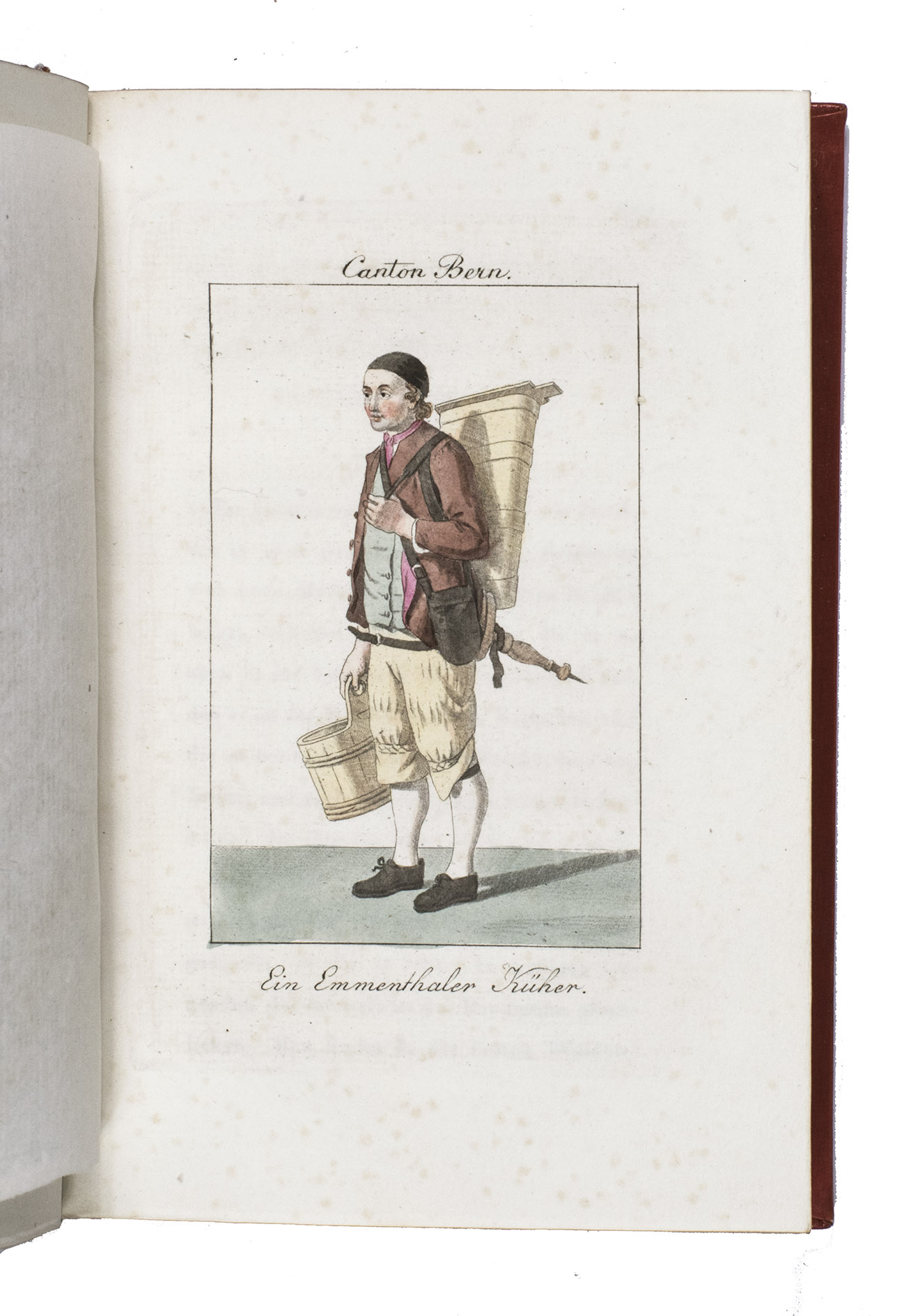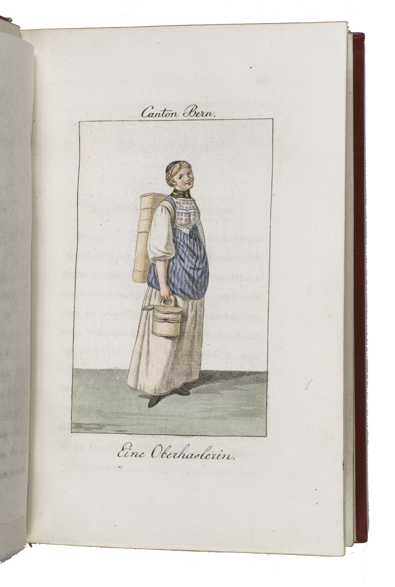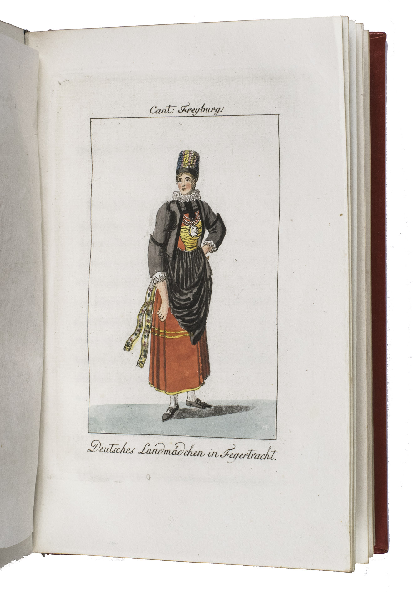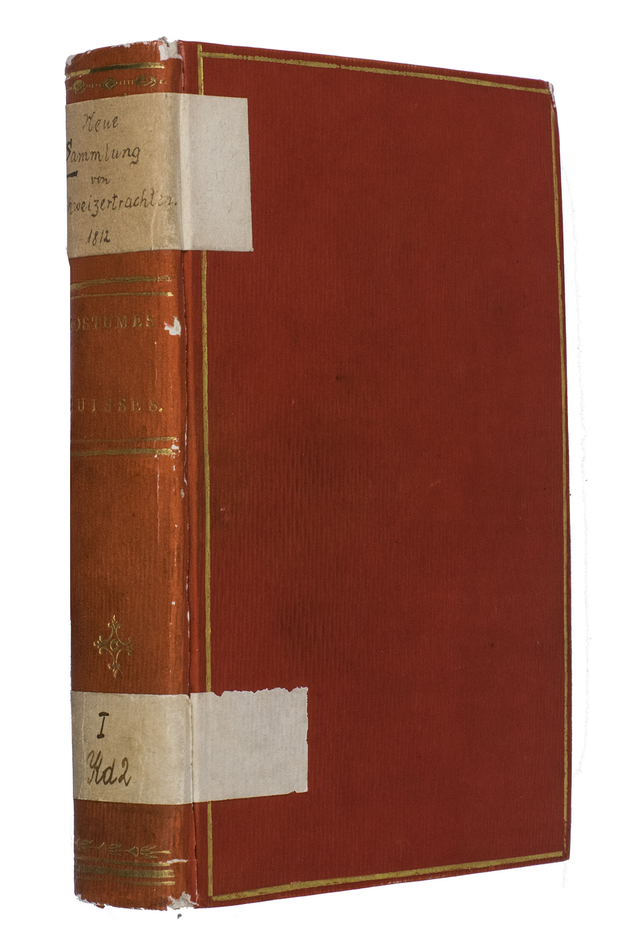 Zürich, bey Orell, Füssli und Comp., [ca. 1818]. Small 8vo. With 60 engraved plates of Swiss costumes, separated by tissue paper guards, all beautifully coloured by hand. Contemporary gold-tooled red paper 223, [4] pp.