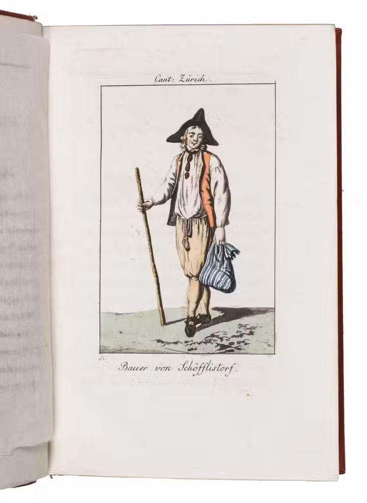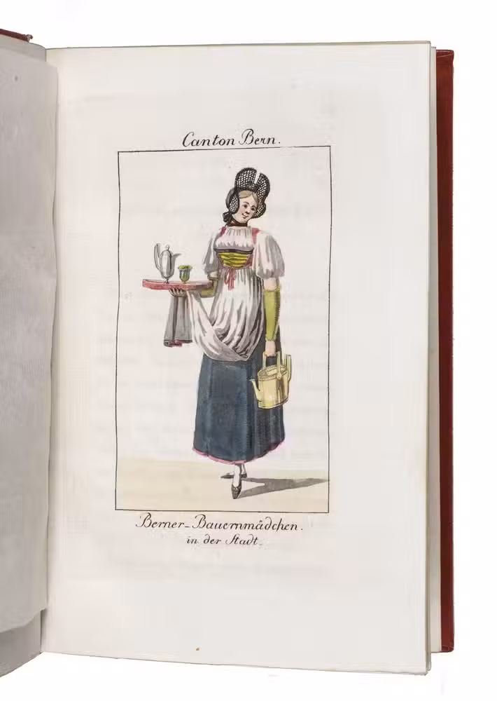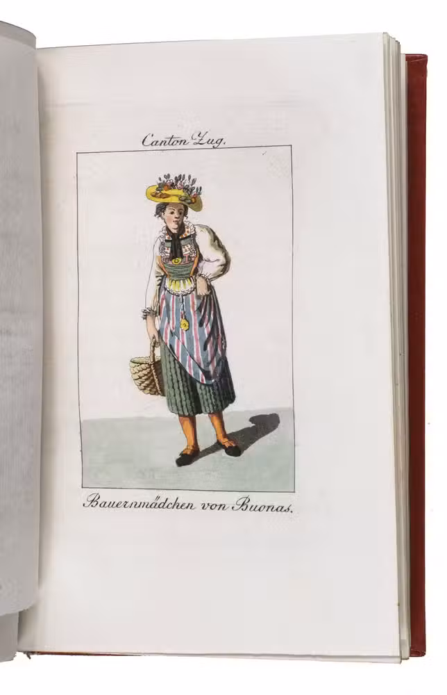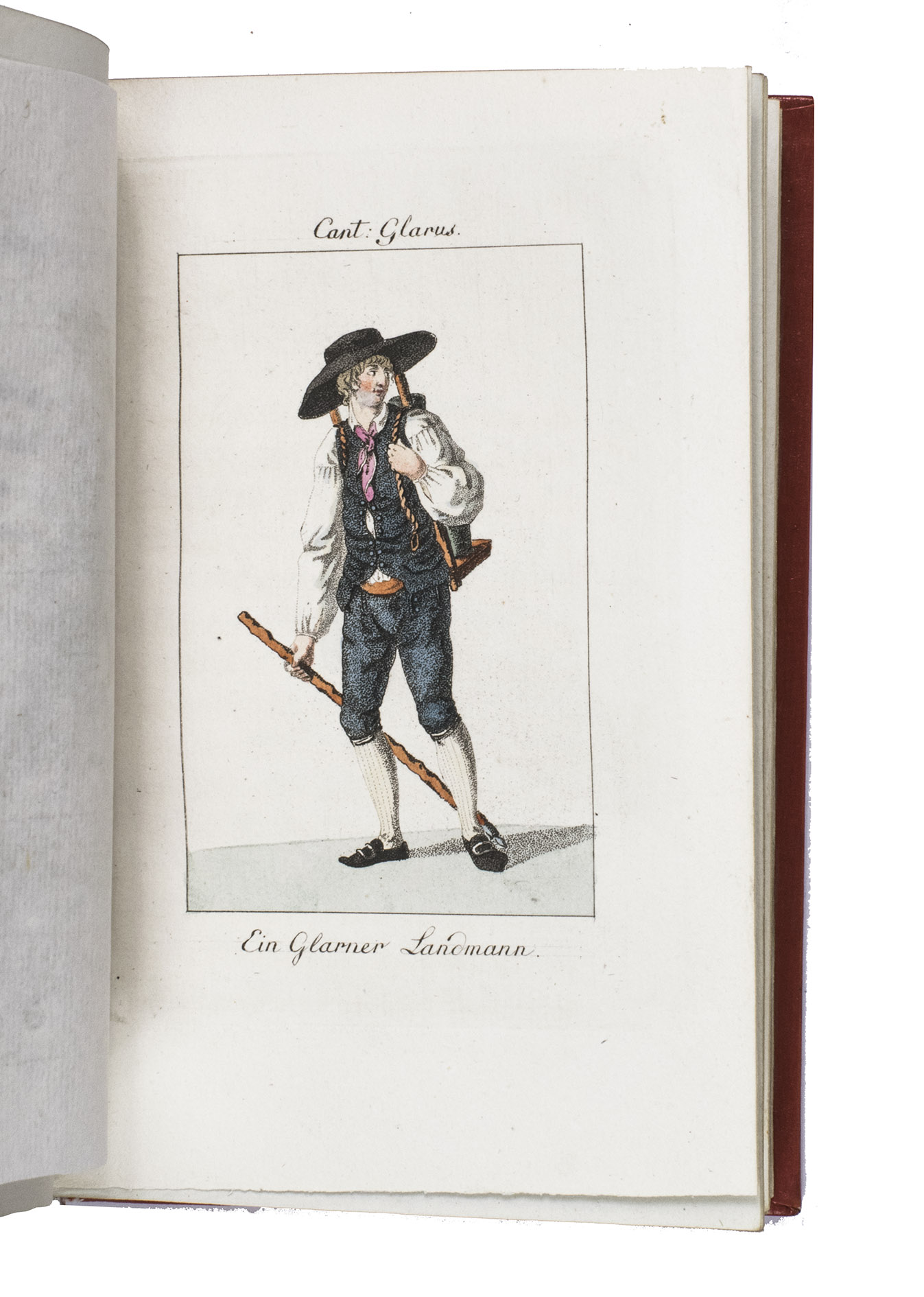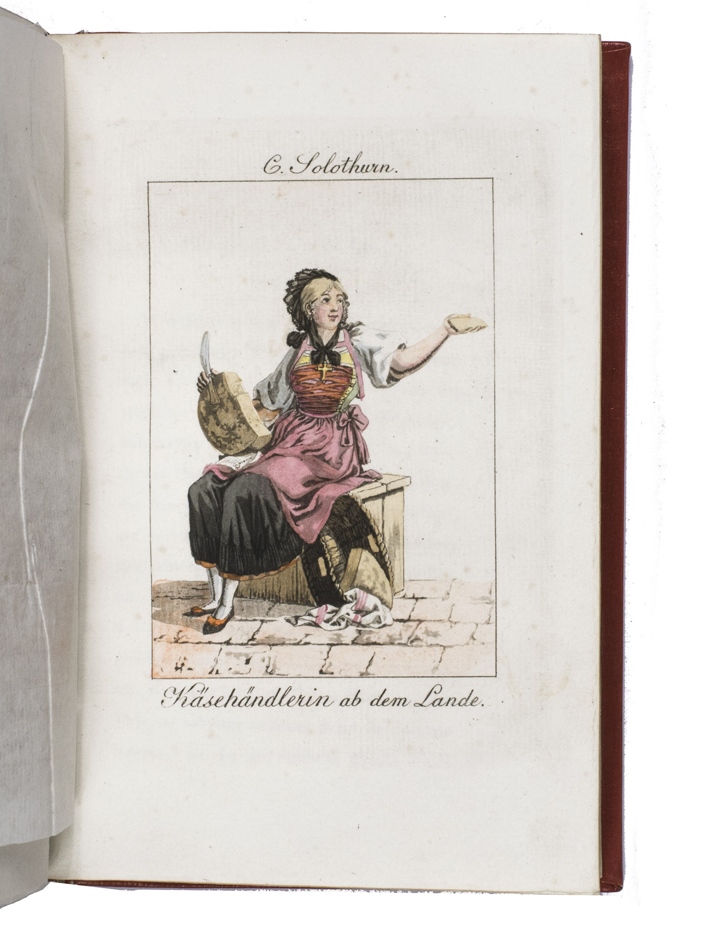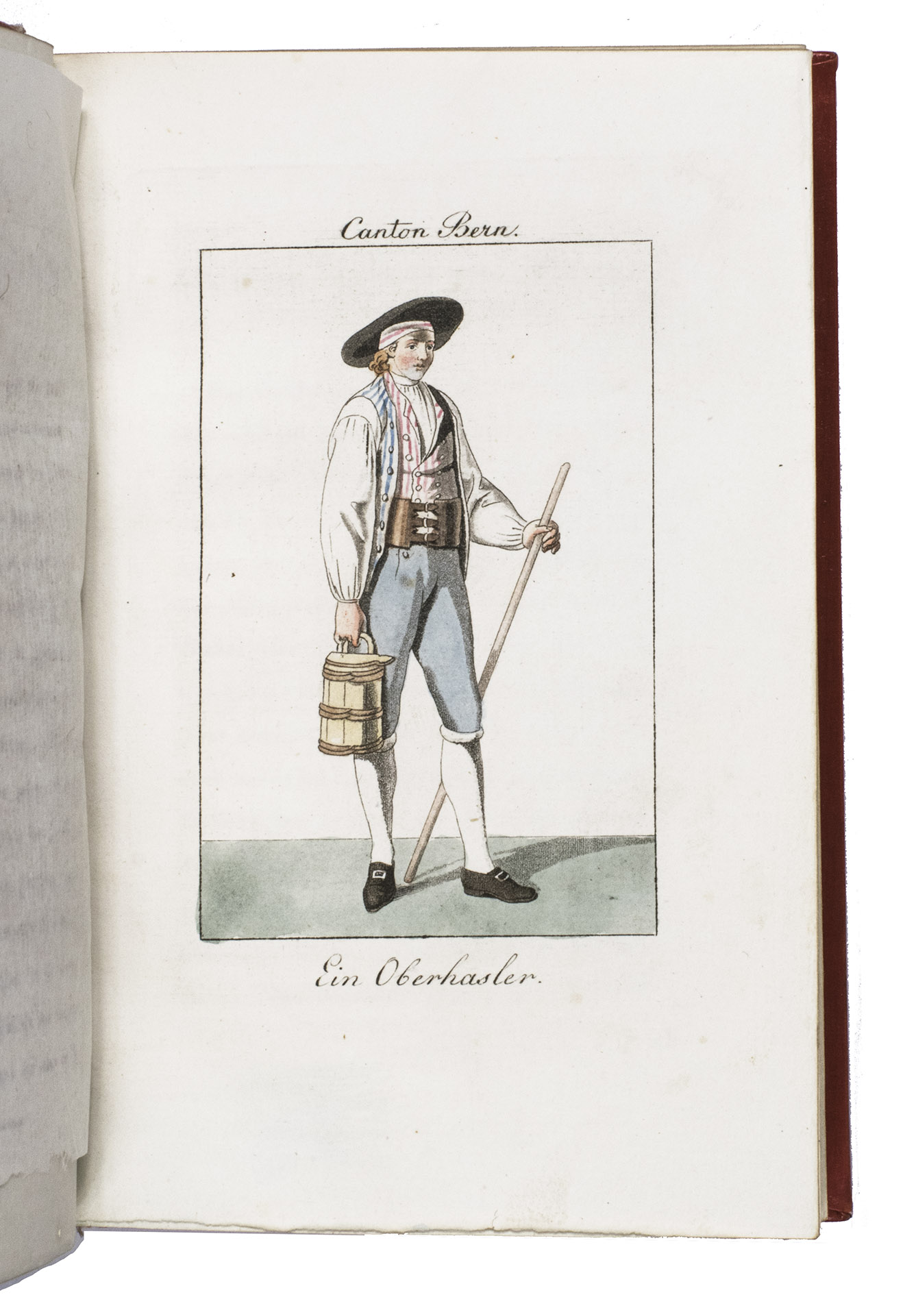 Zürich, bey Orell, Füssli und Comp., [ca. 1818]. Small 8vo. With 60 engraved plates of Swiss costumes, separated by tissue paper guards, all beautifully coloured by hand. Contemporary gold-tooled red paper 223, [4] pp.
