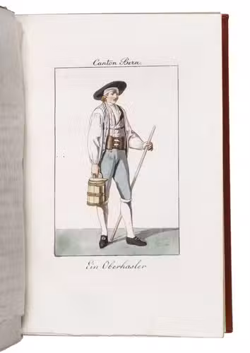 Beautiful costume book, depicting costumes from the 22 Swiss cantons in 60 hand coloured full-page plates. The plates are engraved by Franz Niklaus König (1765-1832), and Gabriel Lory (1763-1840). Especially König was a well-known and respected artist in his time, who started his independent career in 1768 with engraved Swiss costume plates. According to Thieme-Becker, most of the present plates were first published from 1801 in the Helvetischen Almanach.