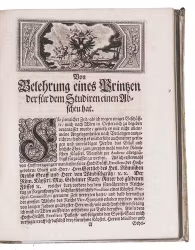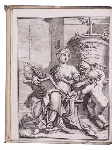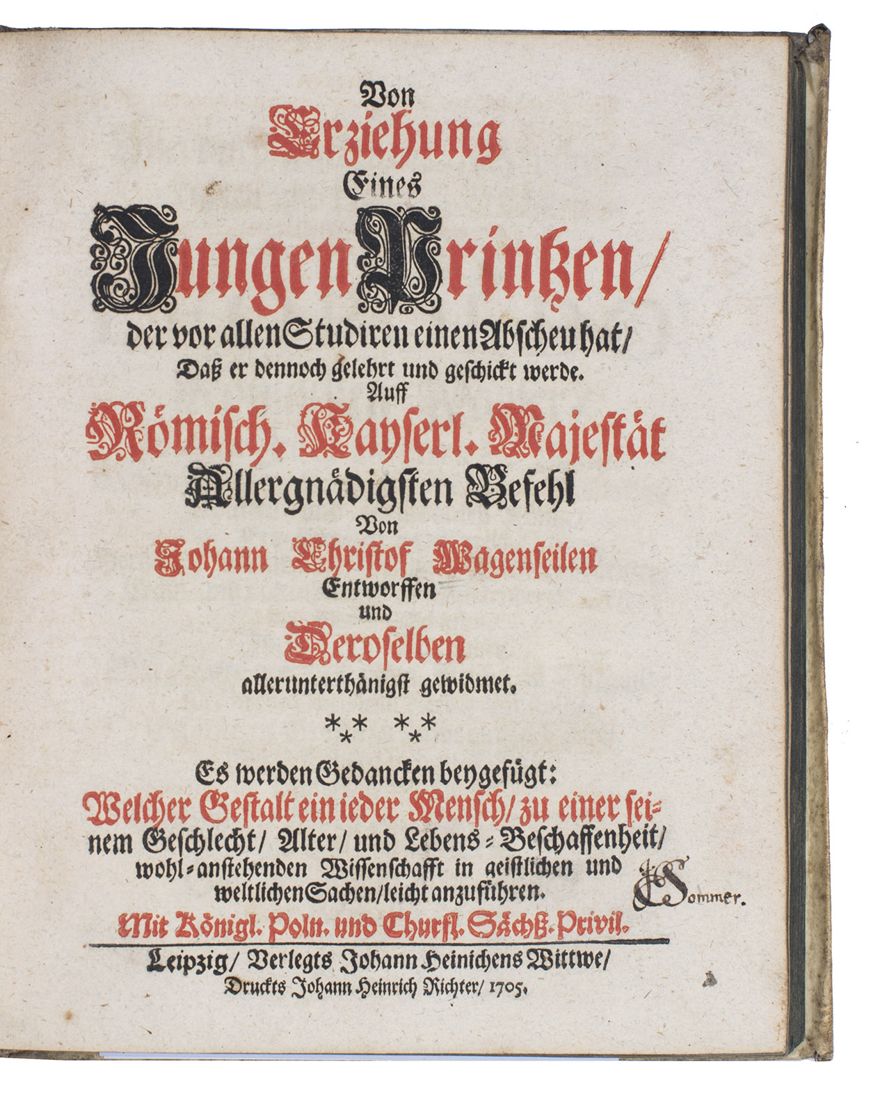With: (2) WAGENSEIL, Johann Christoph. Erziehung eines jungen Prinzen, der vor allen studieren einen Abscheu hat, dass er dennoch gelehrt und geschickt werde. Leipzig, Johann Heinichens Wittwe, 1705. With title-page printed in red and black and fine engraved headpiece to the text. 2 works in 1 volume. 4to. Contemporary vellum. [88], 296, [24] pp.