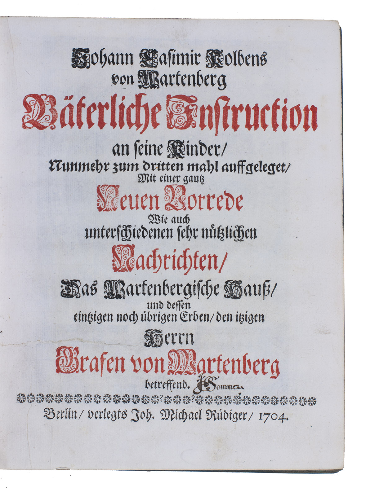 The first is the third edition of fatherly instructions to his children by the German nobleman Johann Casimir Kolbe von Wartenberg (1584-1661), originally written in 1650 and first published posthumously in 1674. Johann Michael Rüdiger added the valuable preface for the 1696 Cologne edition, dedicated to the 8 year old prince, later King Friedrich Wilhelm I of Prussia. The present edition includes all original prefaces and a new one, and adds a genealogy of the House of Kolbe von Wartenberg by Georg Helwich.