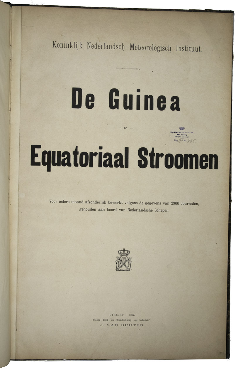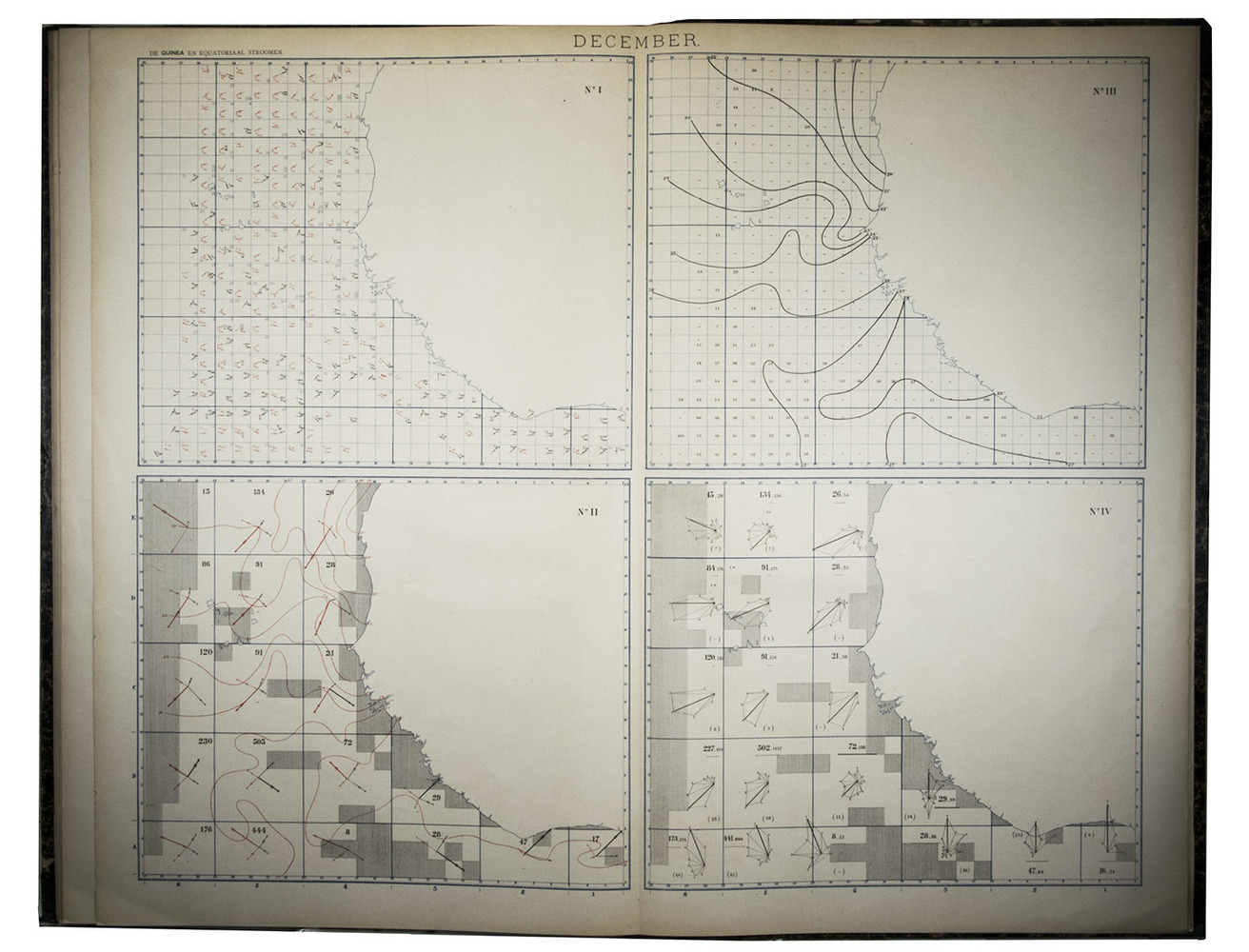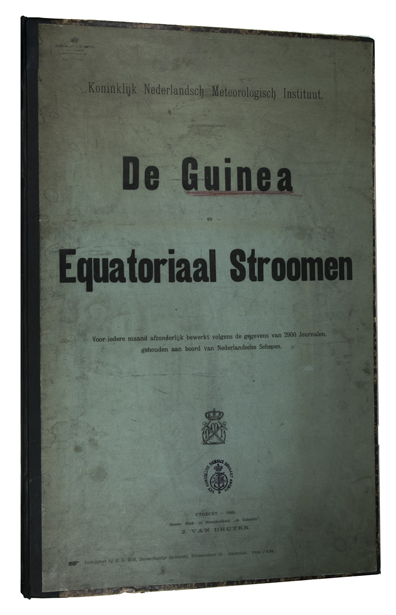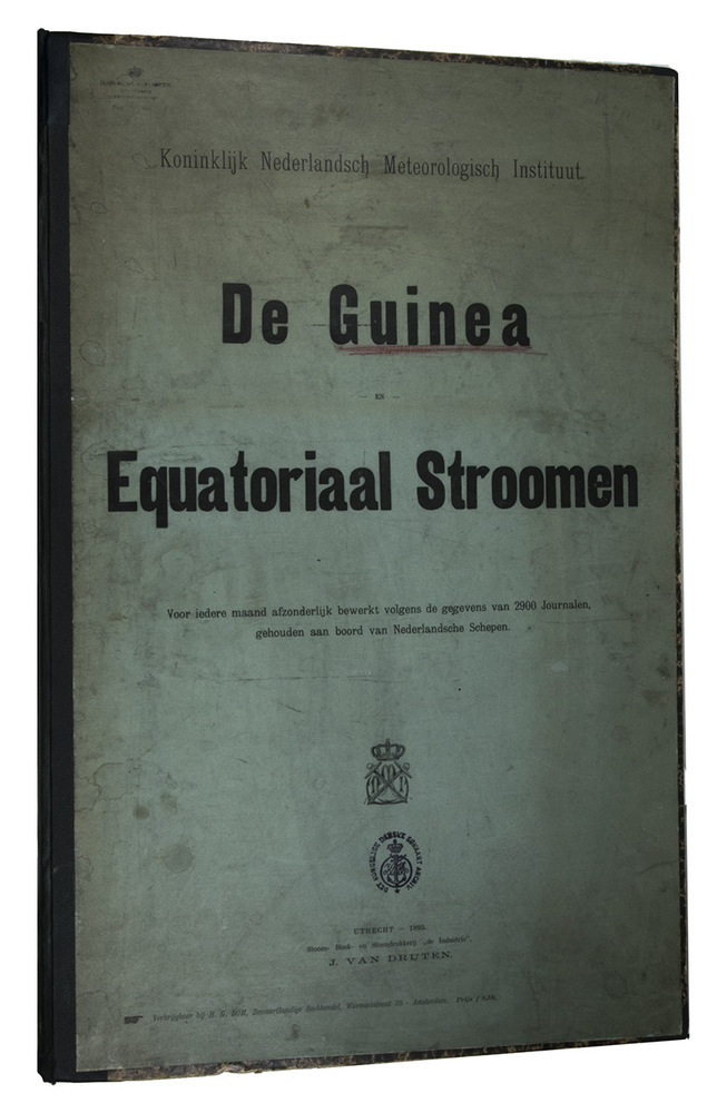 Utrecht, printed by stoom-, boek- en steendrukkerij "De Industrie", J. van Druten for the KNMI, 1895. Folio (58 x 36,5 cm). With 24 double-page charts of the currents in the Gulf of Guinea off the West-African coast, 2 charts for each month, printed in blue, black and red. Half buckram and marbled paper over boards. [1], [1 blank], [1], [1 blank], [3], [1 blank] pp. and 24 double page charts.