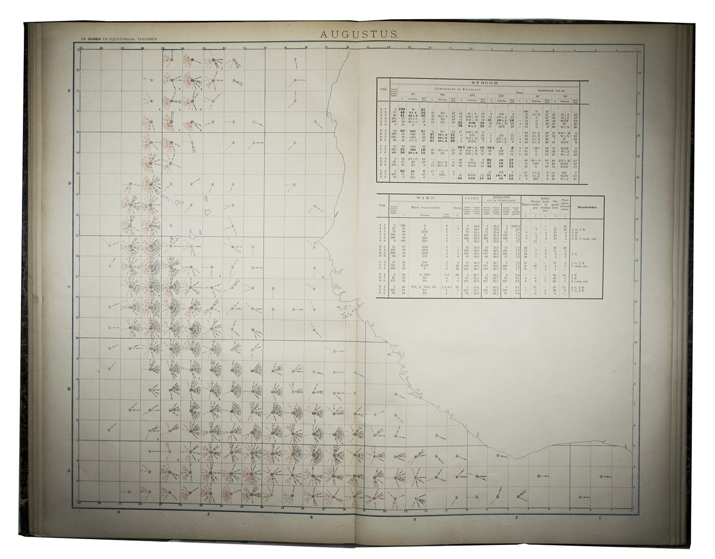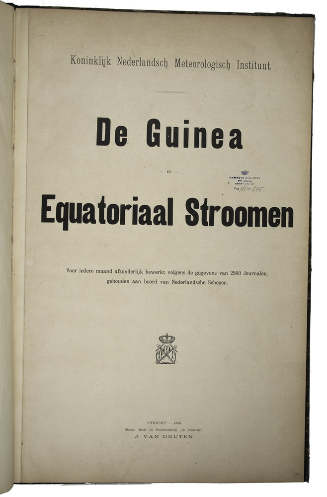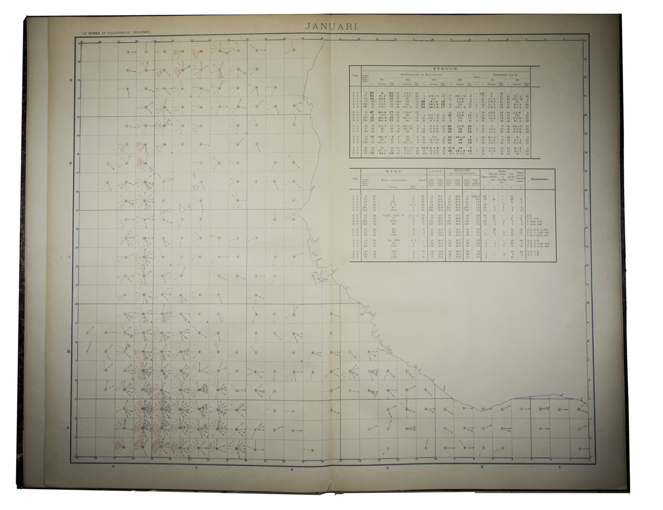 Utrecht, printed by stoom-, boek- en steendrukkerij "De Industrie", J. van Druten for the KNMI, 1895. Folio (58 x 36,5 cm). With 24 double-page charts of the currents in the Gulf of Guinea off the West-African coast, 2 charts for each month, printed in blue, black and red. Half buckram and marbled paper over boards. [1], [1 blank], [1], [1 blank], [3], [1 blank] pp. and 24 double page charts.