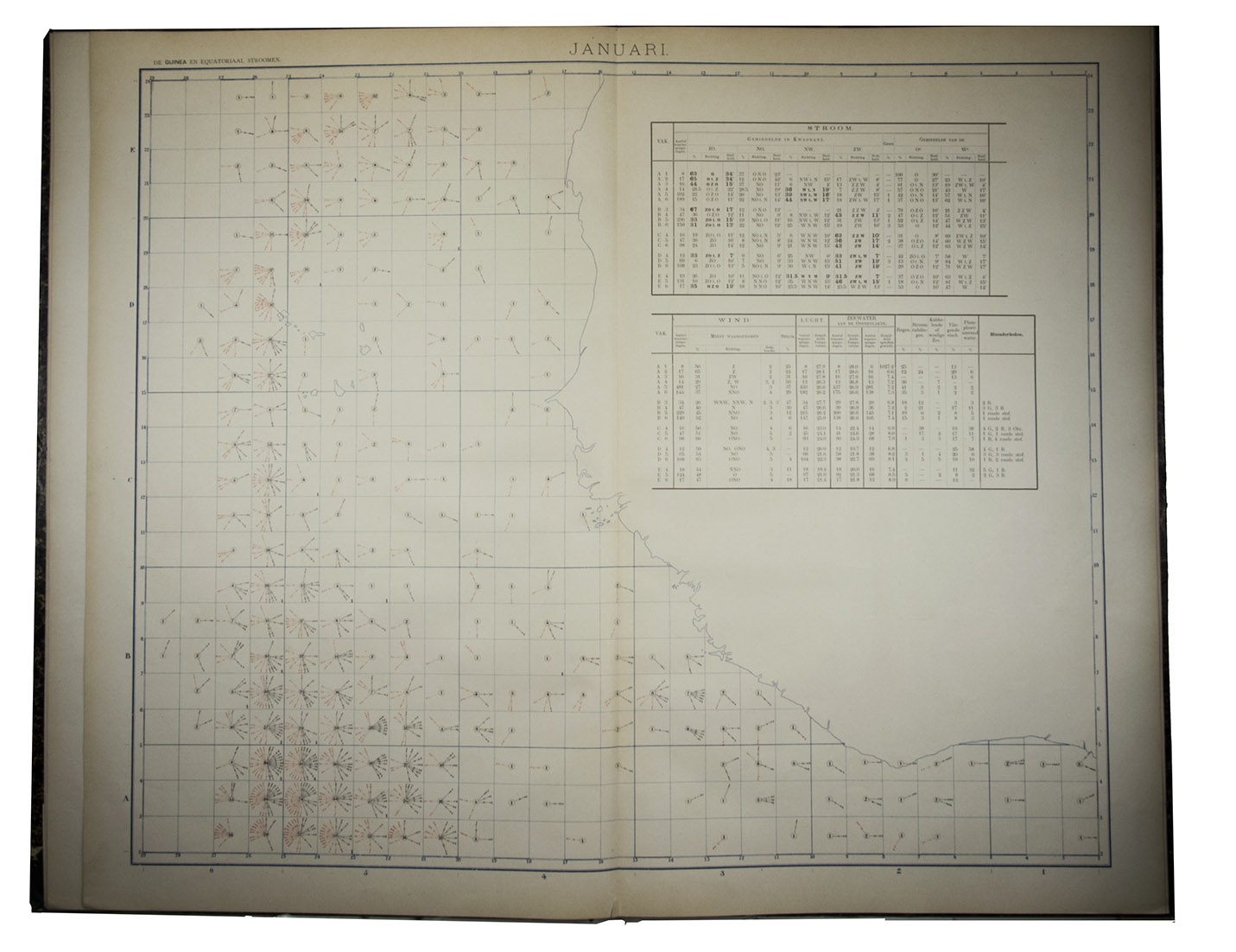 First and only edition of this collection of 24 charts of the monthly currents in the Gulf of Guinea and around the equator, off the coast of West-Africa. There are 2 charts for every month. The first of the two contains observations of the currents for every square degree, with a distinction between the Guinea-current (which principal direction is east, printed in black) and the Equatorial-current (which principal direction is west, printed in red), and tables containing relevant information on, for example, the wind and temparature of the seawater. The second chart actually contains four smaller charts that are more detailed and show the currents under the influence of wind and other variables. The 24 charts are prefaced by a short introduction by P.F. Heerdt and a three page detailed explanation of the charts and their functions. All text is printed in Dutch and in French, any text in the charts themselves are only in Dutch.