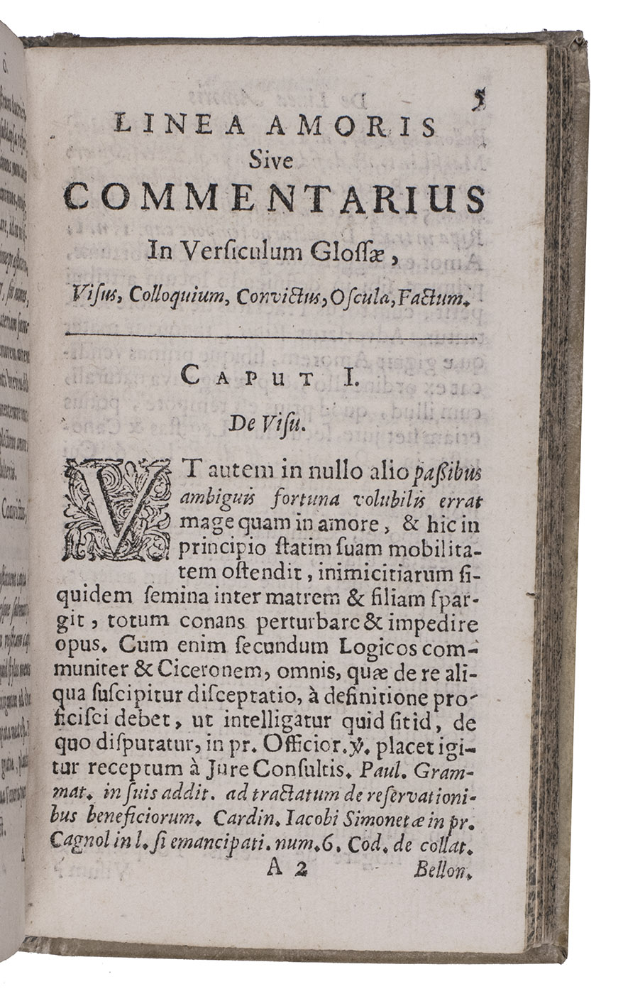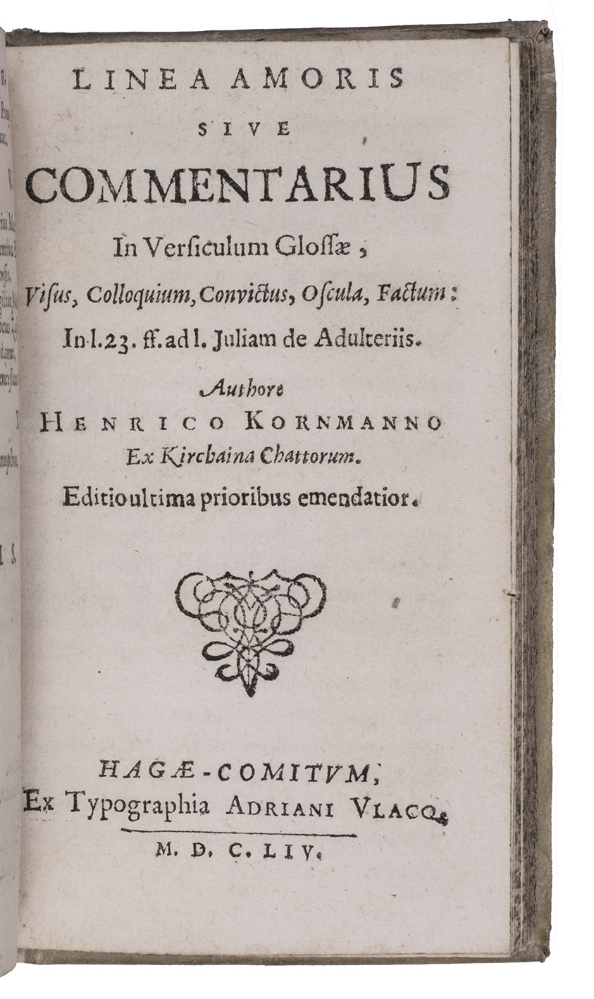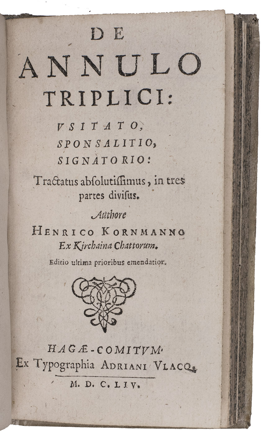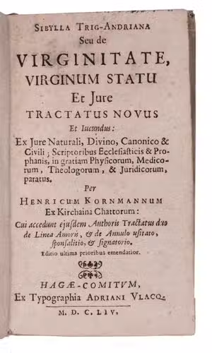 Rare first complete Netherlands edition of three curious Latin works on women, love and marriage, by Heinrich Kornmann: Sibylla trig-Andriana, De annulo usitato and De linea amoris, published together, at least the first two first published at Frankfurt in 1610. The first discusses the rights and duties of women and their conduct in matters of sex, the second is devoted to rings, including engagement rings and the third is about the commonplace of the five stages of love (sight, conversation, physical contact, kissing and consummation). Kornmann refers to a wide variety of sources, including classical authors and church fathers. He defends women's rights to some degree, but also repeats superstitious beliefs such as that a tree is injured by a virgin's plucking its first fruit. He further discusses incubi and succubi (male and female demons that have sexual relations with humans), astrology and the colour of women's cloths (preferably blue, pink, green and white). Robert Burton refers to De linea amoris in his 1621 Anatomy of melancholy, and all three works enjoyed widespread popularity far into the 18th century. The present edition appears to be the only one with a Netherlands imprint, though a 1631 edition in the STCN, perhaps containing the first work only and giving its place of publication as "Virginopoli" may be Dutch. Kornmann, a lawyer from Kirchhain (Germany), also published several works on miracles. Michaud apparently found Kornmann's discussion of sexual matters too frank, writing in 1818 that he had great erudition, but lacked taste and judgement.
