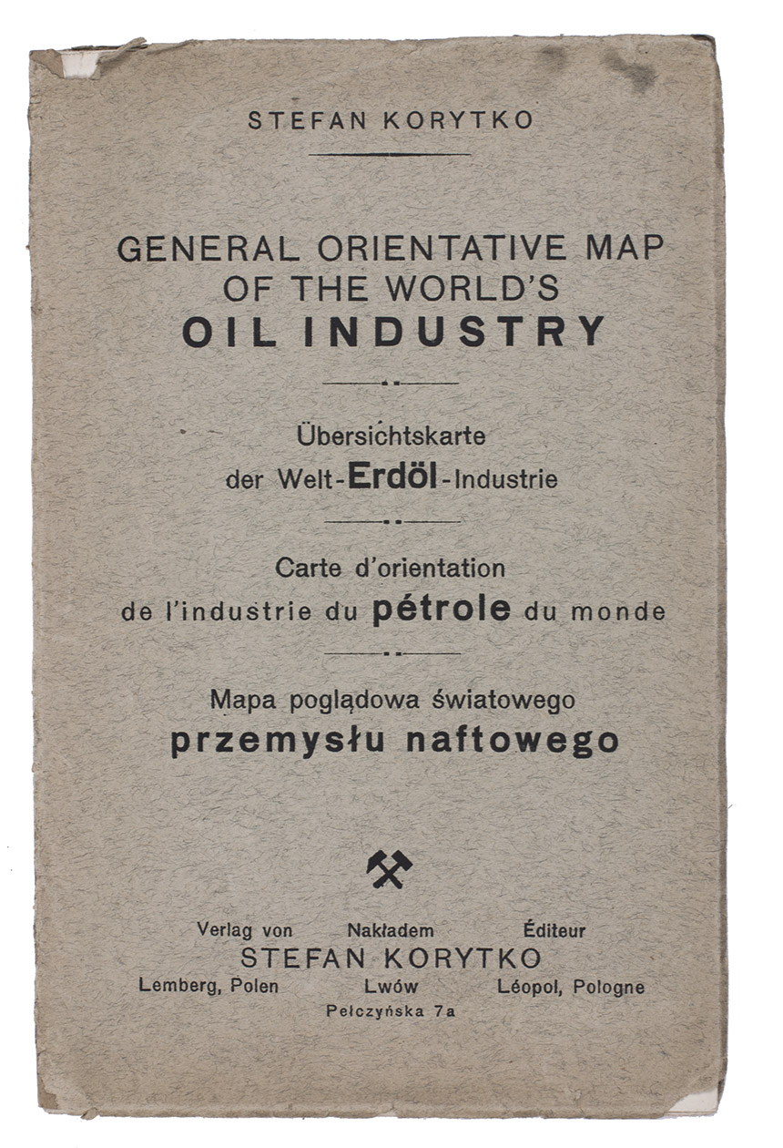 Large folding map of the world, completely in colour, showing the areas containing oil and where oil/gas wells are located. Inserted around the margins of the map are several more detailed inset maps of Europe, Poland, California, Kansas/Oklahoma/Texas, Mexico, Venezuela, Trinidad, Apscheron (Azerbeidzjan), Sumatra, Japan, Egypt and Borneo. Also included is a large diagram illustrating the world's oil production, from 1860 to 1924.