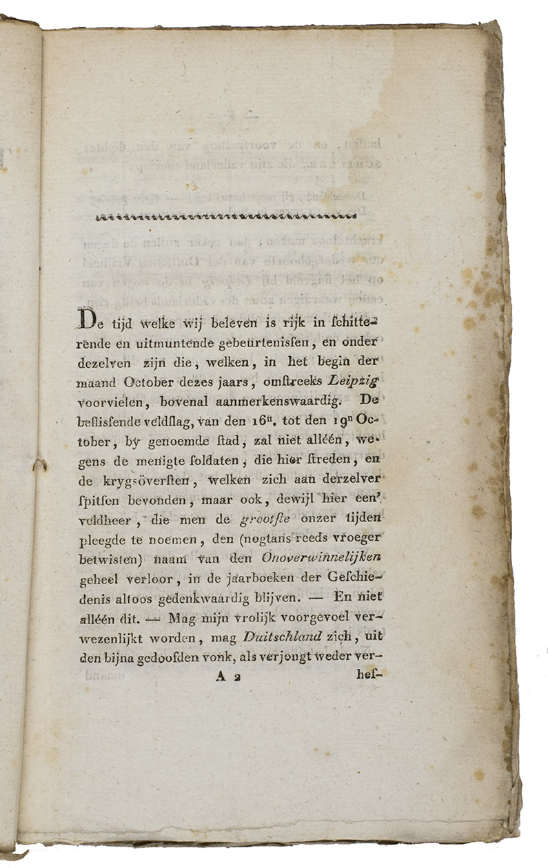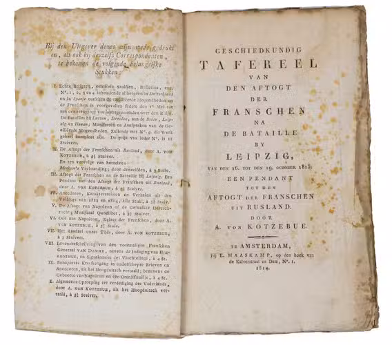 Dutch translation of an account of the Battle of Leipzig in October 1813 and the subsequent French retreat, attributed to the German dramatist and diplomat August von Kotzebue (1761-1819). Originally published anonymously as Der Rückzug der Franzosen nach der Schlacht bei Leipzig and possibly printed in Russia, the pamphlet was presented as a companion piece to an account of the French retreat from Russia in 1812 which was also translated and published by Maaskamp.