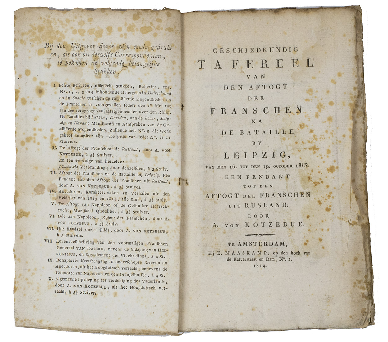 With Amsterdam and most of the Netherlands abandoned by the French, the publisher Maaskamp (1769-1834) published numerous accounts of the recent events, listed on the inside of the wrapper, that had led to the French retreat all over Europe. The author of the pamphlet appears to have been a Saxon living in Leipzig as well as an enthusiastic German patriot, which seems to disqualify the attribution to Kotzebue, who was mostly pro-Russian and would ultimately be murdered for ridiculing German nationalism. Nevertheless, the author shares Kotzebue's low opinion of the French bulletins, which he portrays as full of air.