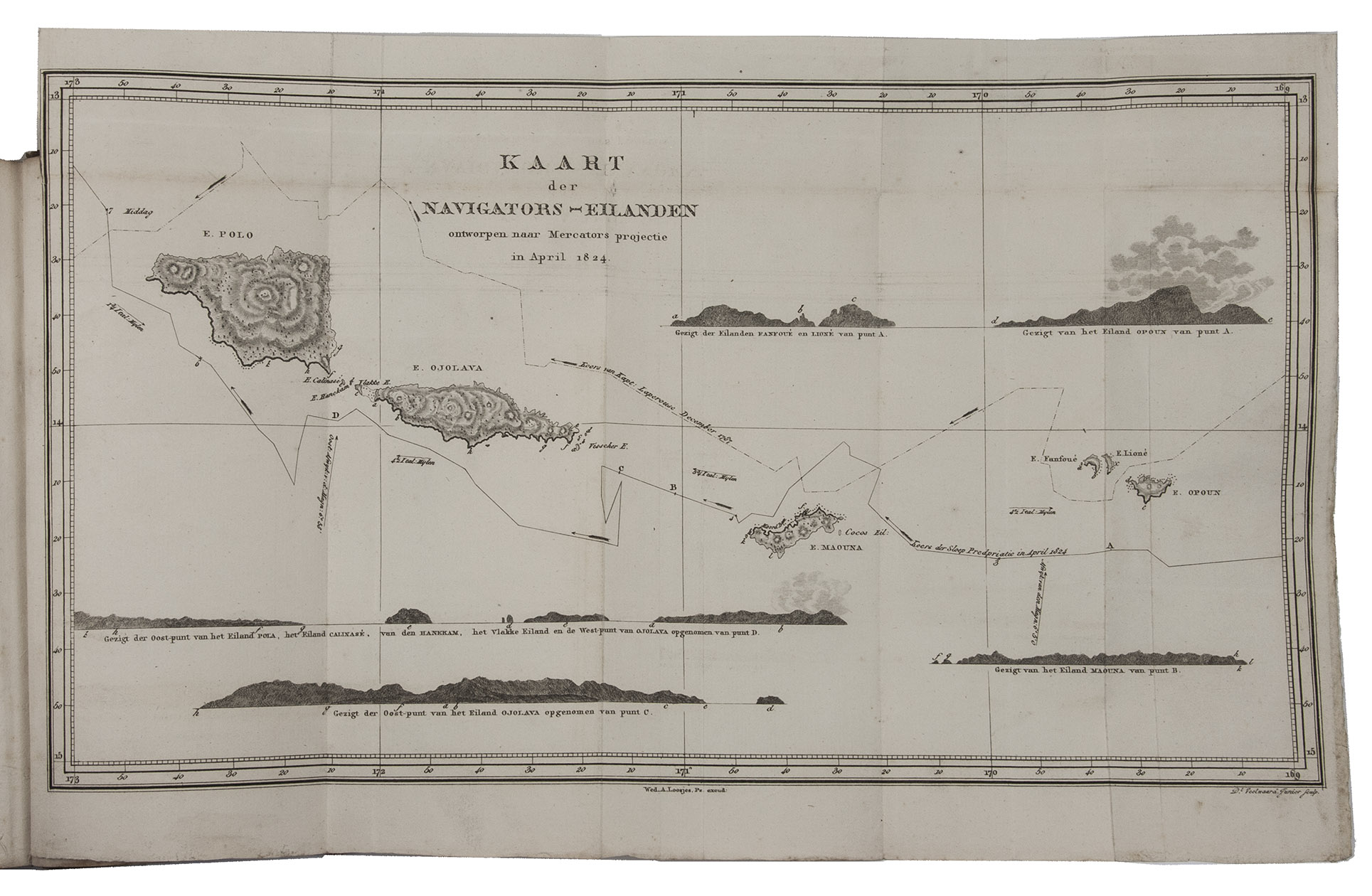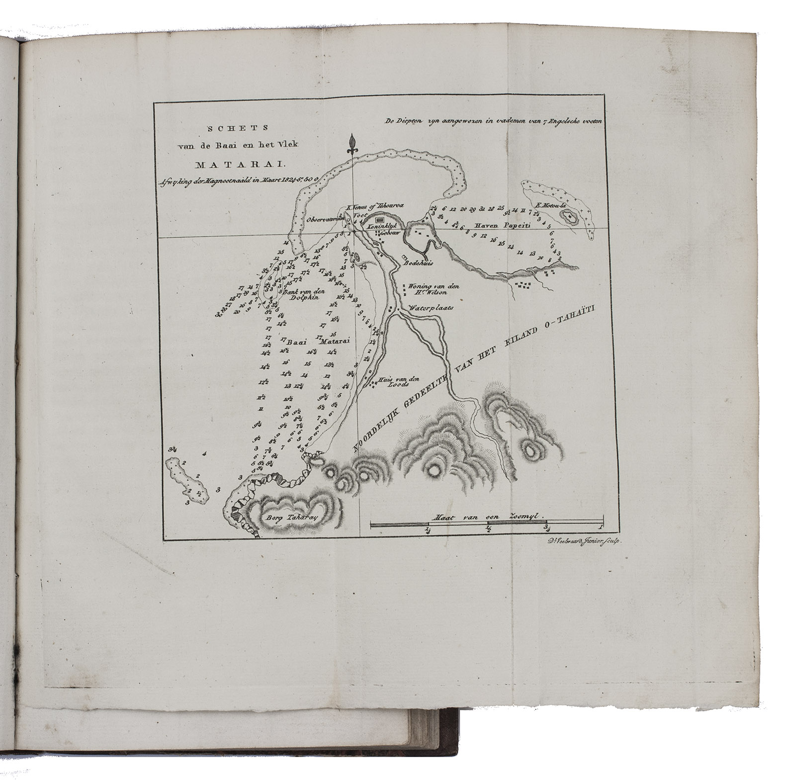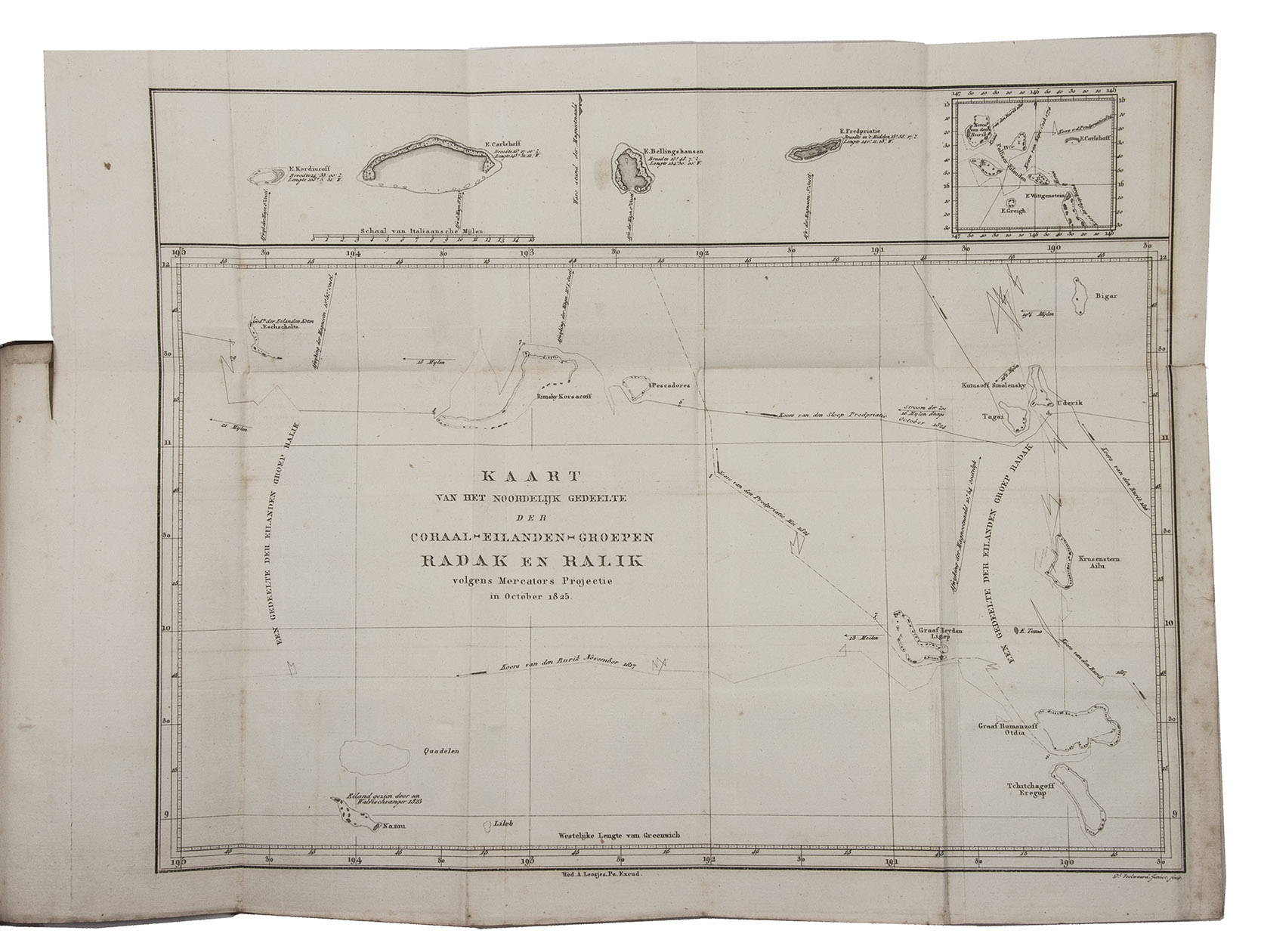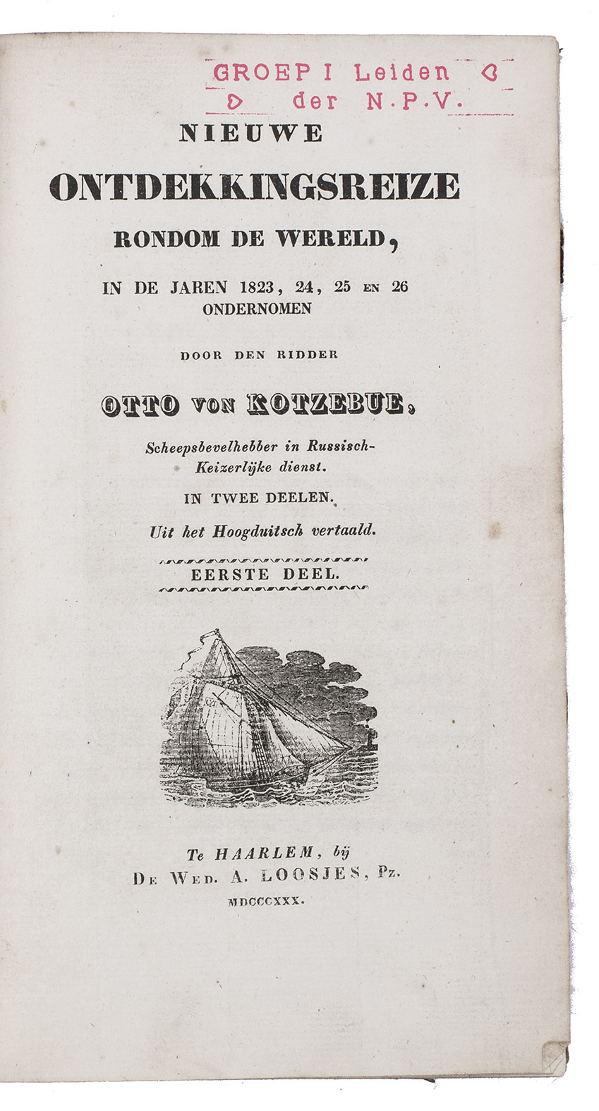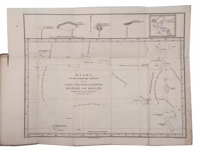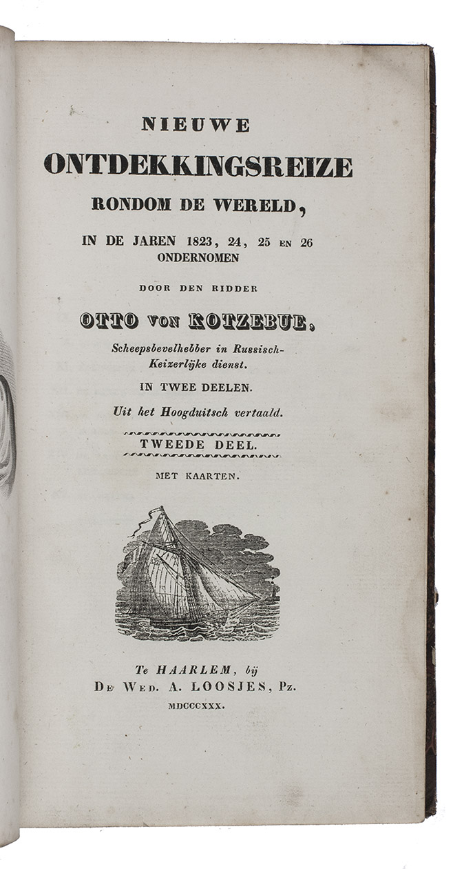 First edition of the Dutch translation of the account of Otto von Kotzebue's second expedition around the world in the years 1823-1826. Kotzebue (1787-1846), an Estonian captain in service of the Russian Czar Alexander I, led an expedition to take reinforcements to Kamchatka and navigate the North Pacific Ocean. The expedition set sail with two ships, leaving from St. Petersburg and sailing via the Atlantic Ocean to Rio de Janeiro, Cape Horn, and Valparaiso. It continued via the Pacific Ocean, where the party tried to locate and map some inhabited islands before visiting Tahiti. A long chapter is devoted to Tahiti, commenting on its history, inhabitants and their customs and costumes, government, religion, the position of women, geography, natural history, etc. They mapped Kamchatca, sailed along the coast of California, visited Hawaii, the Marianas, the Philippines and New Caledonia. Via Indonesia and Cape of Good Hope they reached Kronstadt in July 1826.