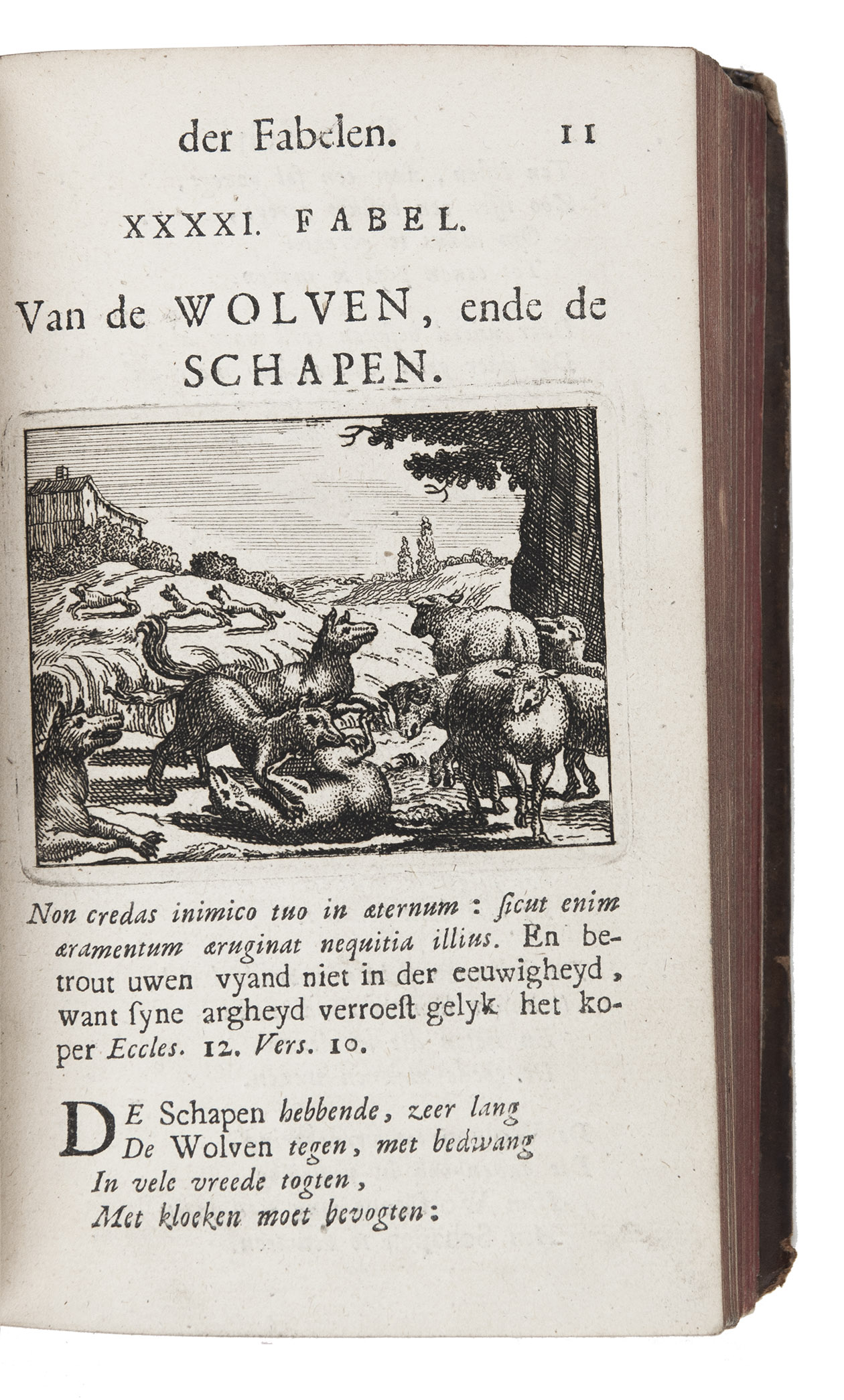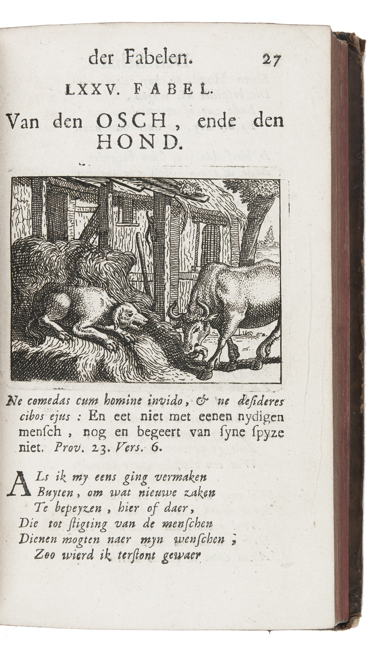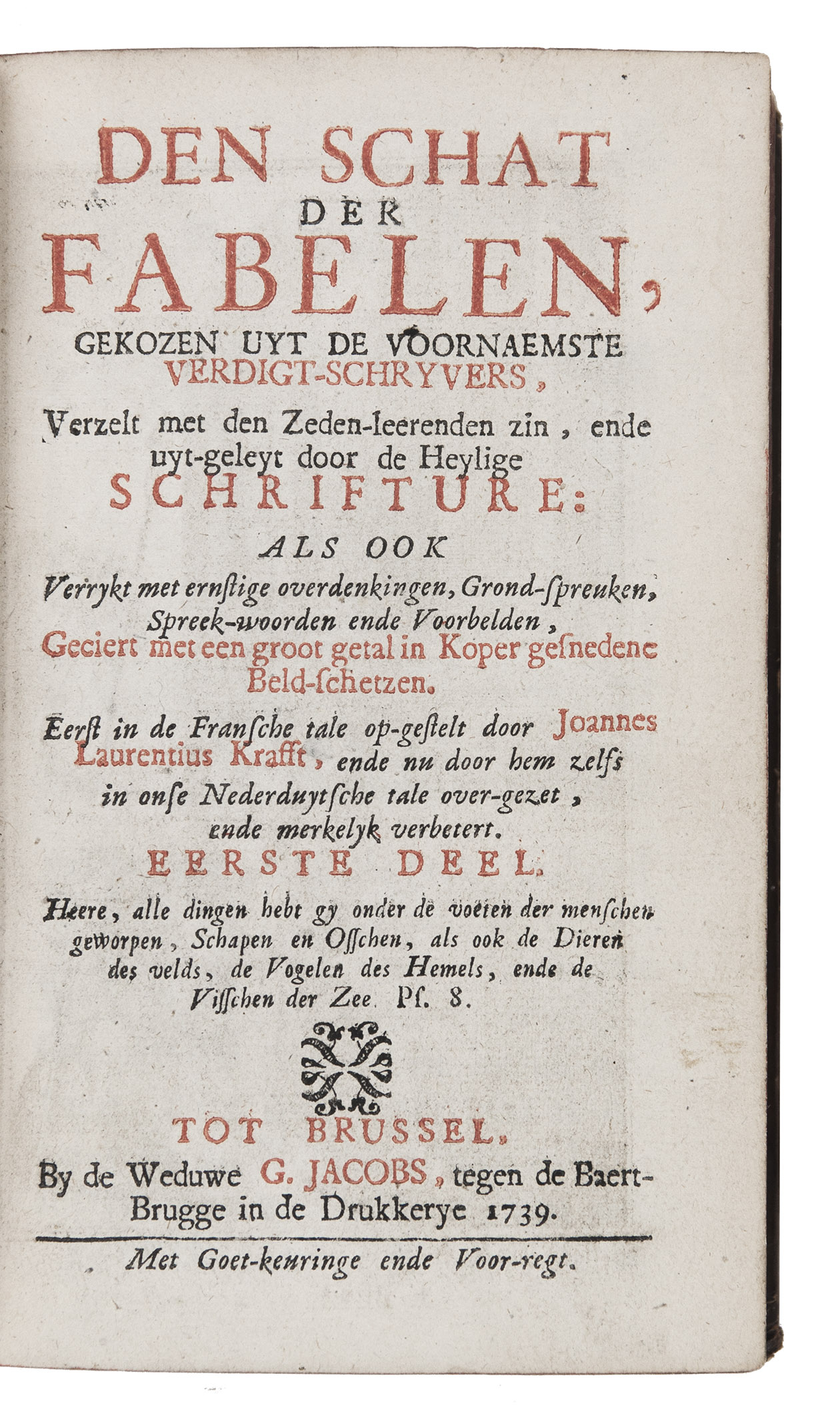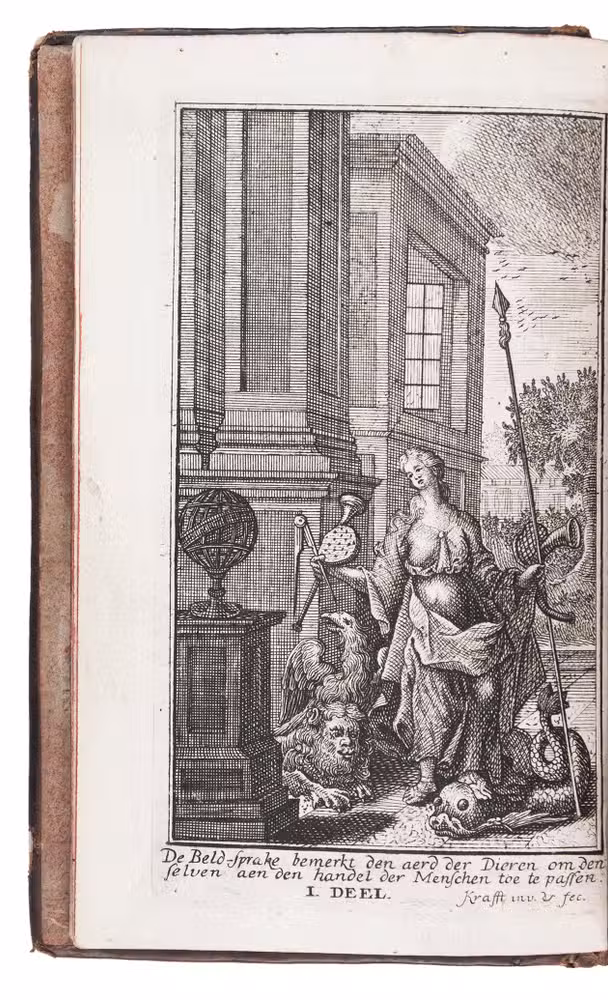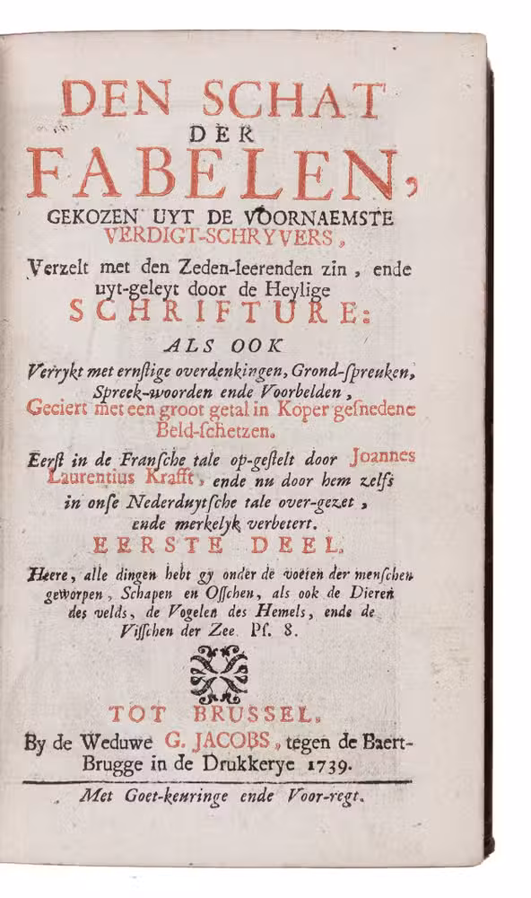 Very rare enlarged Dutch edition of a beautifully illustrated fable book by Joannes Laurentius Krafft, first published in French prose and here translated, expanded and improved by the author. Each fable, in verse, is followed by extensive moral reflections. Included are an extensive essay on the history of the genre, and a fable on the art of engraving. The charming illustrations (plate size 6×8 cm), skilfully executed, echo the celebrated work of Marcus Gheeraerts.