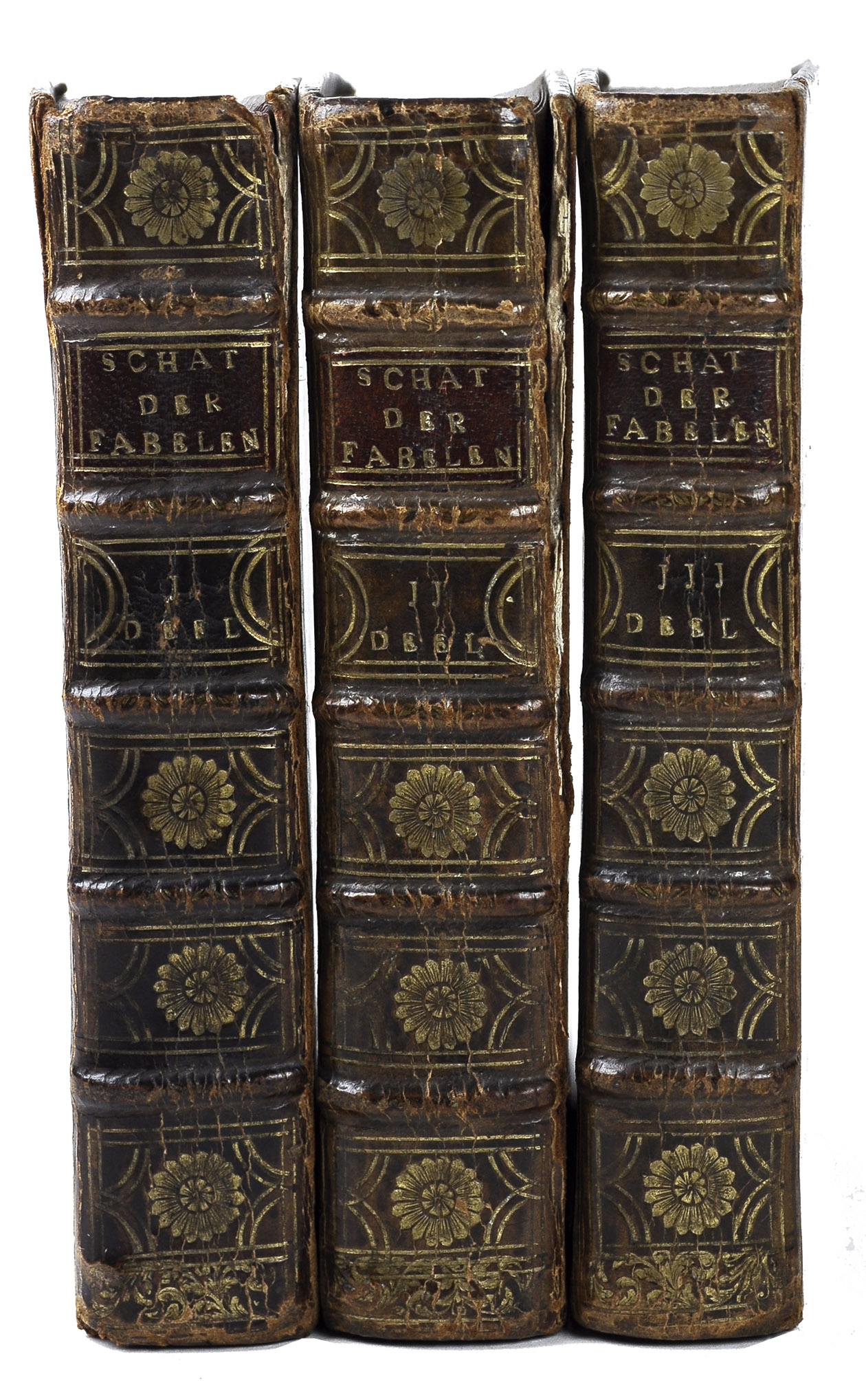 Brussels, widow of G. Jacobs, 1739-1740. 3 volumes. 8vo. With 3 different engraved frontispieces and 115 engraved illustrations, all designed and engraved by the author. Contemporary polished calf, gold-tooled spines. [24], 384, [8]; [40], 395, [7]; [24], 432, [8] pp.