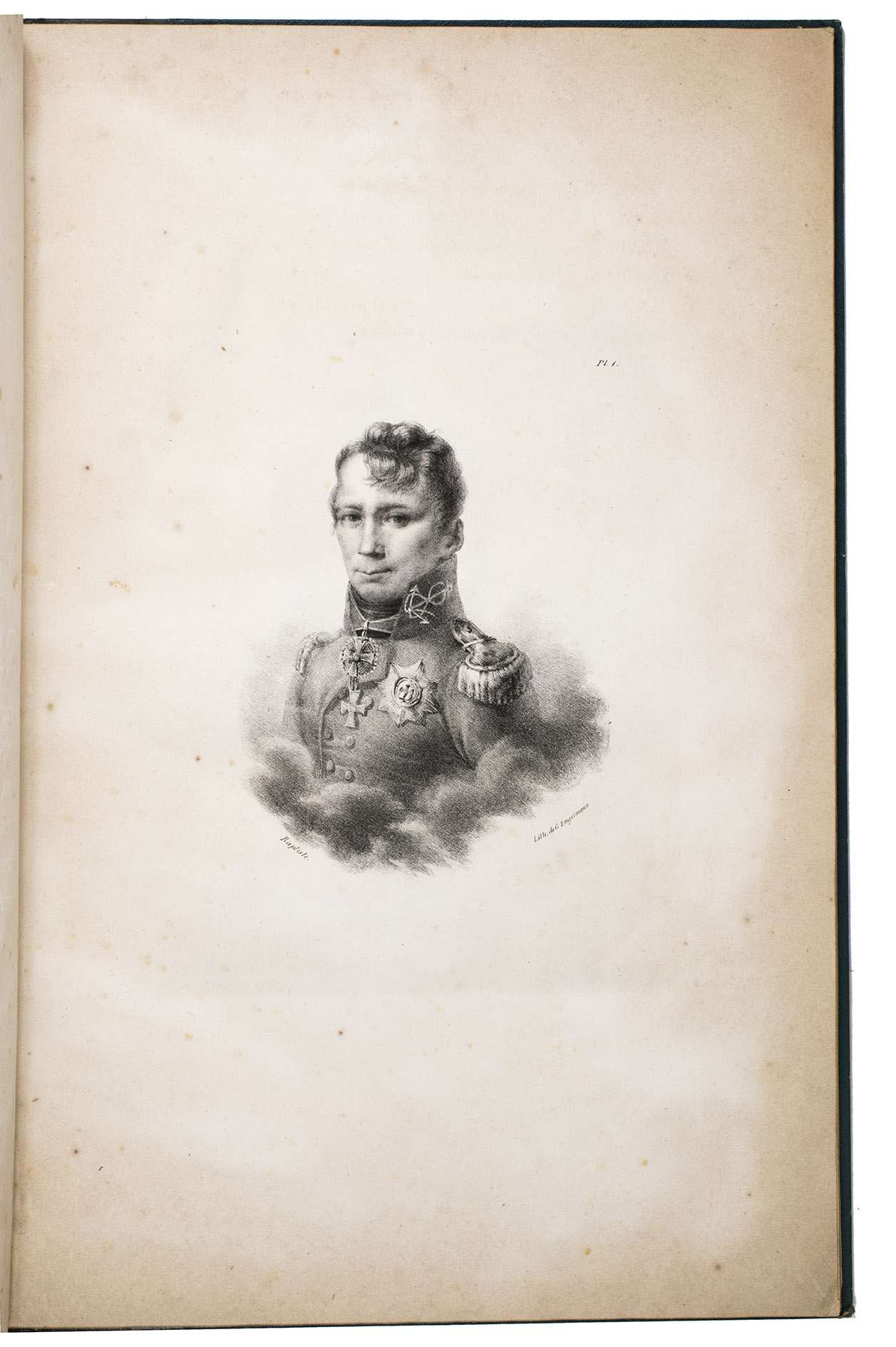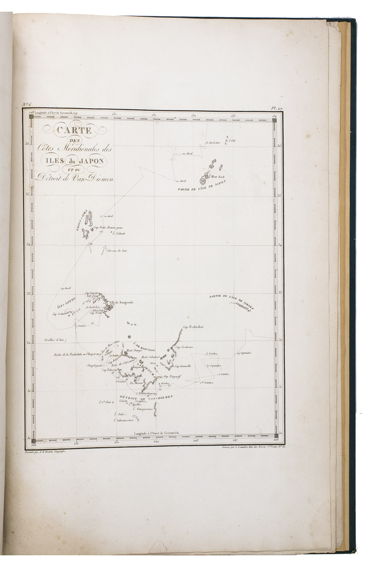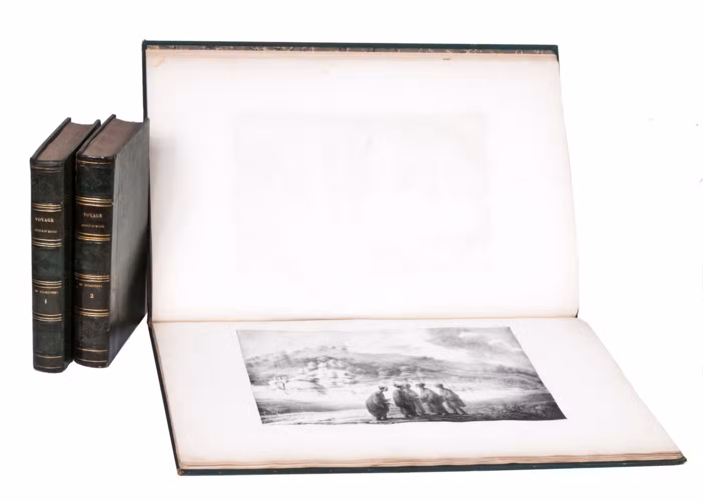 Paris, Librairie de Gide et Fils, 1821. 2 text volumes and 1 atlas. 8vo and folio atlas. With 30 engraved plates (21 views and portraits, 9 maps and charts, of which 3 folding). Contemporary blind-tooled dark green goatskin, with a dark green morocco title label and a dark green morocco volume label on the spine, dark green buckram sides, marbled end papers. The atlas in contemporary gold- and blind-tooled dark green quarter goatskin, with the title lettered in gold on the spine, blue green cloth sides, marbled end papers. XII, 418, [2 blank]; [2 blank], [4], 531, [1 blank]; [4] pp. + 30 plates.