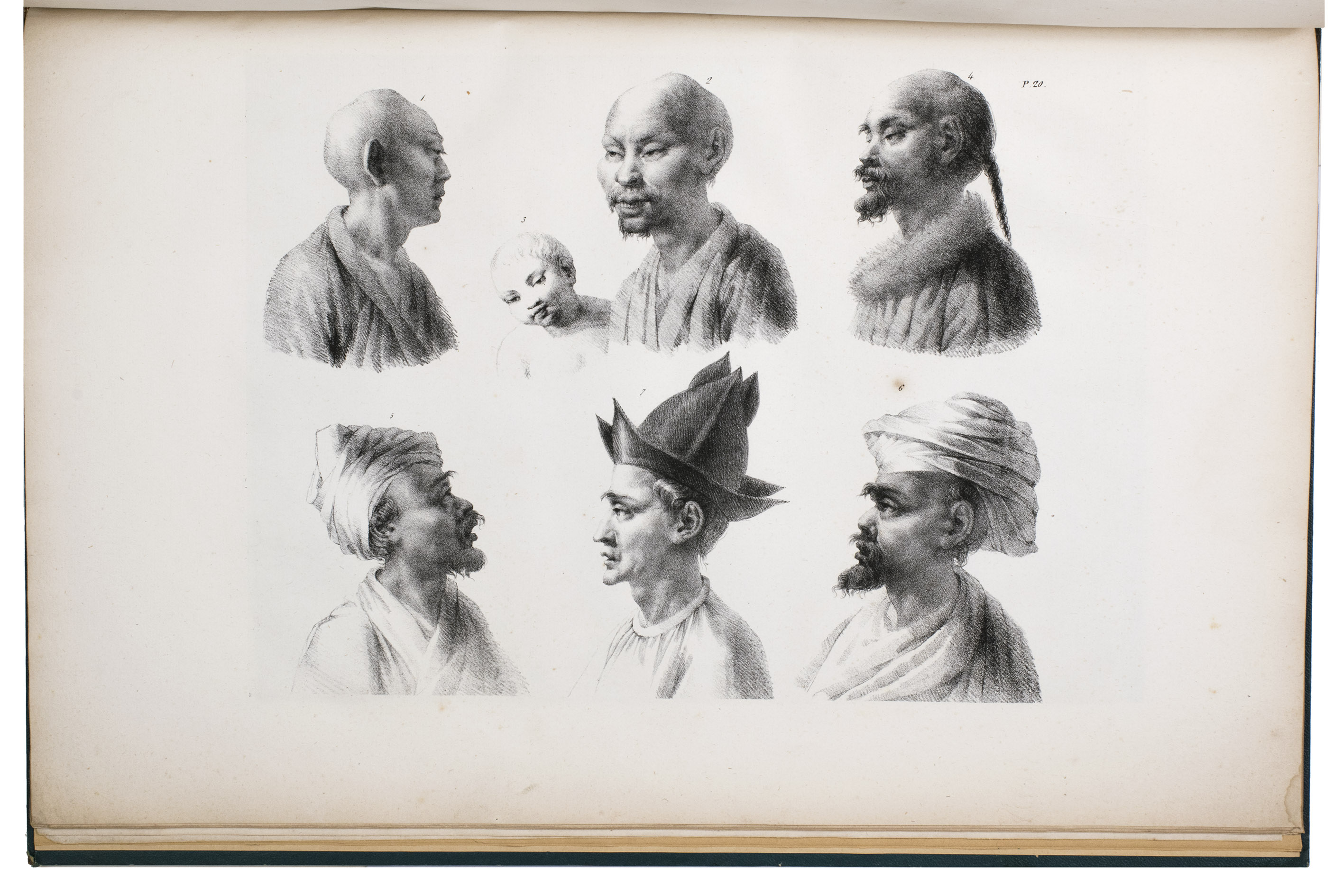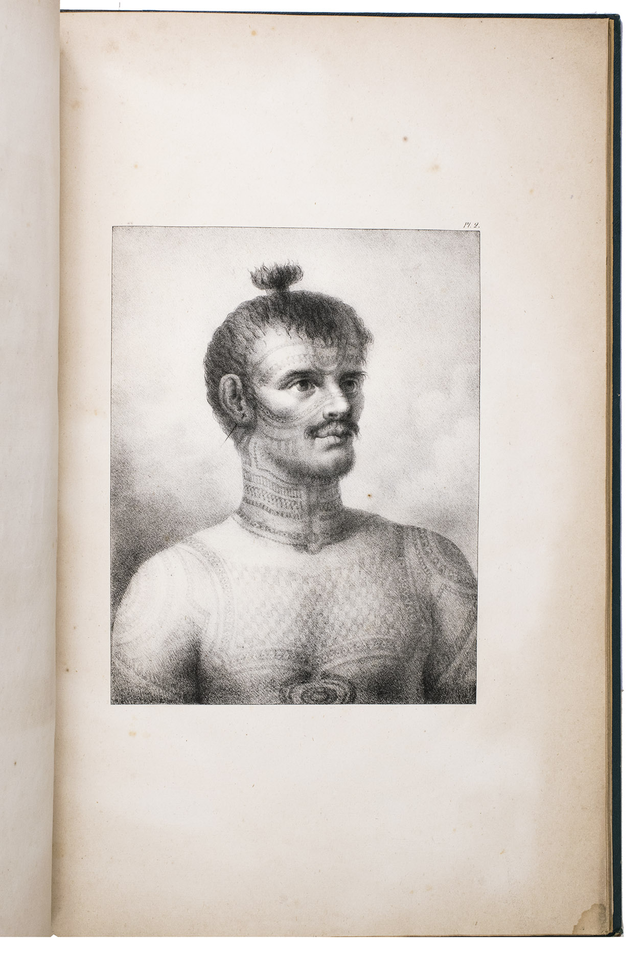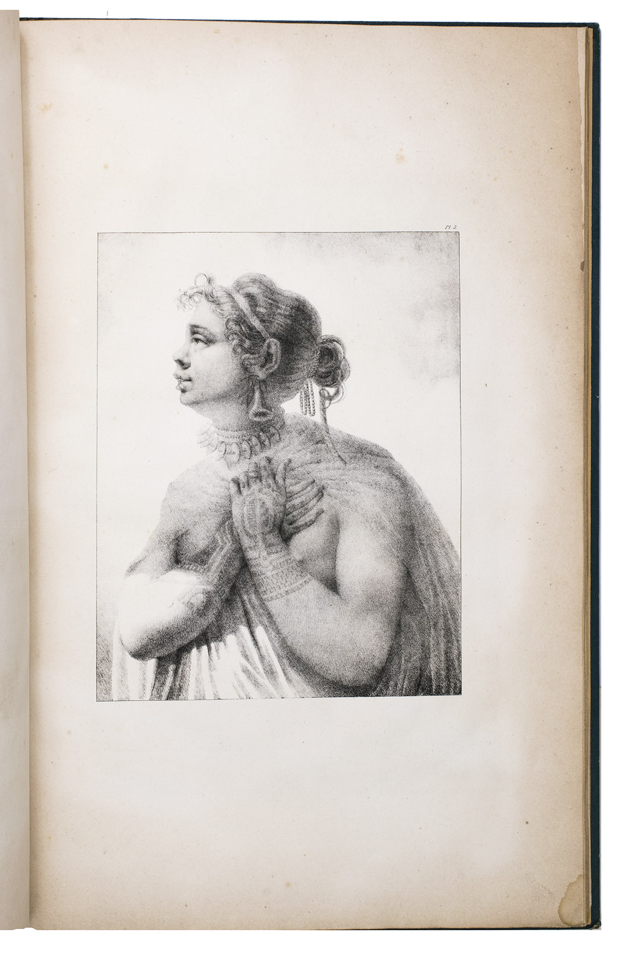 Paris, Librairie de Gide et Fils, 1821. 2 text volumes and 1 atlas. 8vo and folio atlas. With 30 engraved plates (21 views and portraits, 9 maps and charts, of which 3 folding). Contemporary blind-tooled dark green goatskin, with a dark green morocco title label and a dark green morocco volume label on the spine, dark green buckram sides, marbled end papers. The atlas in contemporary gold- and blind-tooled dark green quarter goatskin, with the title lettered in gold on the spine, blue green cloth sides, marbled end papers. XII, 418, [2 blank]; [2 blank], [4], 531, [1 blank]; [4] pp. + 30 plates.