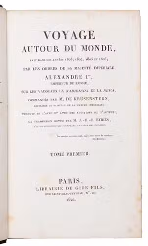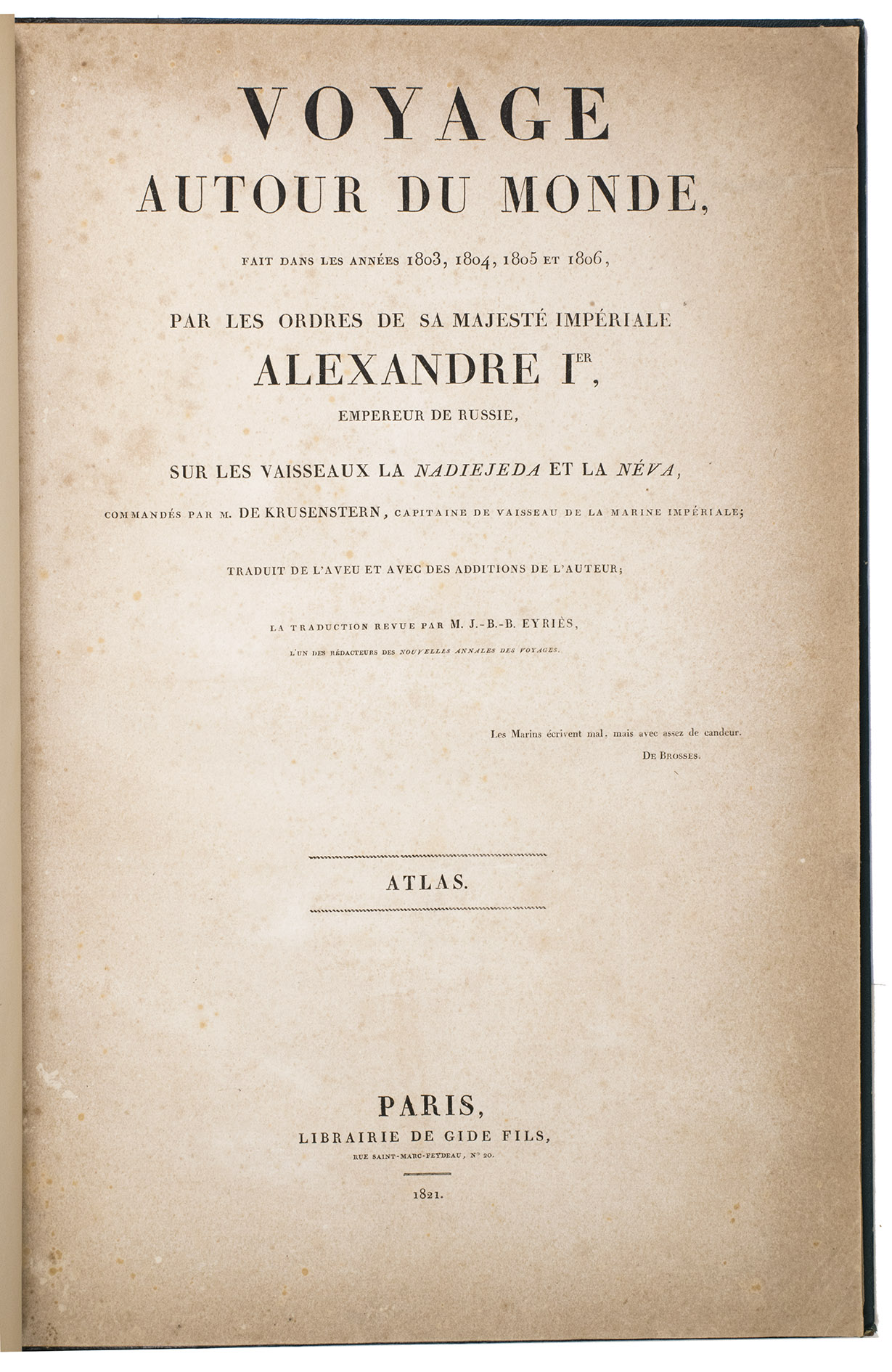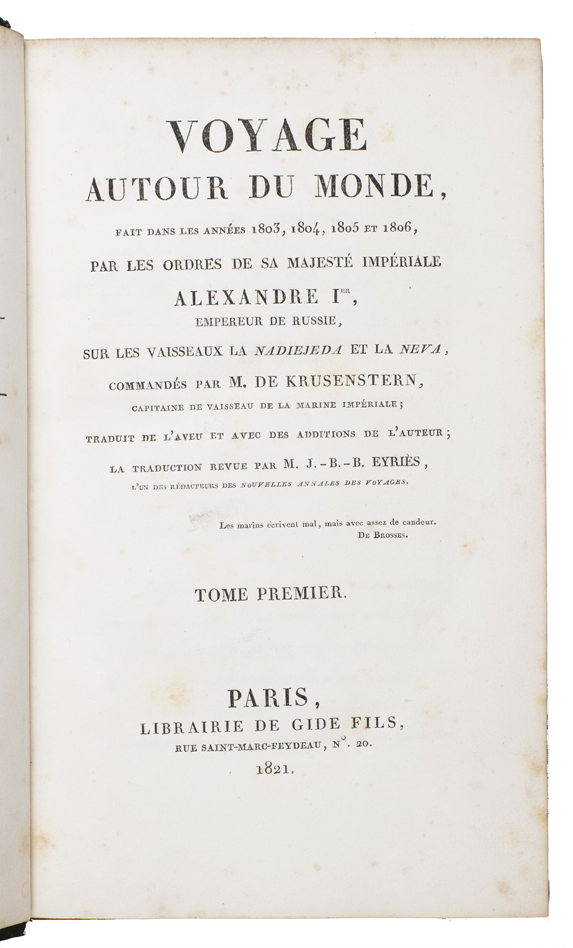 Voyage autour du monde, fait dans les années 1803, 1804, 1805 et 1806, par les ordres de Sa Majesté Impériale Alexandre Ier, empereur de Russie, sur les vaisseaux la Nadiejeda et la Neva, commandés par M. de Krusenstern, capitaine de vaisseau de la marine impériale.
