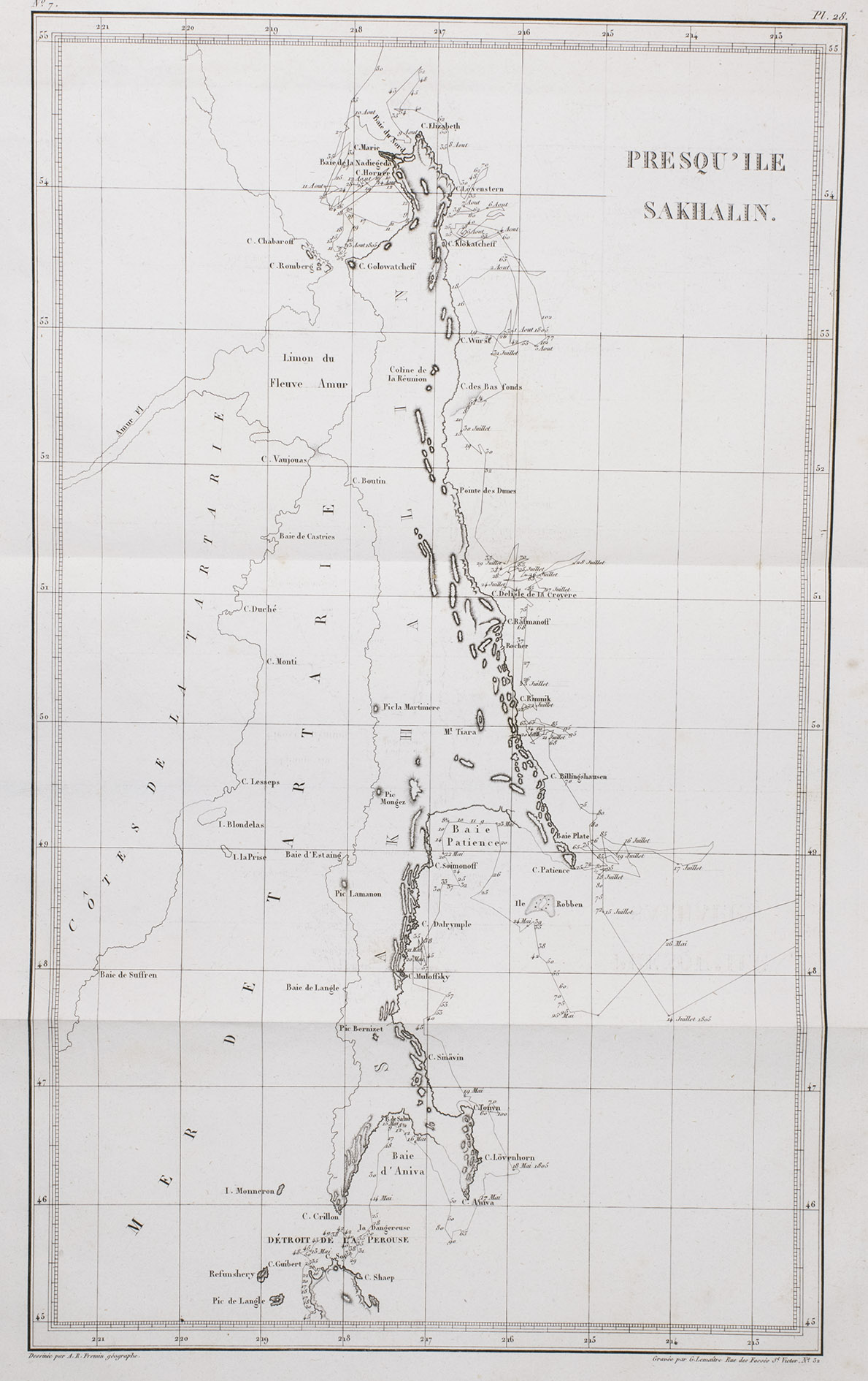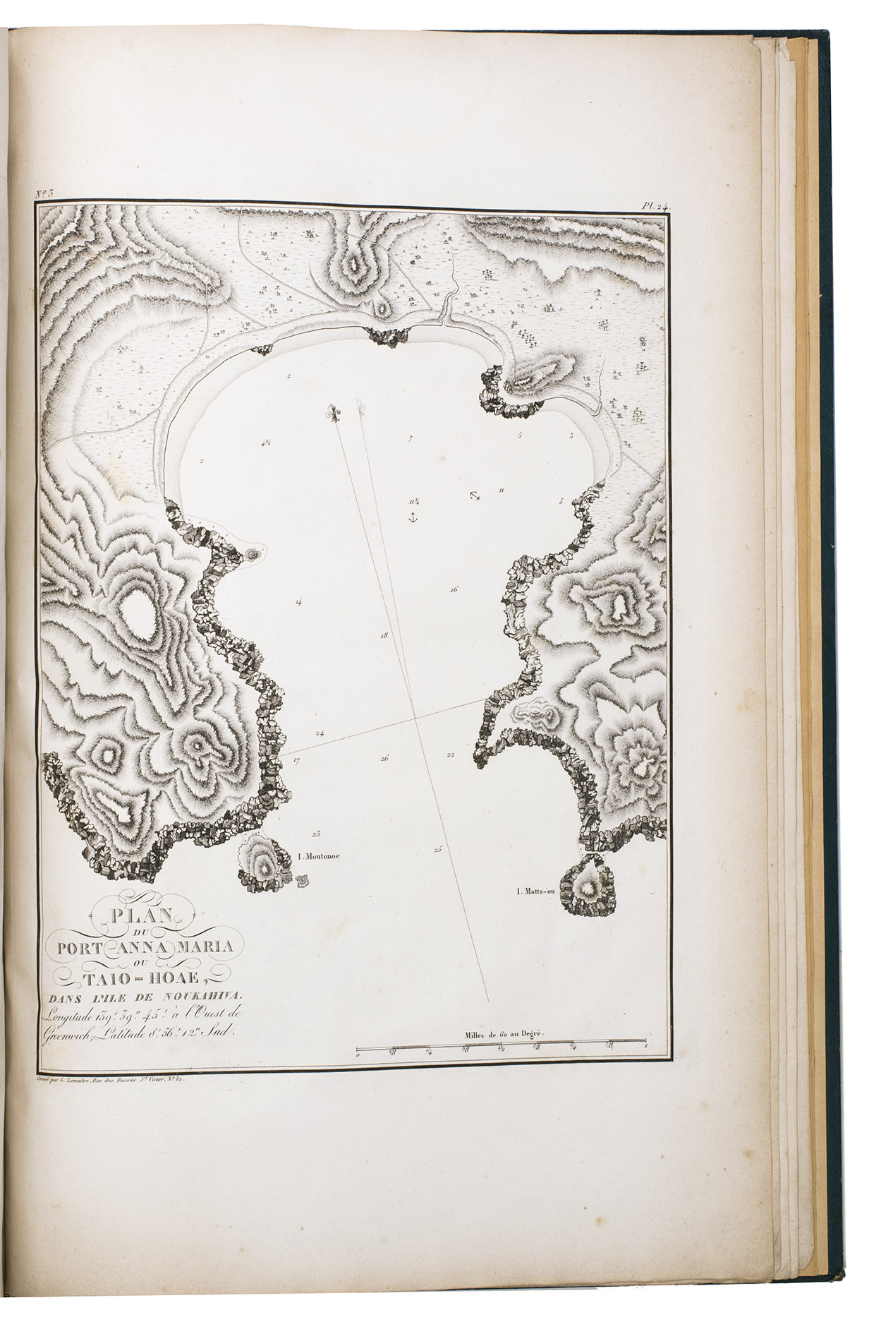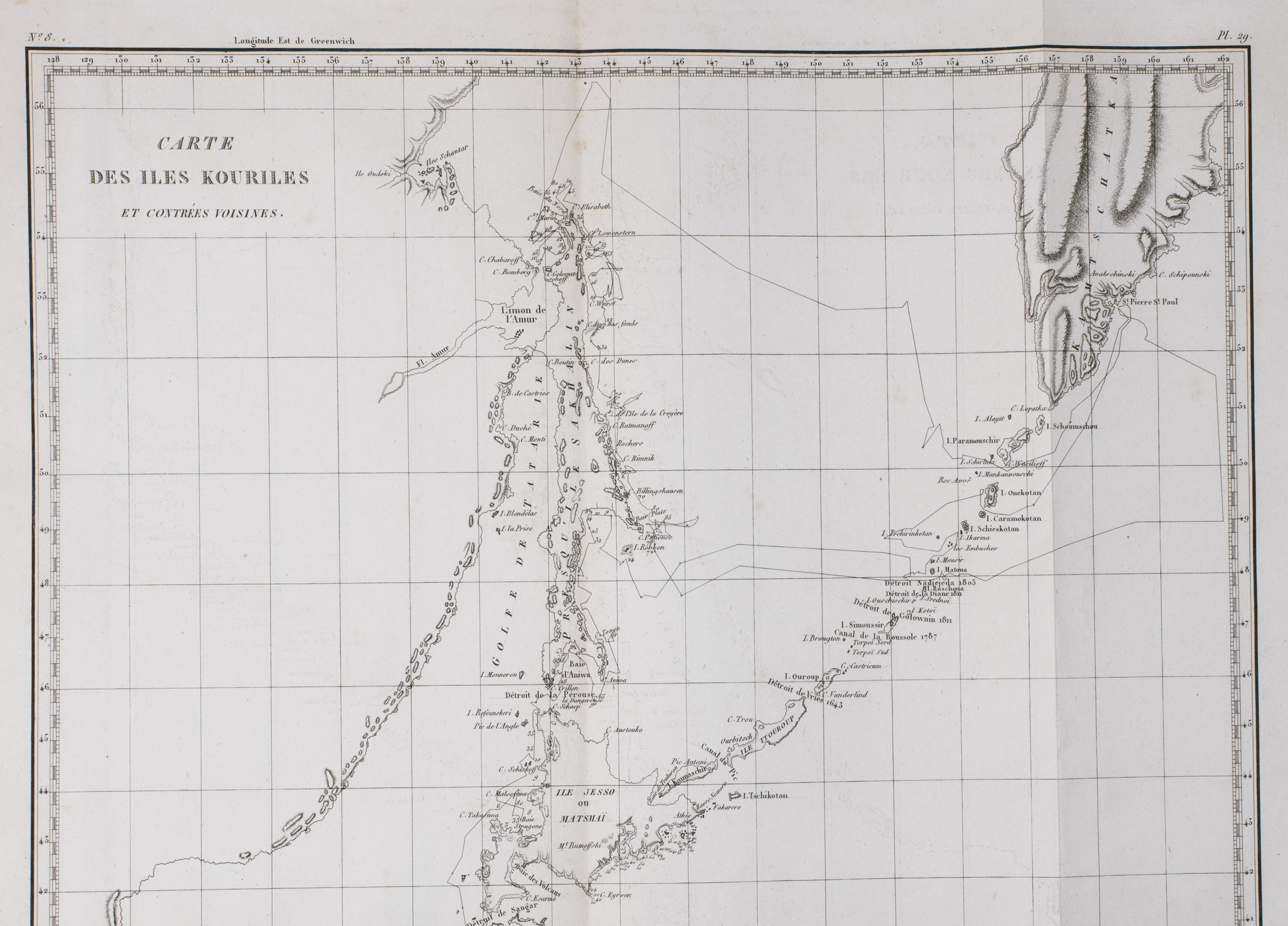 Very scarce first French edition of the very important and significant account of the discoveries of Krusenstern. Borba de Moraes writes: "The expedition became famous as the beginning of Russian exploration in the North Pacific, on the Asian coast as well as the American. Krusenstern explored the northern part of the Sakhalin Island, concluding erroneously that it was a peninsula. This mistake was only corrected fifty years later by Nevelskoi. Besides its geographical interest, Krusenstern's account is also valuable for the study of the fur trade in the extreme north. From the Brazilian point of view the interest lies in the description of the expedition's stay in Santa Catharina."