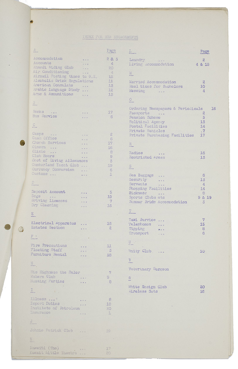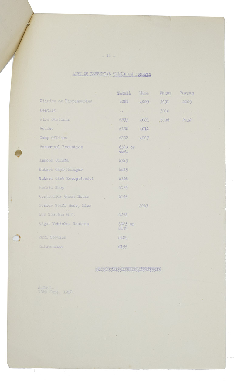 Al Ahmadi, Kuwait Oil Company, 18 June 1952. Small folio (33 x 20.5 cm). Duplicated typescript, printed on the rectos only in purple ink, probably with a spirit duplicator. Loose sheets, stapled together at the left top corner with holes punched in the left margin. [2], 22 pp.