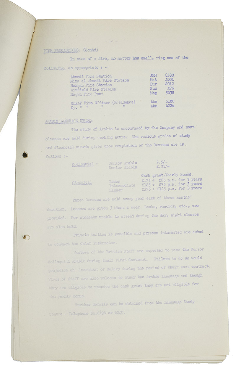 At some places very slightly frayed and creases along the edges and corners, staple a little rusted, leaves slightly toned, some leaves a little cut short at the foot (with no loss except for some of the catch-words, but overall in remarkably good condition. A rare and unrecorded guide for employees of the Kuwait Oil Company in Ahmadi.