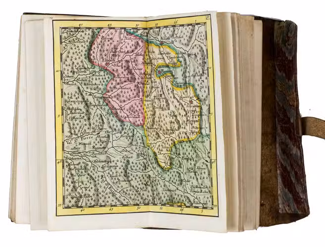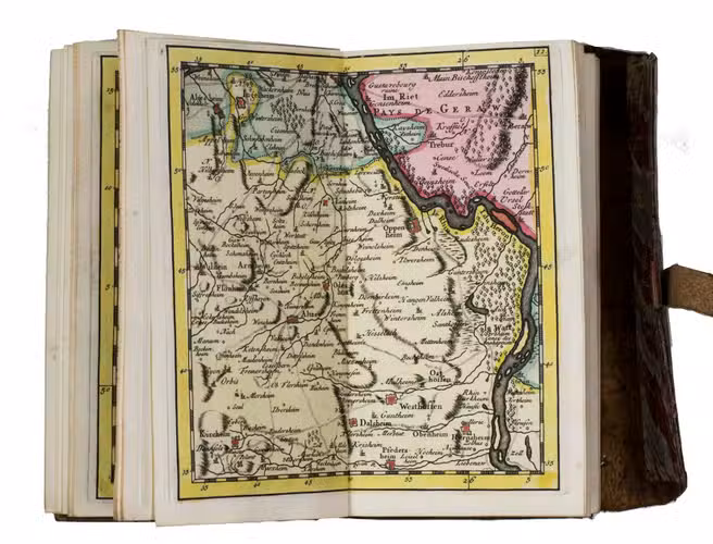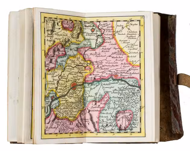 The British Captain George Howard (1718-1796) bought the present copy on 10 August 1743, probably at the bookshop of Philipp Heinrich Hutter in Frankfurt. Howard served in the 3rd regiment of foot ("The Buffs") under his father Thomas Howard and had just participated in the Battle of Dettingen (May 1743) during the War of the Austrian Succession (1740-1748) when he bought this atlas. He would later command the Buffs at the Battle of Fontenoy (1745) and at Falkirk Muir and Culloden (1746). After the wars he became an MP and was ultimately promoted to Field Marshal in 1793. Loosely inserted in a pocket of the atlas is a note in Howard's hand describing on one side the affairs on 10-13 August 1743 and on the other side his expenses in July and August 1743. The pocket atlas is probably noted as "a book of maps" on 11 August.