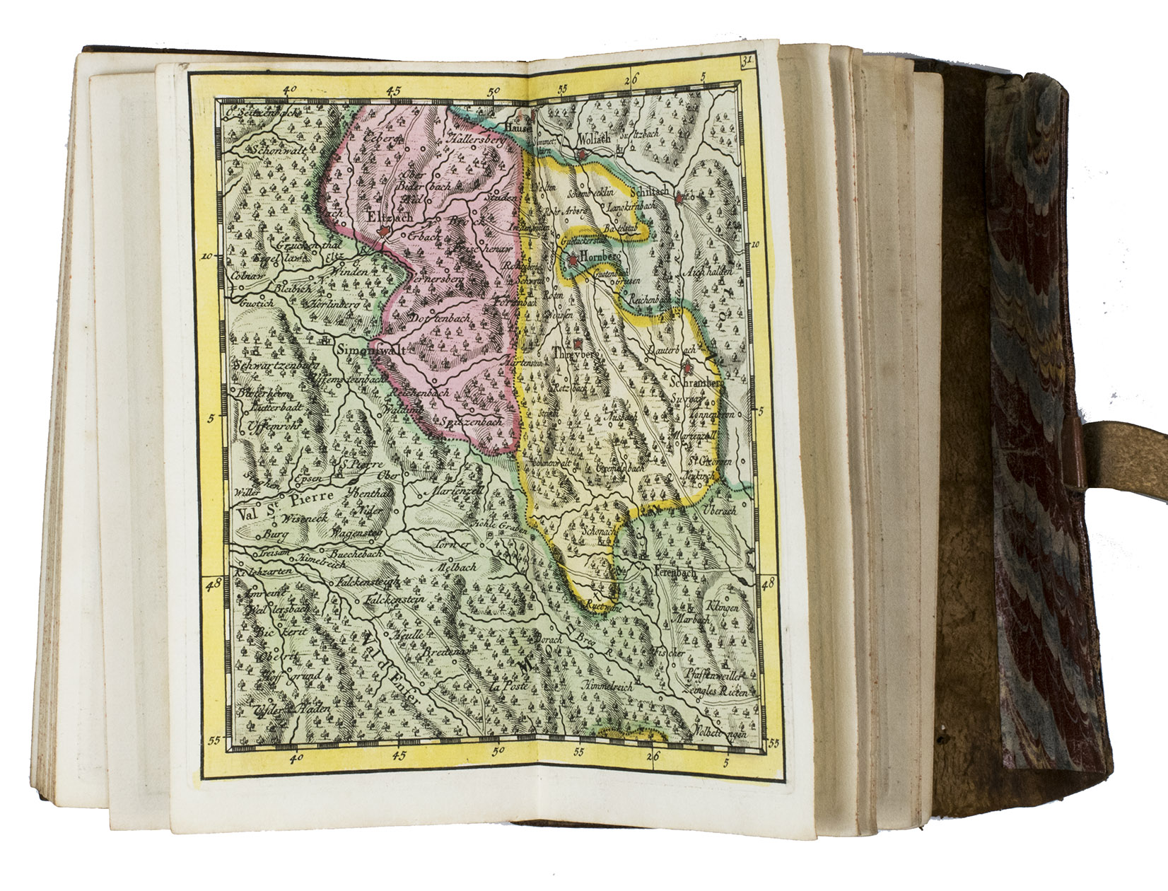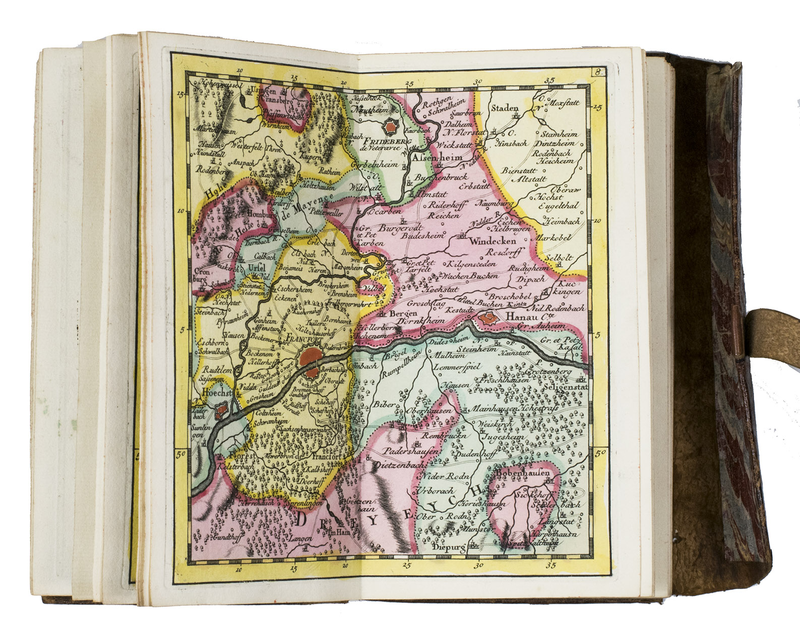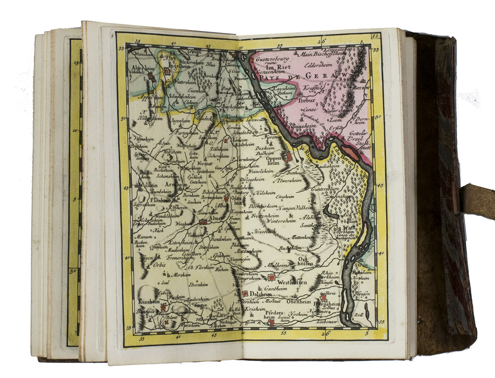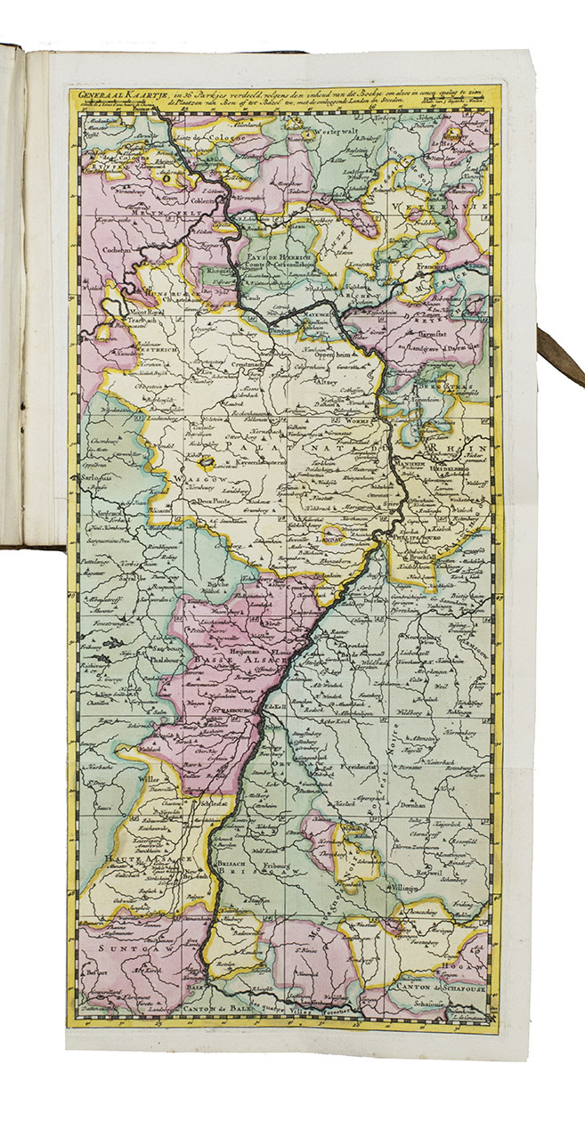 Very rare pocket atlas of the Rhine-area between Cologne in the north and Basel, published for use by military officers and civilian travellers and based on maps prepared by Guillaume de l'Isle (1675-1725) during the War of the Spanish Succession (1701-1714). A folding map shows the entire region and identifies the separate maps. The publisher promises in the introduction that all 36 maps combined will result in a "very large map": ca. 140 x 65 cm.