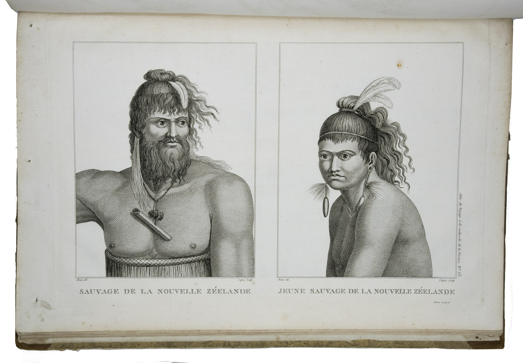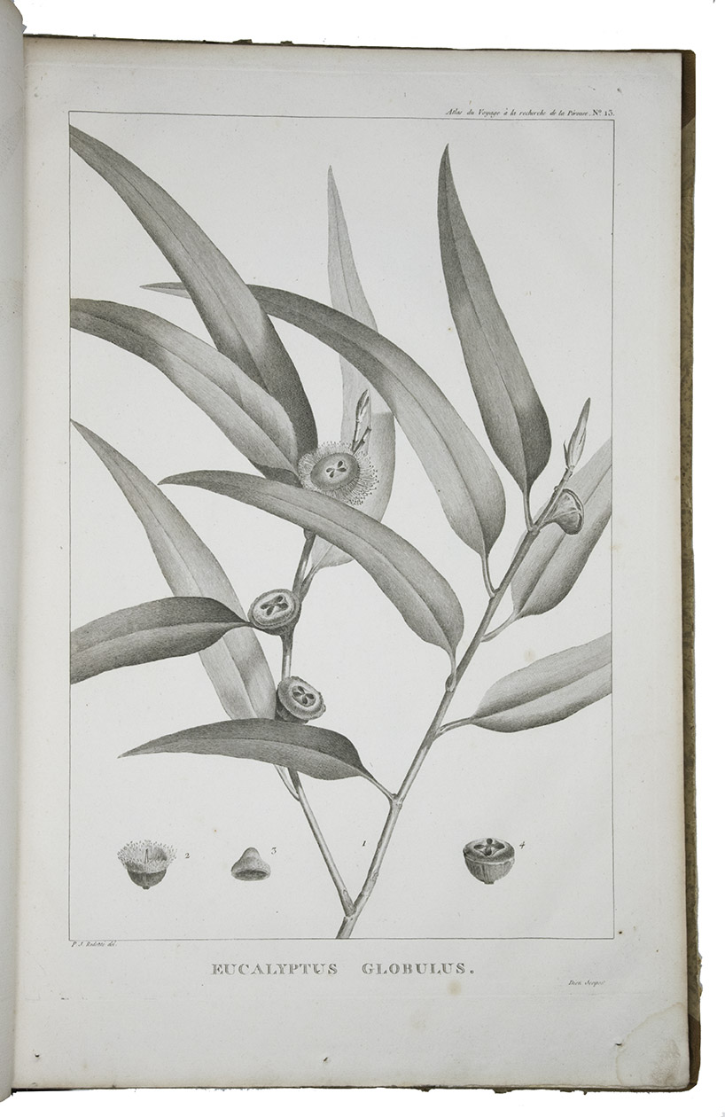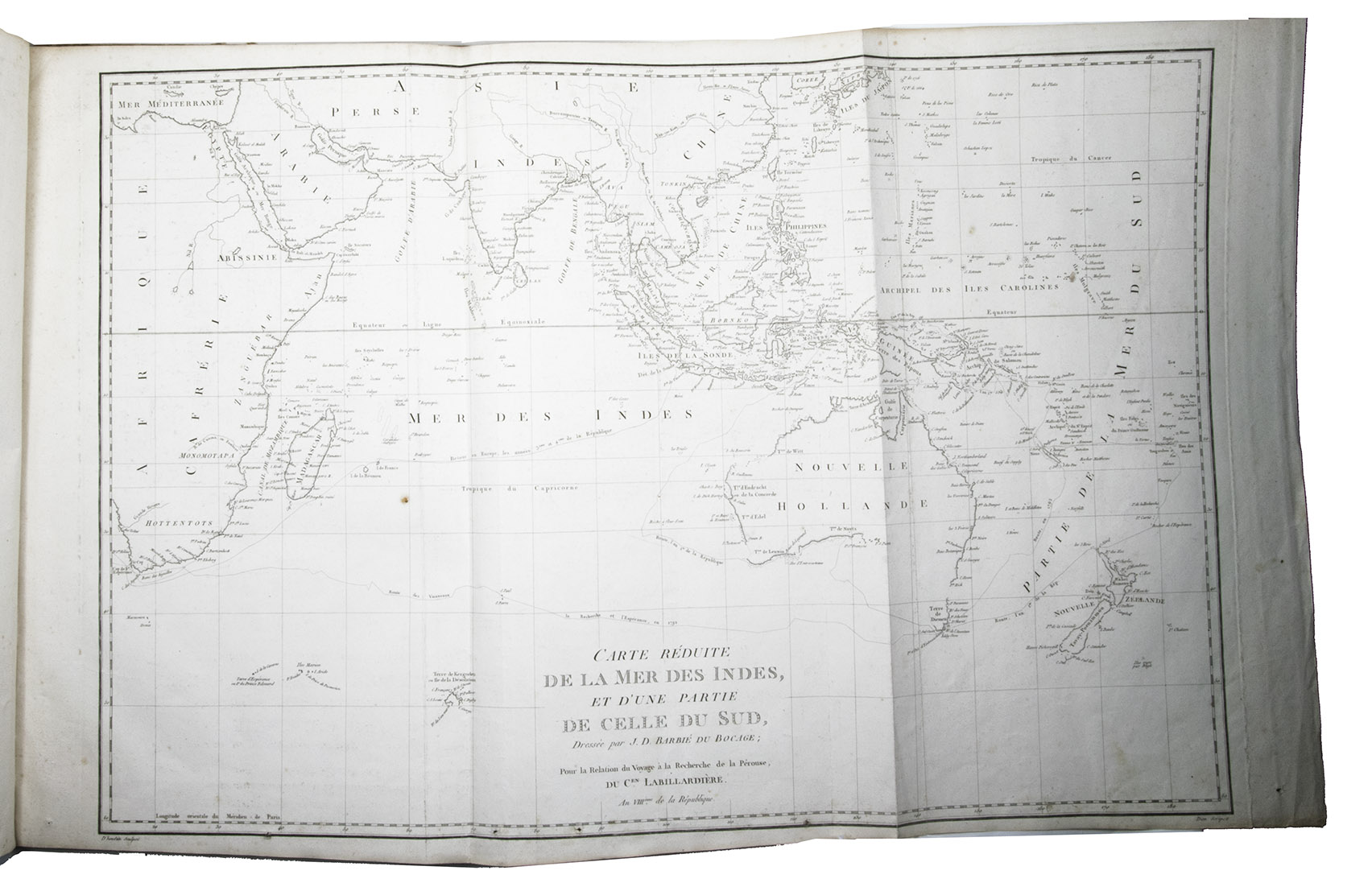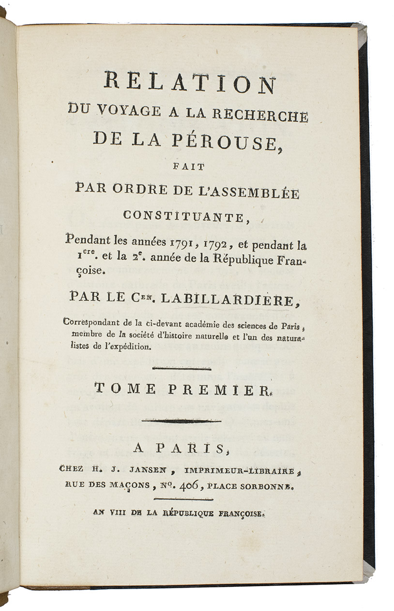 Text volumes in very good condition. Binding of the atlas volume slightly rubbed and worn, corners bumped, a fold in the title-page and some small tears and marginal stains, but with all the prints in good condition, each with three prickings in the foot margin. Brunet 10866; Edward Duyker, Citizen Labillardière: a naturalist's life in revolution and exploration (2003); Ferguson 308; Hill 955 note; Hocken, New Zealand, p. 28 note; Howego, E26 (ed. not specified); Kroepelien Bibl. Polynesiana 697; McLaren, Pérouse in the Pacific 51; Nissen, ZBI 2331; Sabin 38420; Stafleu & Cowen 4070; Wickersham 6613a? (misdated "an vii" & could be 8vo or 4to ed.); cf. Cox I, p. 68; II, p. 307 (4to ed.); Wantrup 132 (4to ed.)