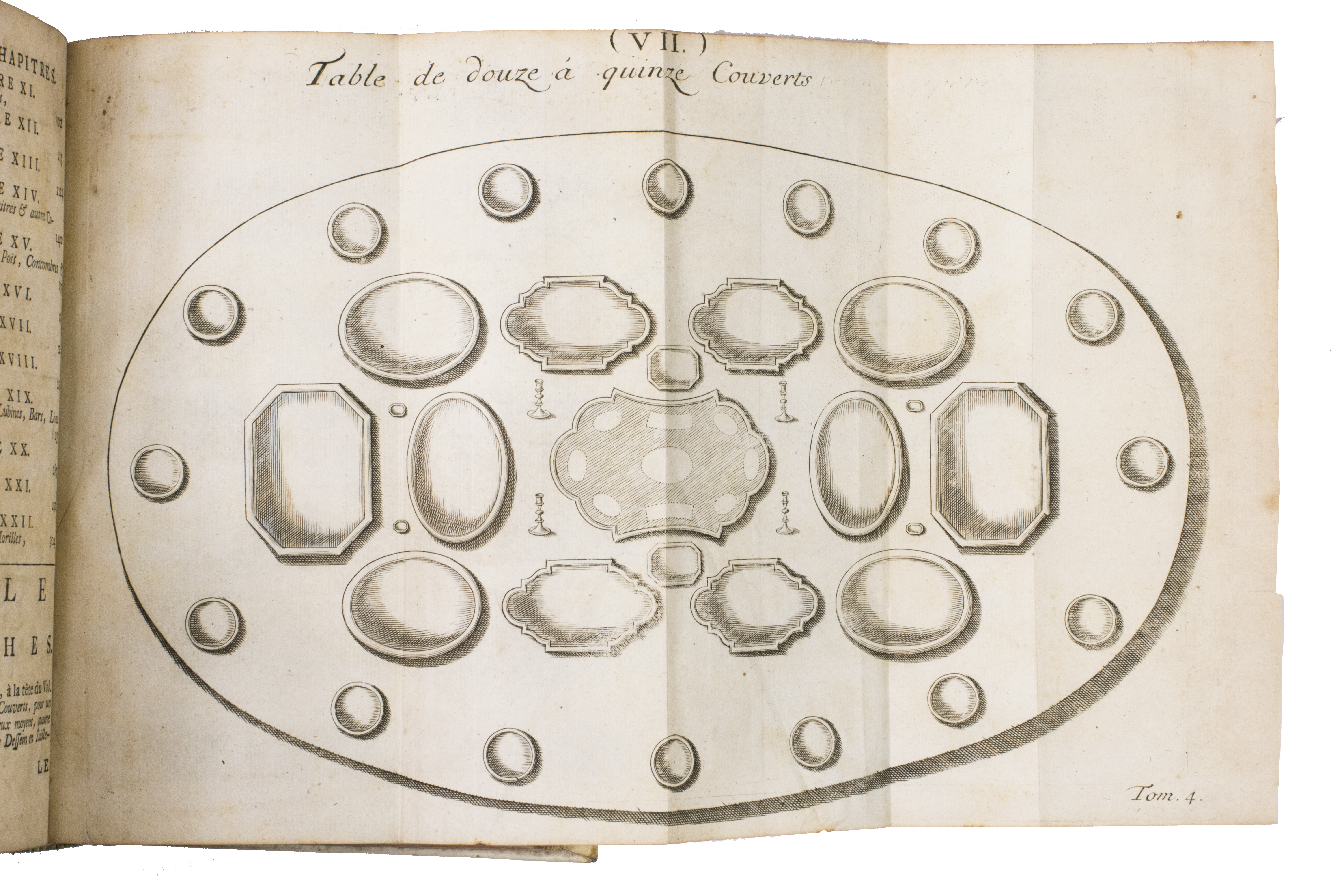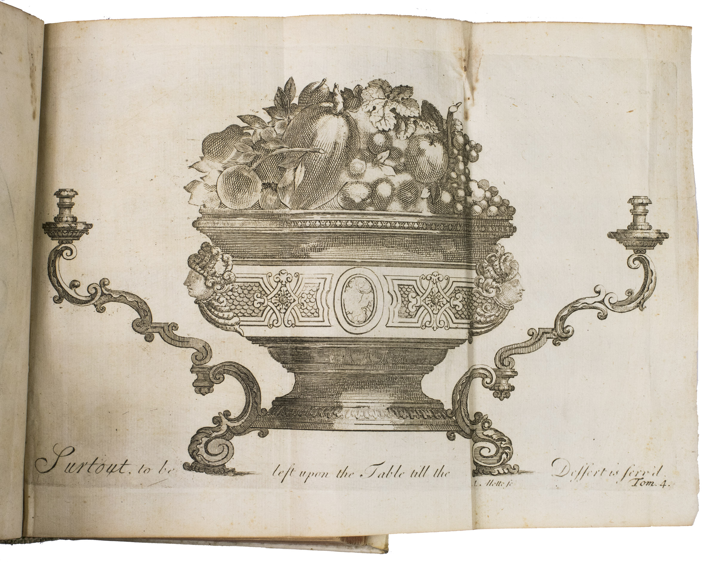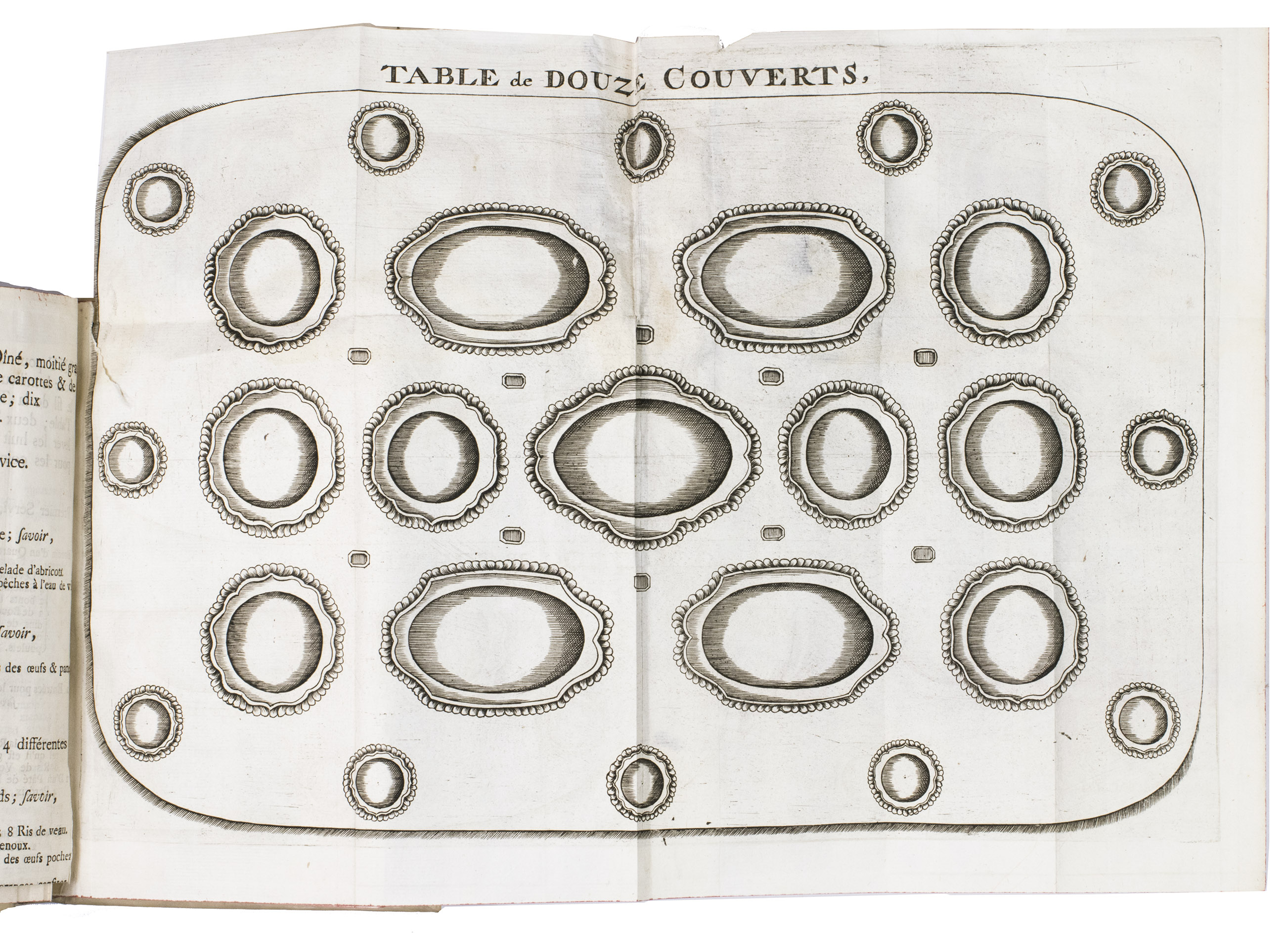 The work was originally published in English under the title The modern cook (1733). It was then translated into French and published in the Hague in 1735. A second edition, the present copy, appeared in 1742. This second edition is in fact a re-issue of parts 1-4 of the first French edition. Added are only some preliminary pages ("Avertissement de l'auteur" in part 1 and "Table des chapitres" & "Tables des planches" in parts 1-4). The engravings and printed menus (numbered I-VII) are also mostly identical, except for the engraving depicting various silver plates ("Modelle des plats ) to which French names are added. The fifth part, however, is completely new and includes two folding engravings (both unnumbered, but in fact no. VIII-IX) depicting table settings for 12 to 16 "couverts", accompanied by 1 folding printed text-leaf (numbered VIII-IX on recto and verso) with descriptions of the menus for the various dinners.