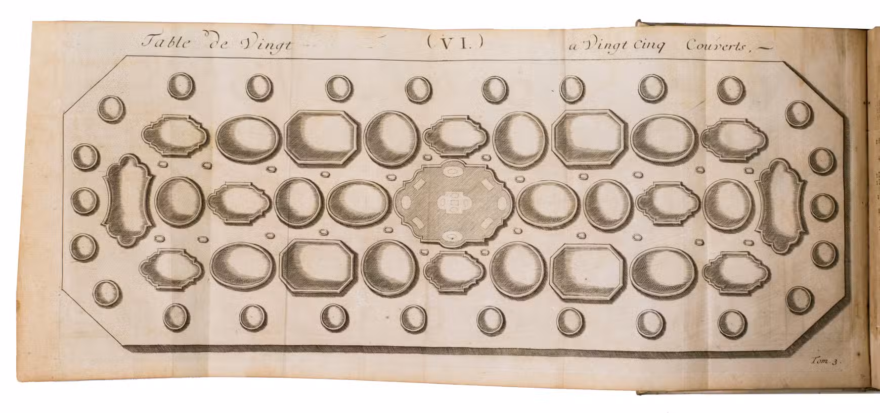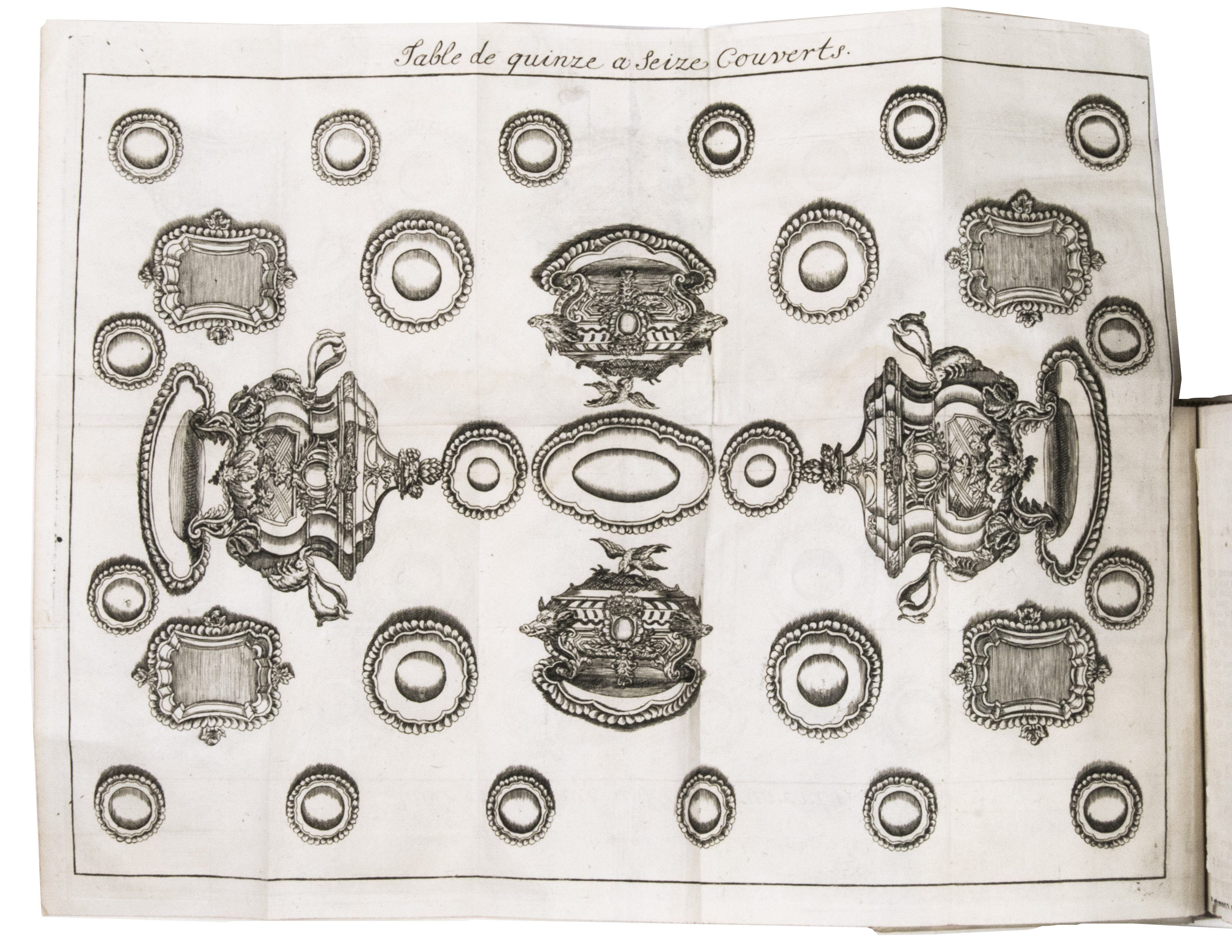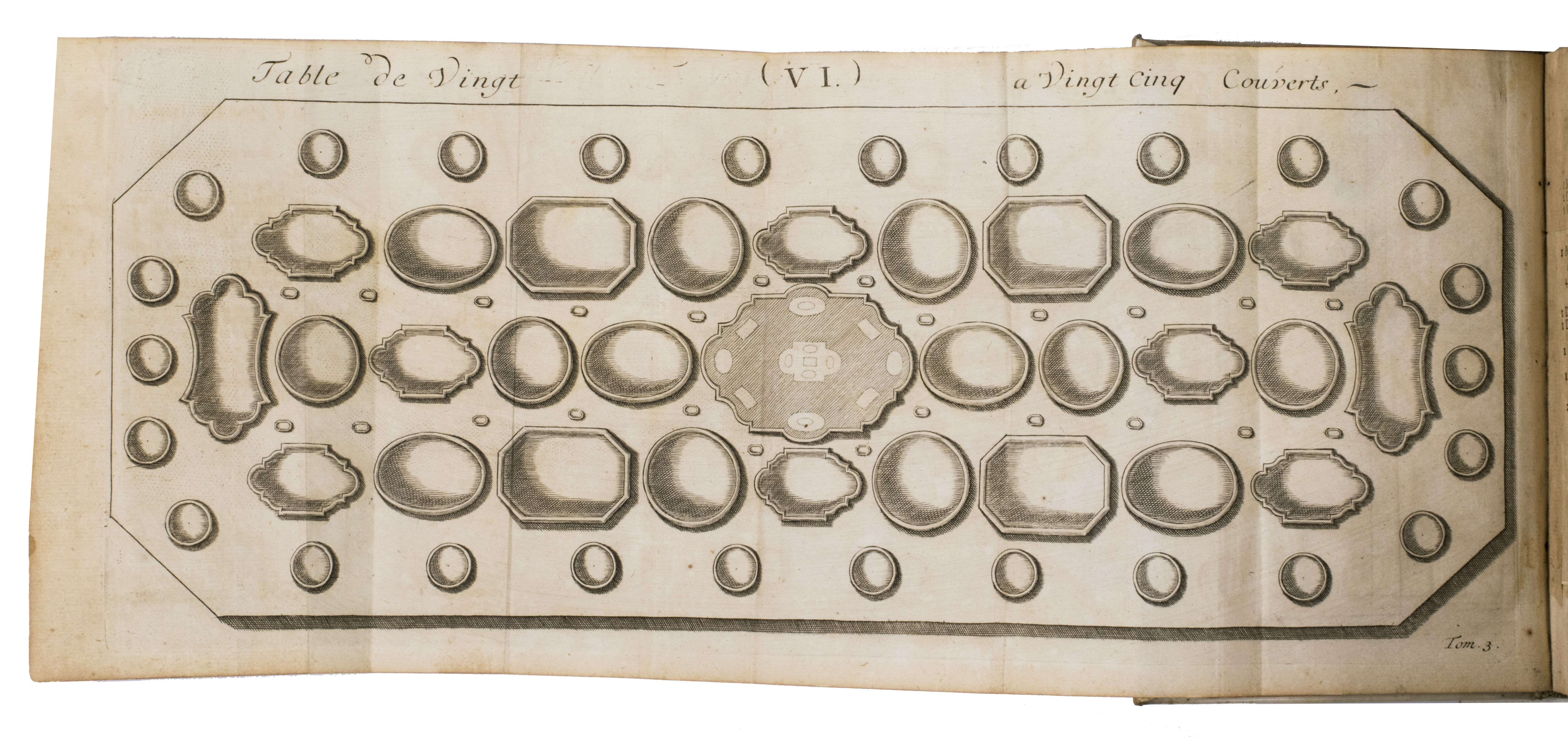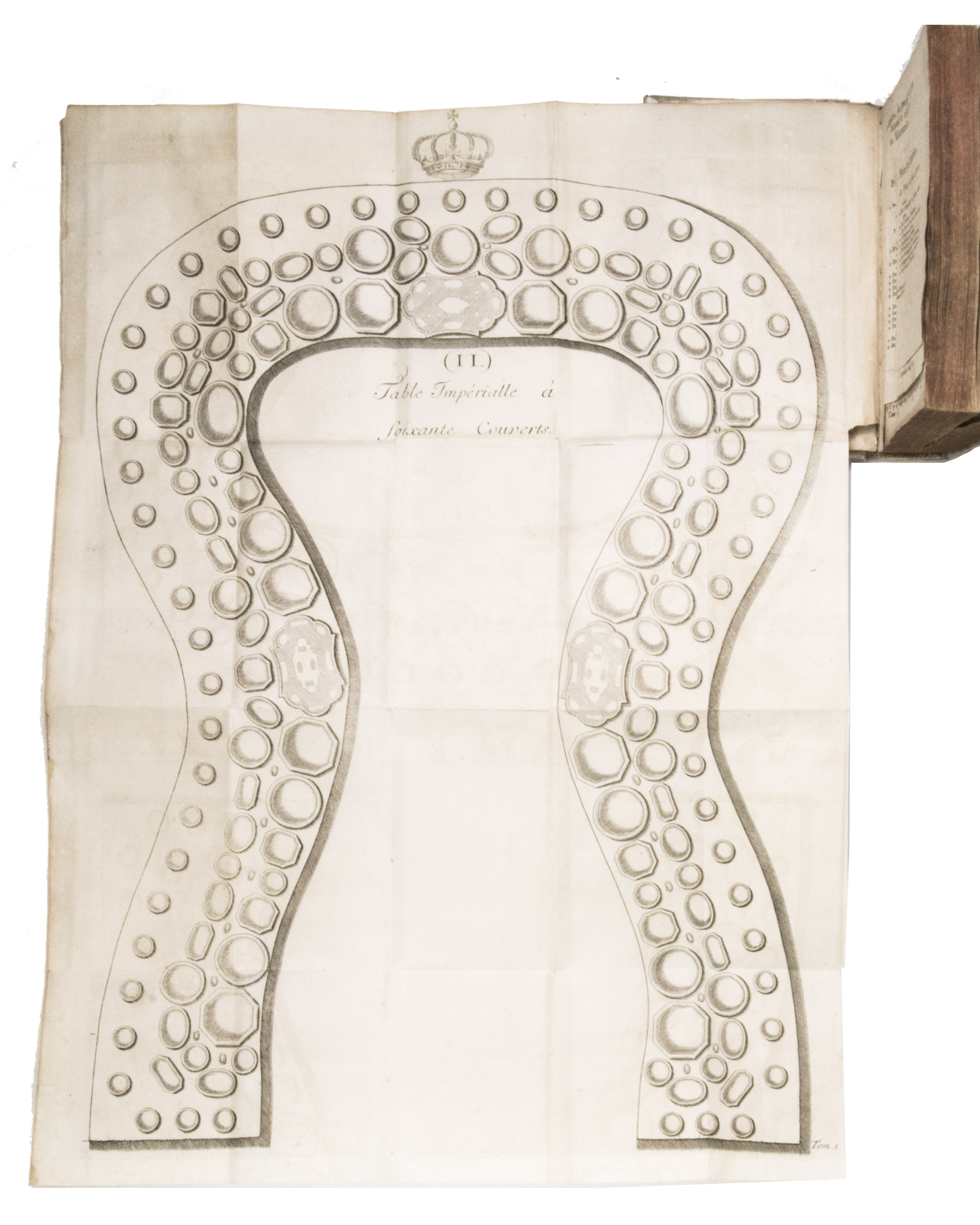 The work was originally published in English under the title The modern cook (1733). It was then translated into French and published in the Hague in 1735. A second edition, the present copy, appeared in 1742. This second edition is in fact a re-issue of parts 1-4 of the first French edition. Added are only some preliminary pages ("Avertissement de l'auteur" in part 1 and "Table des chapitres" & "Tables des planches" in parts 1-4). The engravings and printed menus (numbered I-VII) are also mostly identical, except for the engraving depicting various silver plates ("Modelle des plats ) to which French names are added. The fifth part, however, is completely new and includes two folding engravings (both unnumbered, but in fact no. VIII-IX) depicting table settings for 12 to 16 "couverts", accompanied by 1 folding printed text-leaf (numbered VIII-IX on recto and verso) with descriptions of the menus for the various dinners.