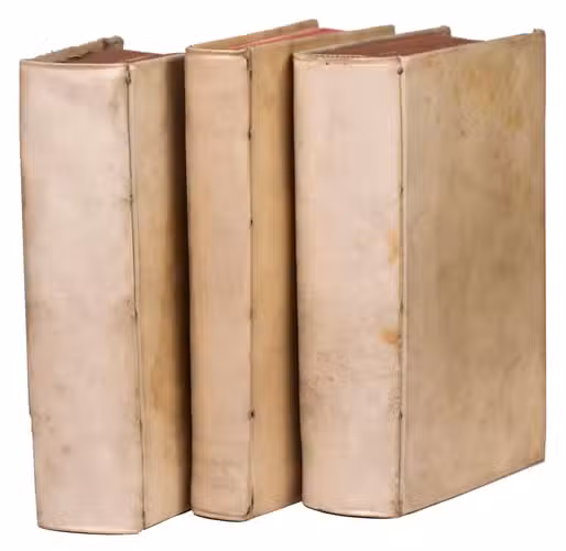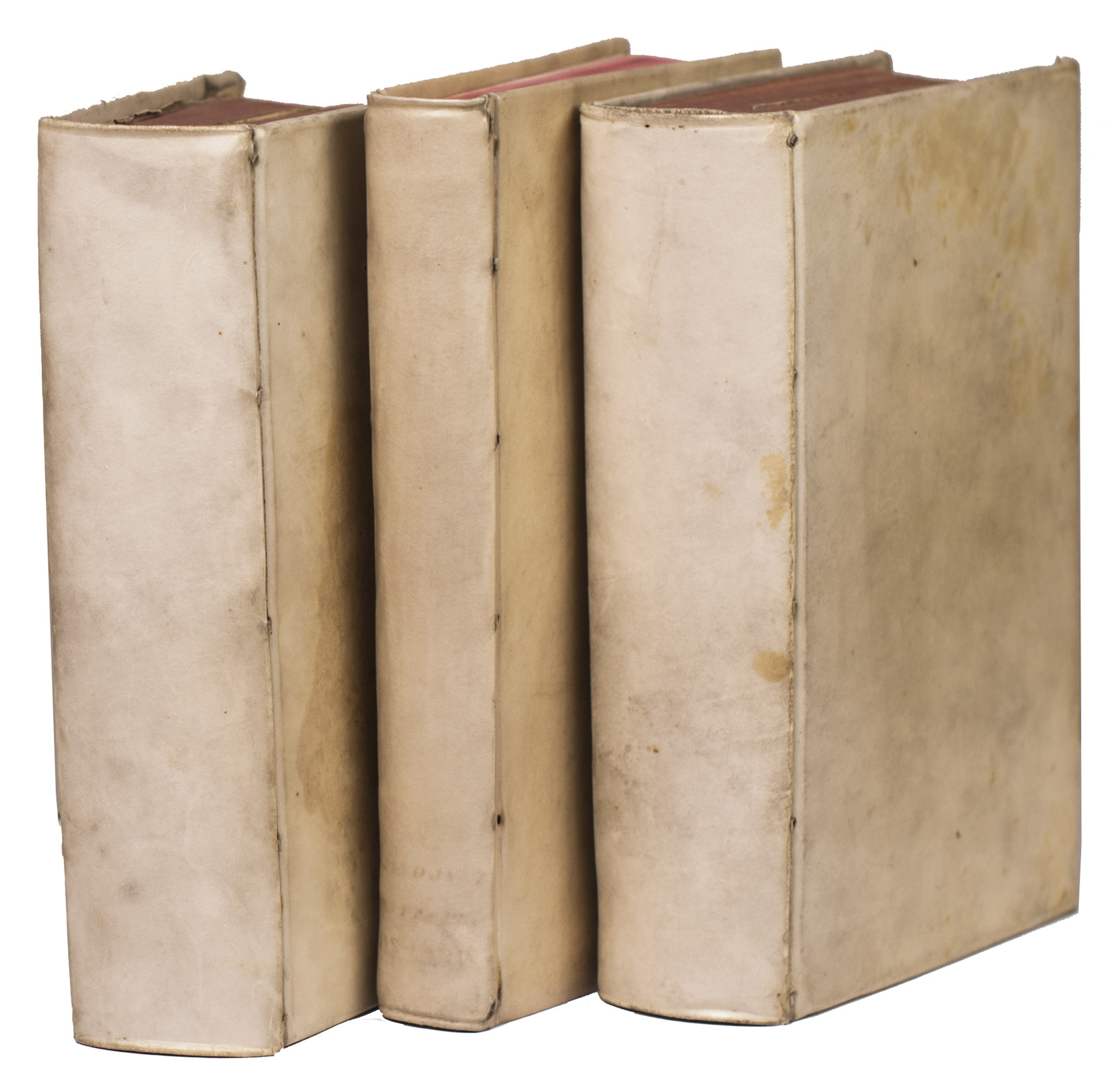 Contemporary vellum, sewn on 3 (vols. 1 and 2) or 4 (vol. 3) supports laced through the joints, red edges. [12], 261, [1 blank], [15]; [4], 258, [14]; [4], 288, [16]; [4], 313, [1 blank], [20]; [10], 346, [13] pp.