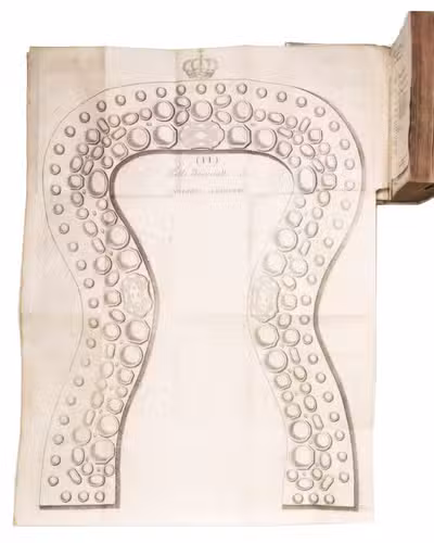 The Hague, for the author ["Aux dépens de lauteur"], 1742. 5 parts in 3 volumes. 8vo. With the title page of each part printed in red and black, 13 large folding engraved plates, of which 1 has been printed on 4 attached leaves and is exceptionally large (ca. 28 x 150 cm), 5 folding printed text-leaves, and a woodcut armorial headpiece.