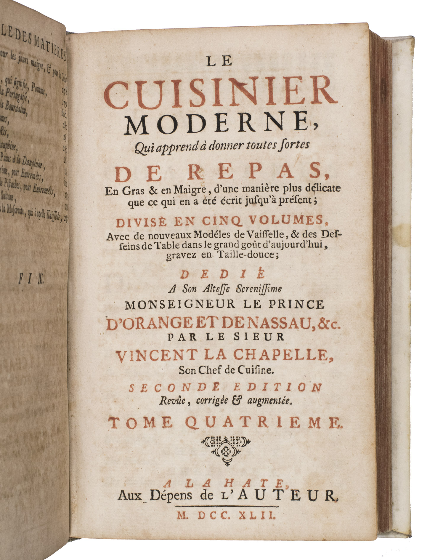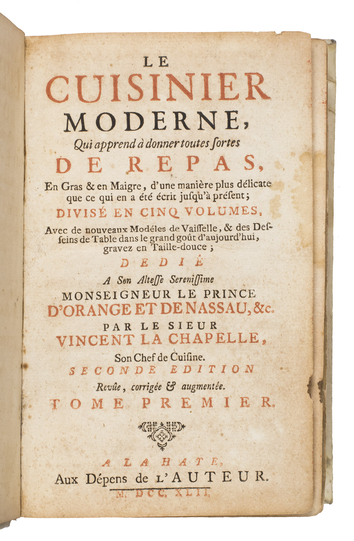 La Chapelle was from 1731 till 1733 chief cook for the English ambassador in The Hague, Philip Dormer Stanhope, 4th Earl of Chesterfield (1694-1773), who was in The Hague to arrange and negotiate the marriage of Stadtholder William IV, Prince of Orange (1711-1751) with the daughter of the English King George II, Princess Anne (1709-1759), which took place in 1734 in London. The next year La Chapelle entered the Stadtholders service as his chief cook in which function he stayed till his death in 1745. The French edition was dedicated to William IV.