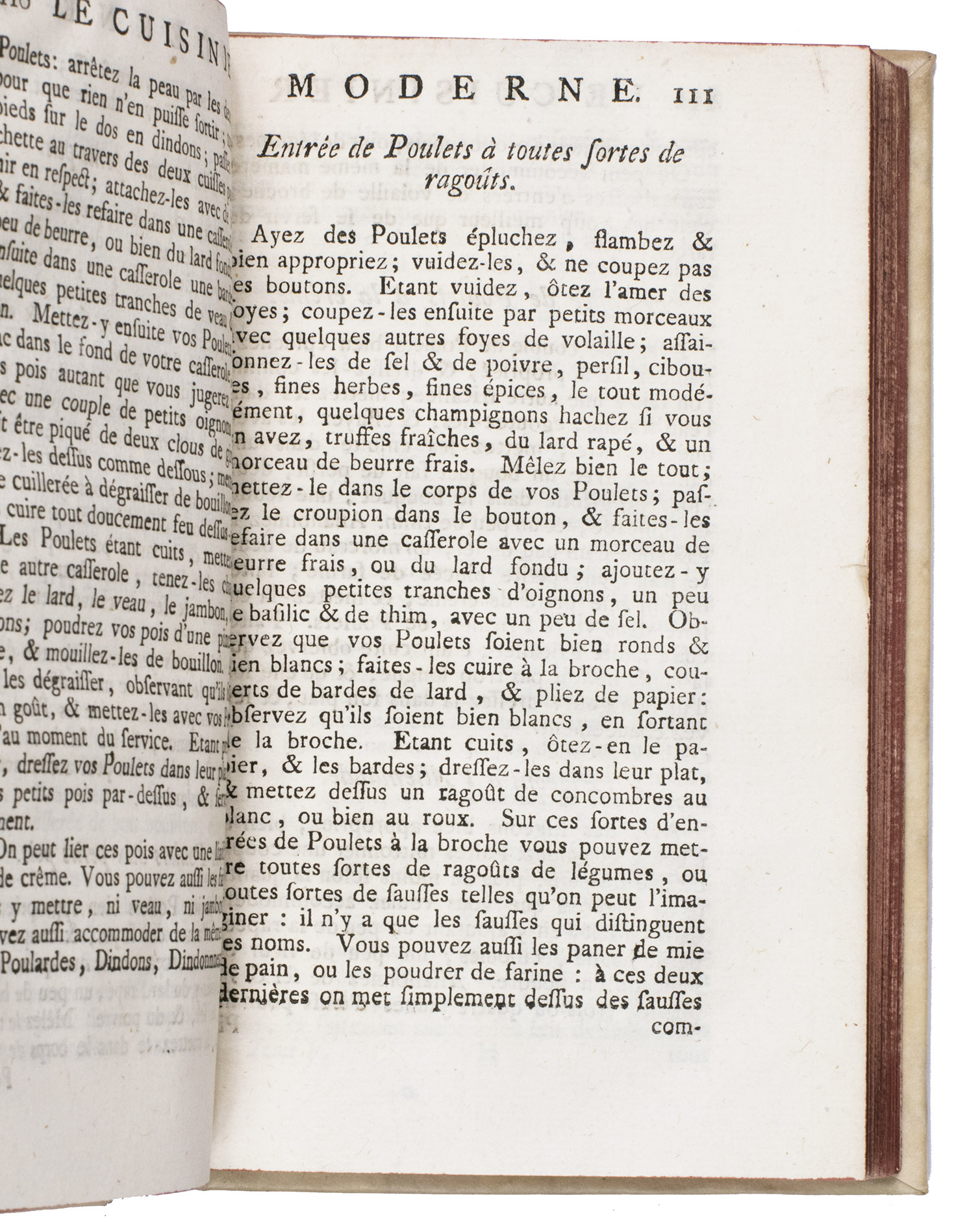 Complete set of the famous cookery book by Vincent La Chapelle (1690/1703-1745), which strongly influenced the cuisine of the British aristocracy. Insisting on a rupture with the past and characterising his cooking as modern by simplifying recipes and streamlining cooking methods as a reaction against the over-refined food that had dominated the previous decades, the work became one of the great classics of the culinary arts in the 18th century. The present edition has been enlarged with a new, fifth part.