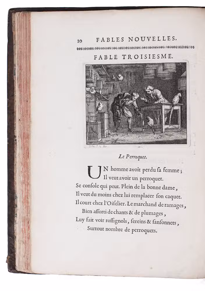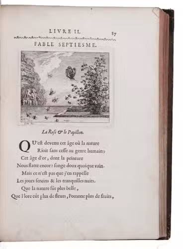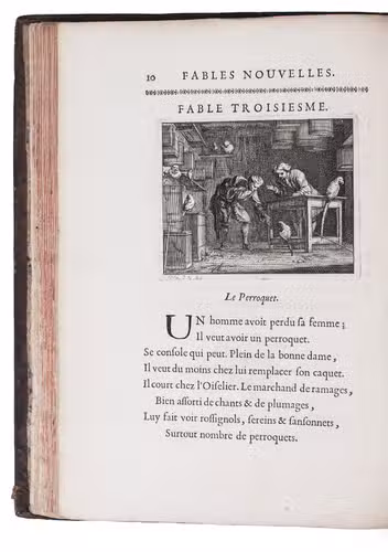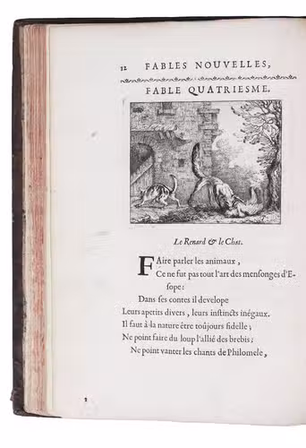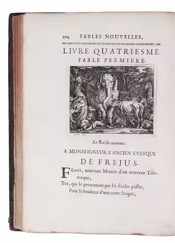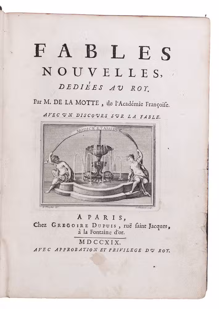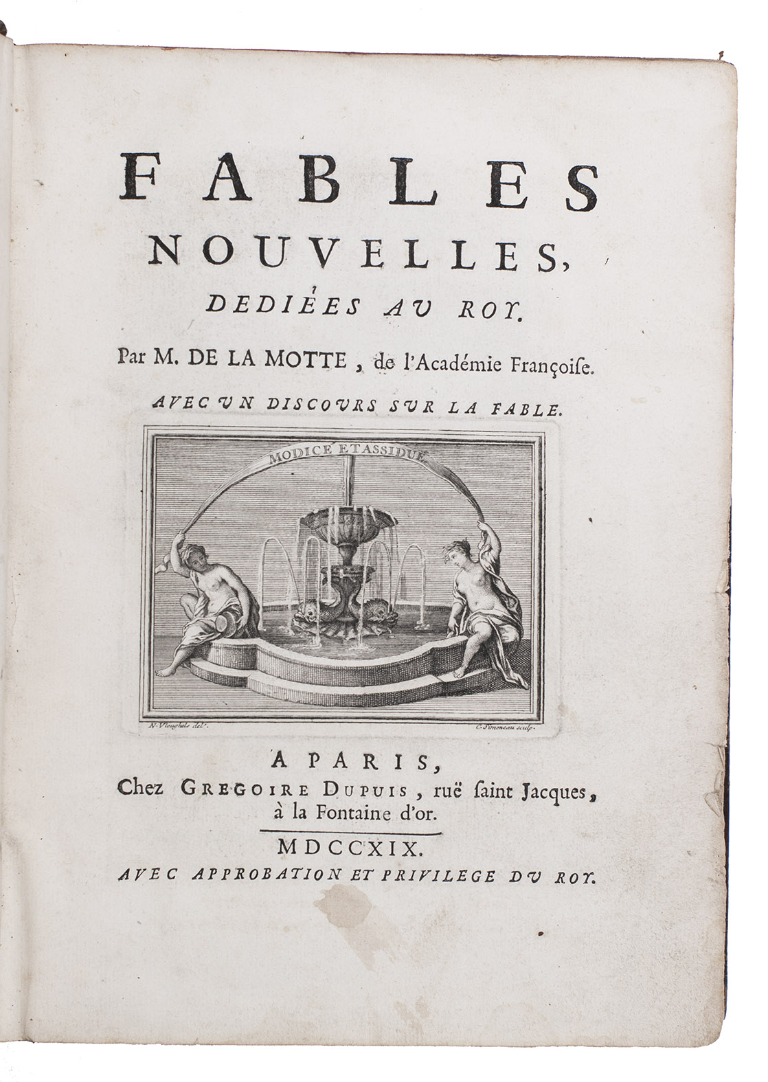 First edition of a famous French fable book, beautifully illustrated by the most famous artists of the day. The book contains 100 fables by Antoine Houdar de La Motte (1672-1731), modelled after the fables by Jean de La Fontaine, the most important French fable author ever. Of special interest is La Motte-Houdart's introductory essay on the genre of the fable, setting out rules to be followed, based on the classical ideals of true likeness, unity and proper arrangement. He intends to rival both Aesop and La Fontaine.