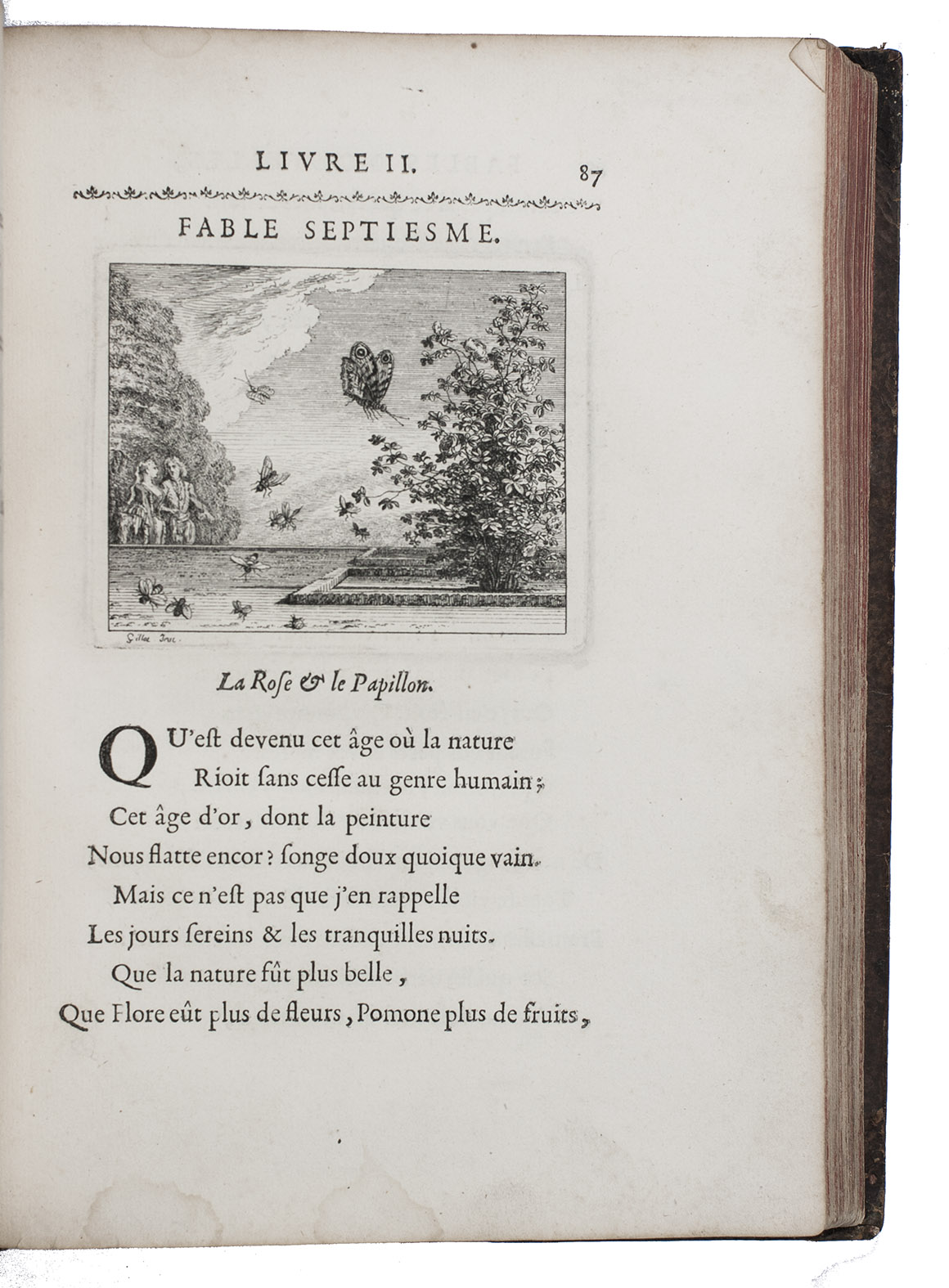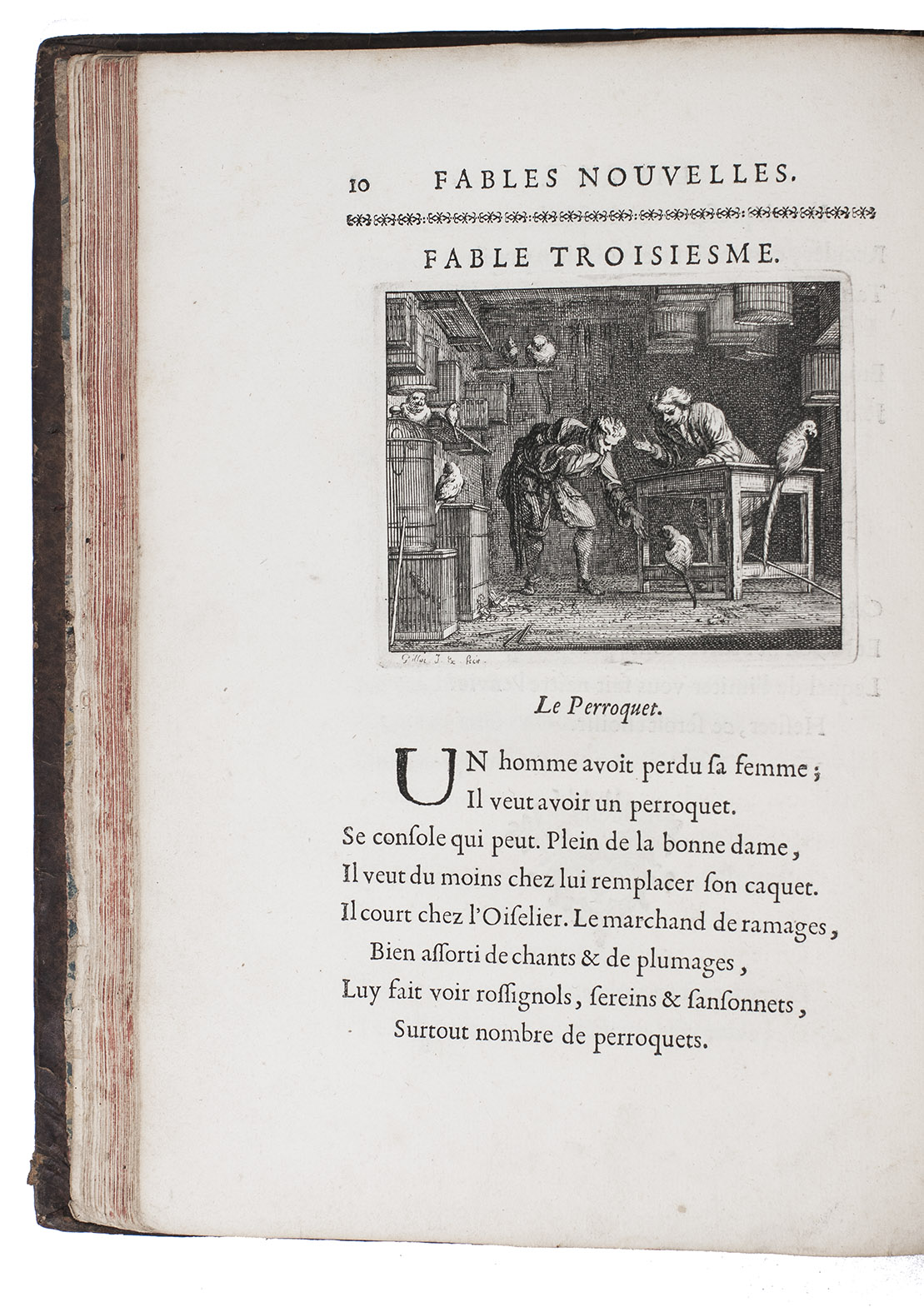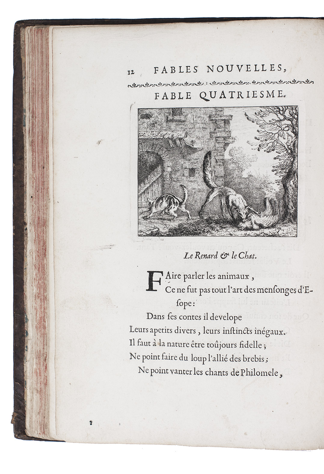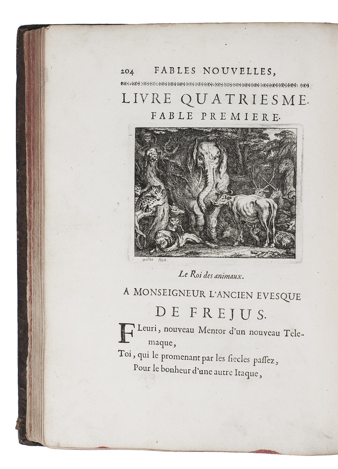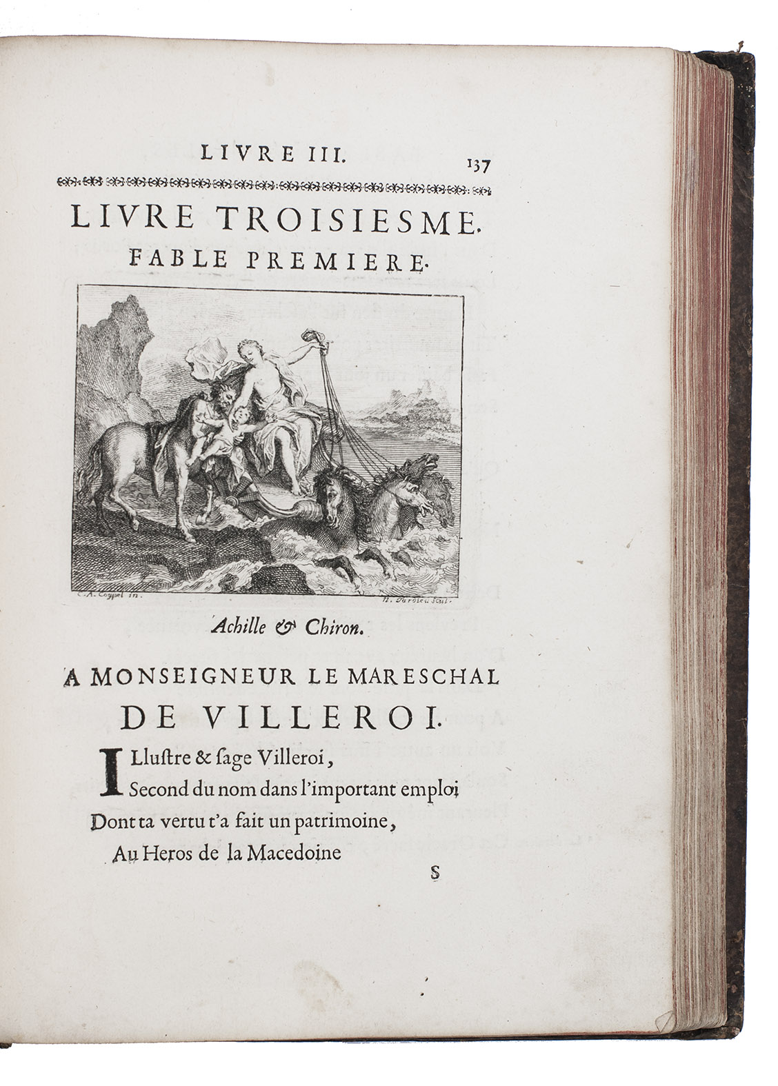 Paris, Gregoire Dupuis, 1719. 4to. With engraved allegorical frontispiece by N. Tardieu after Charles Coypel, engraved vignette on title-page by C. Simeneau after N. Vleughels and 100 engraved illustrations to the fables by and after Claude Gillot, Charles Antoine Coypel, Jean Ranc, Bernard Picart, Jean Baptiste Massé, etc. Contemporary mottled calf, gold-tooled spine. XLII, [4], 358, [2] pp.