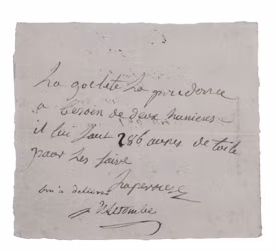 An exceptionally rare autograph note signed by the great French explorer La Pérouse. The extraordinary story and achievements of La Pérouse are well known, and recounted in the handsome official account of his expedition. However, because he was lost without trace mid-voyage, manuscript material relating to his life is very rare indeed. In the present note La Pérouse asks that his boat be given an impressive 286 "aunes" of canvas which is needed on board. An "aune" is an old-fashioned French measure usually translated as ell or cubit: its length could vary but the normal French/Parisian aune was about 118 cm, meaning that La Pérouse is in fact asking for about 340 metres of canvas. The sheer quantity of the request speaks to La Pérouse having written the note while in charge of a large vessel.