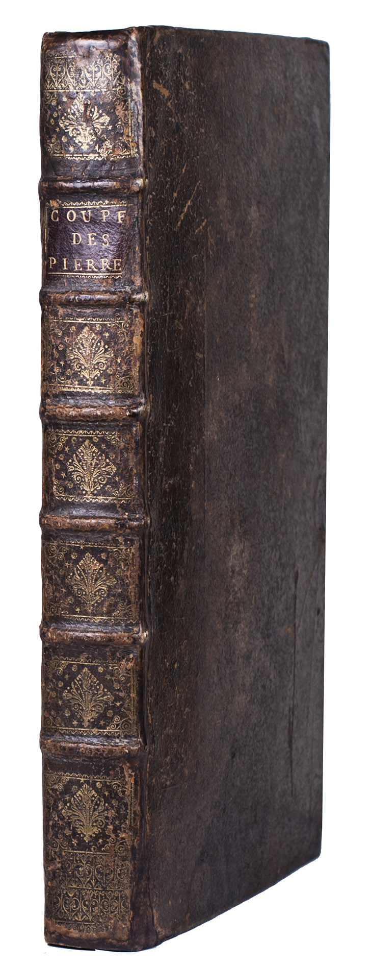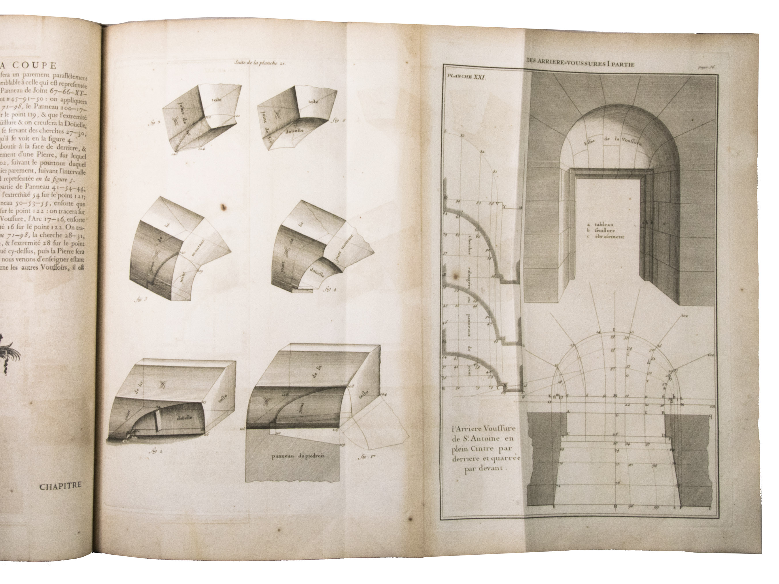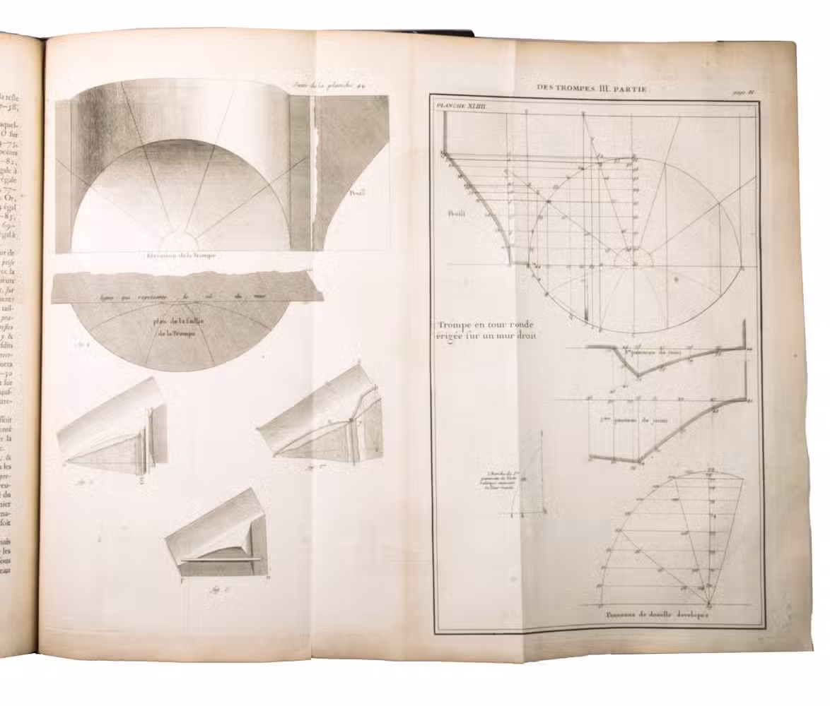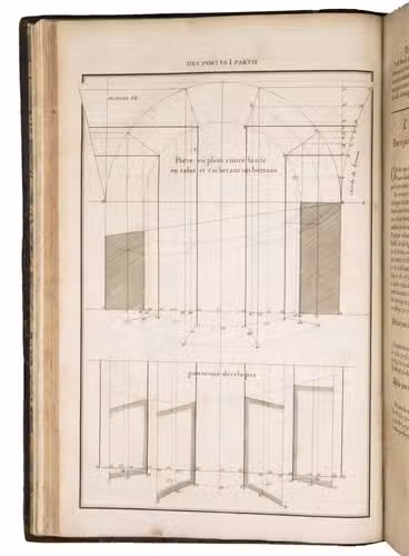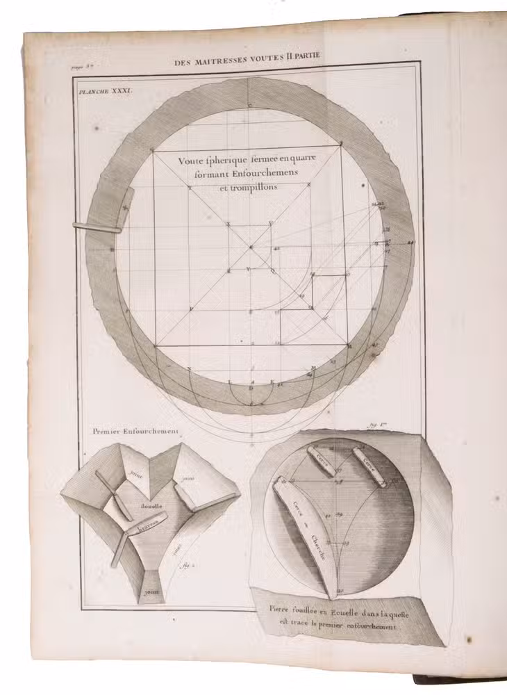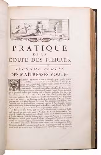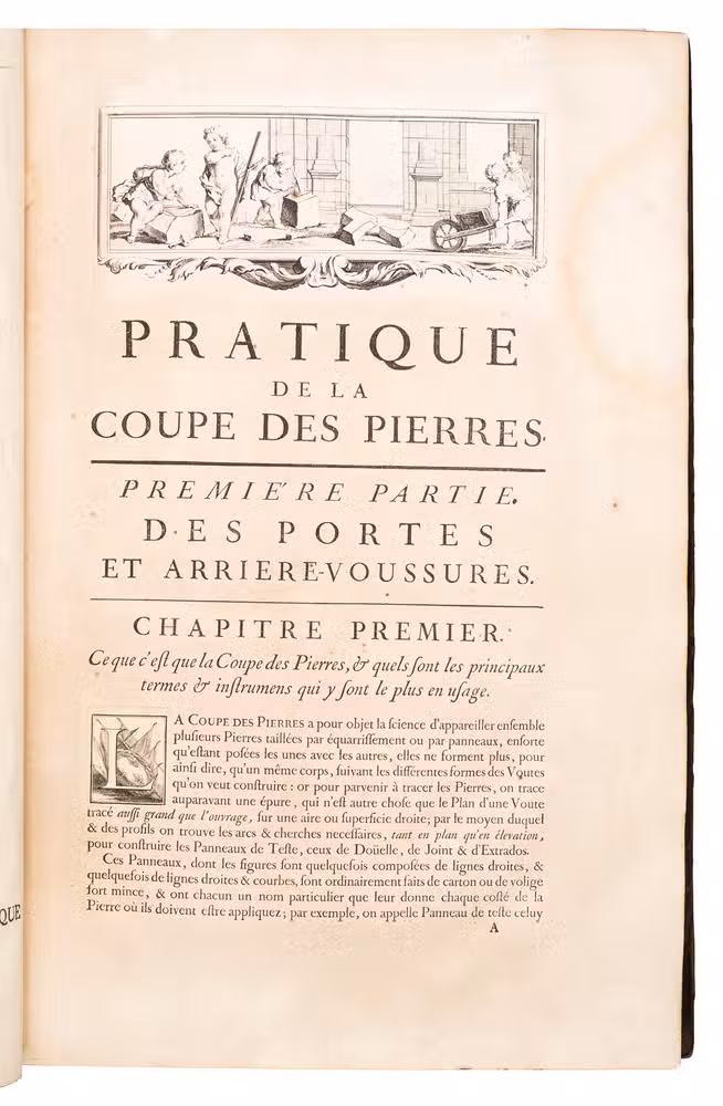 Second issue of the first edition (1728) of "the most accurate and complete work on the subject of stone-cutting for building" (BAL). An abundantly and clearly illustrated manual on cutting stone for architectural construction, with meticulously detailed instructions. The main text is divided into five parts covering doorways and entry vaults, other vaults, pendentives (sections of domes), rampant (asymmetrical) arches and spiral stairs. All five parts are extensively illustrated, mostly with one or two plates for every chapter, in total 120 full-page plates and 1 large folding plate (plate size 47.5 x 61 cm) showing plans, cross-sections and views of gates, doorways, halls, tunnels, vaults, domes, corridors, niches, windows, staircases, etc. along with some measuring tools. The present copy is said to be on large-paper: it is in any case about the same size as the BAL copy, giving it generous margins.