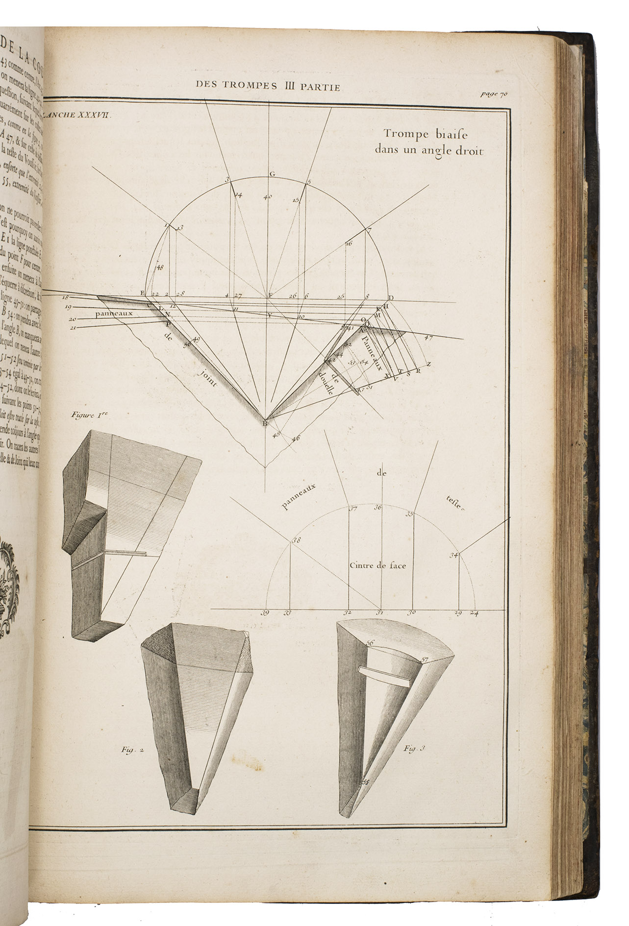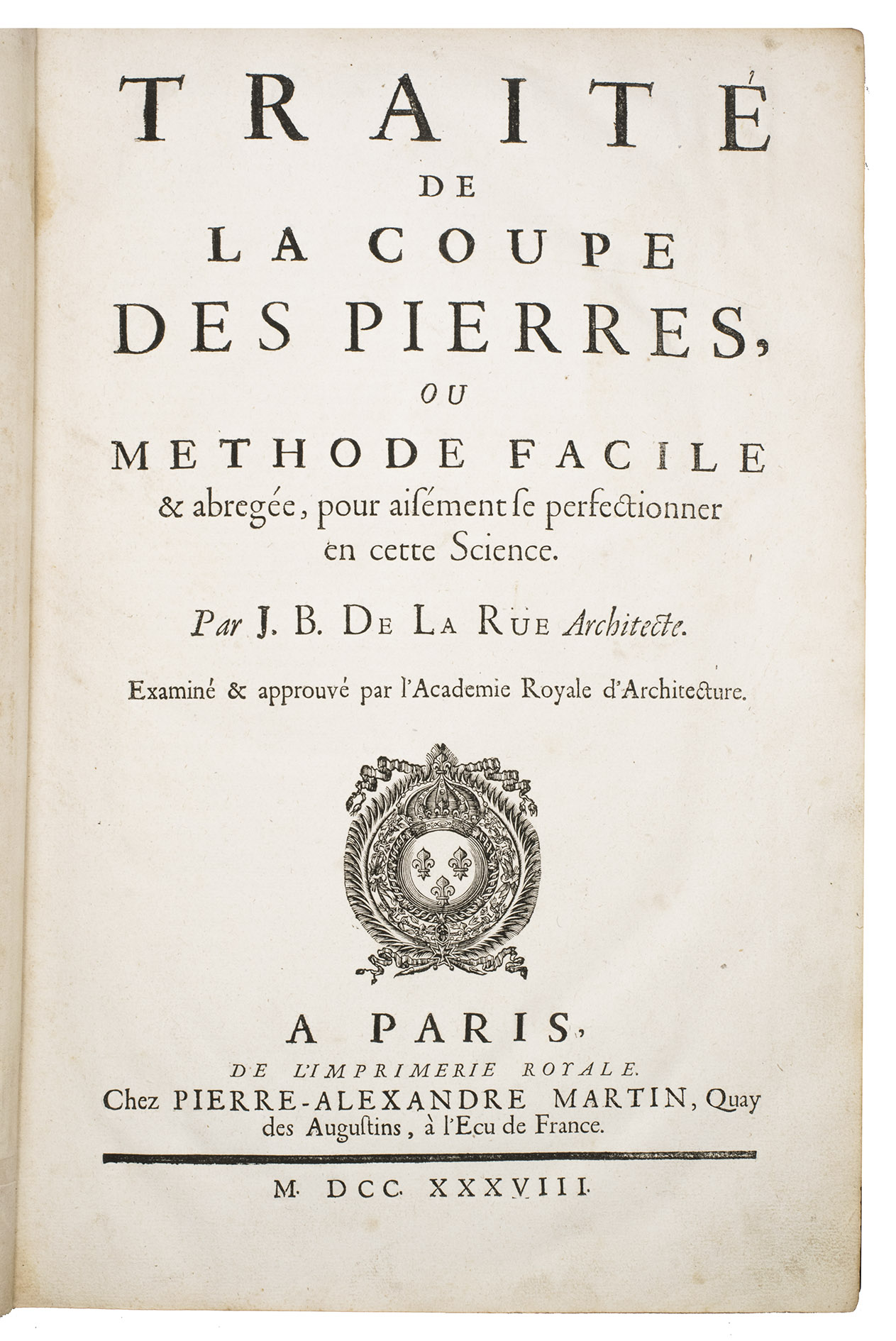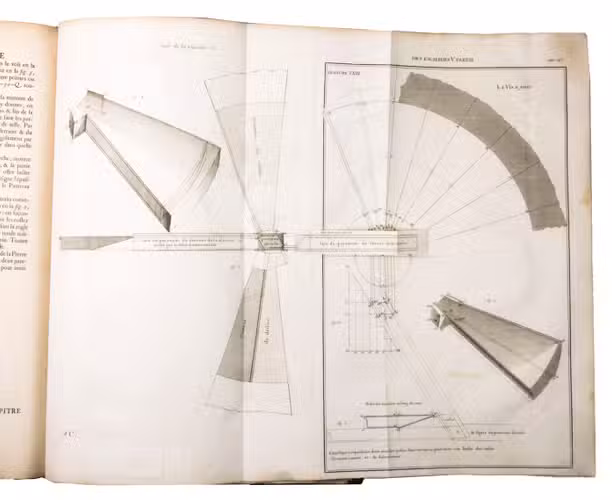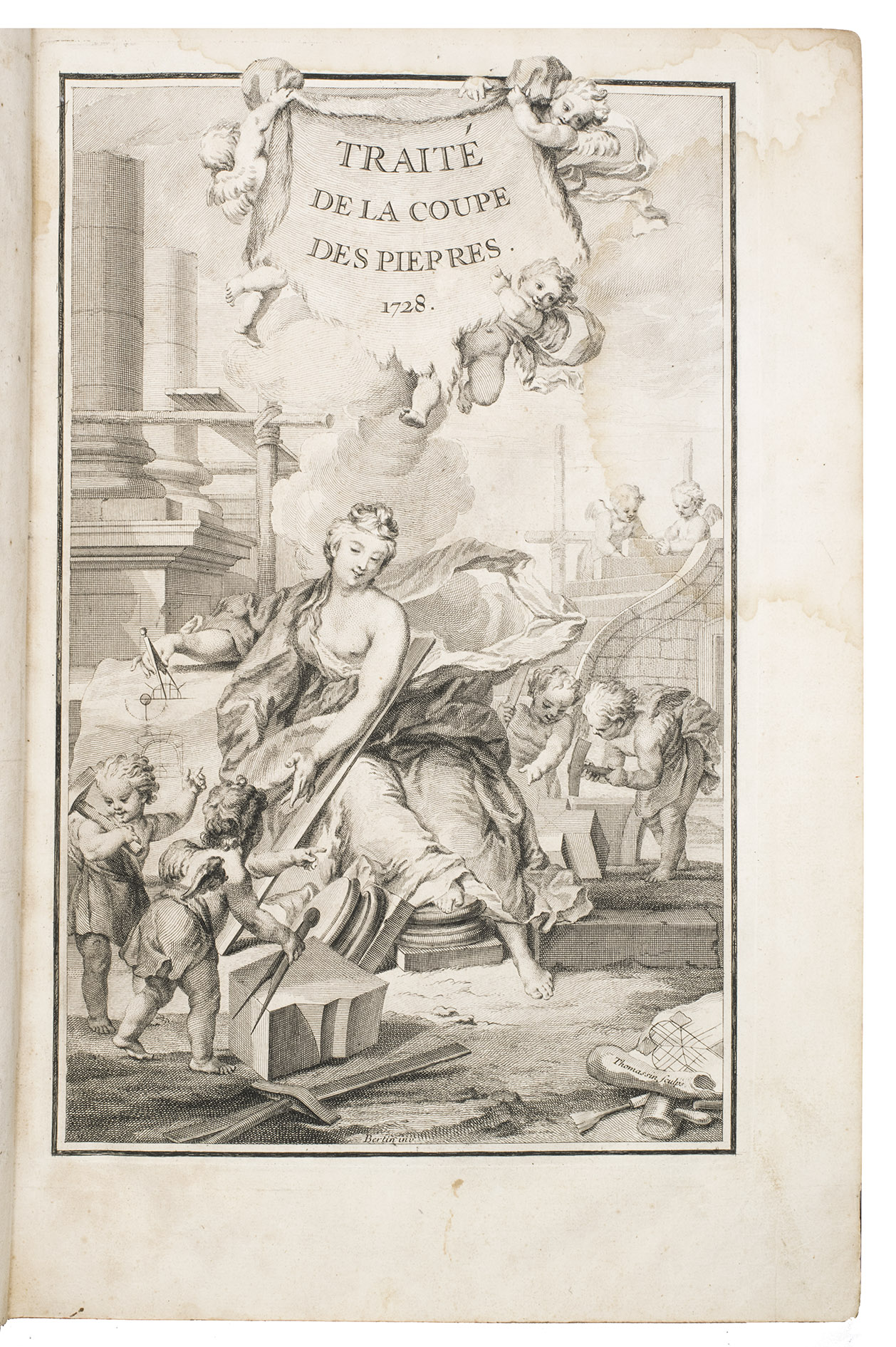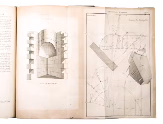 Second issue of the first edition (1728) of "the most accurate and complete work on the subject of stone-cutting for building" (BAL). An abundantly and clearly illustrated manual on cutting stone for architectural construction, with meticulously detailed instructions. The main text is divided into five parts covering doorways and entry vaults, other vaults, pendentives (sections of domes), rampant (asymmetrical) arches and spiral stairs. All five parts are extensively illustrated, mostly with one or two plates for every chapter, in total 120 full-page plates and 1 large folding plate (plate size 47.5 x 61 cm) showing plans, cross-sections and views of gates, doorways, halls, tunnels, vaults, domes, corridors, niches, windows, staircases, etc. along with some measuring tools. The present copy is said to be on large-paper: it is in any case about the same size as the BAL copy, giving it generous margins.