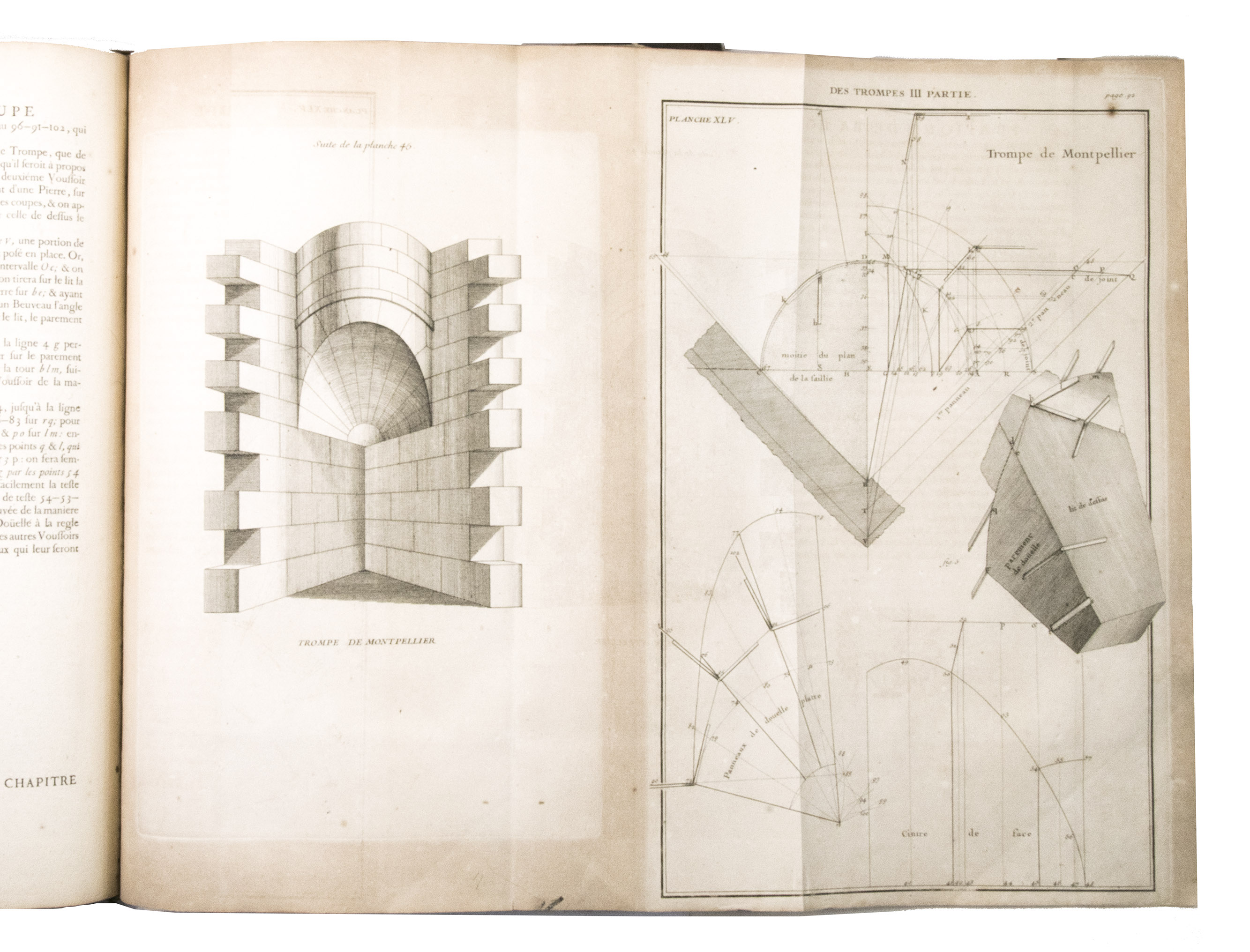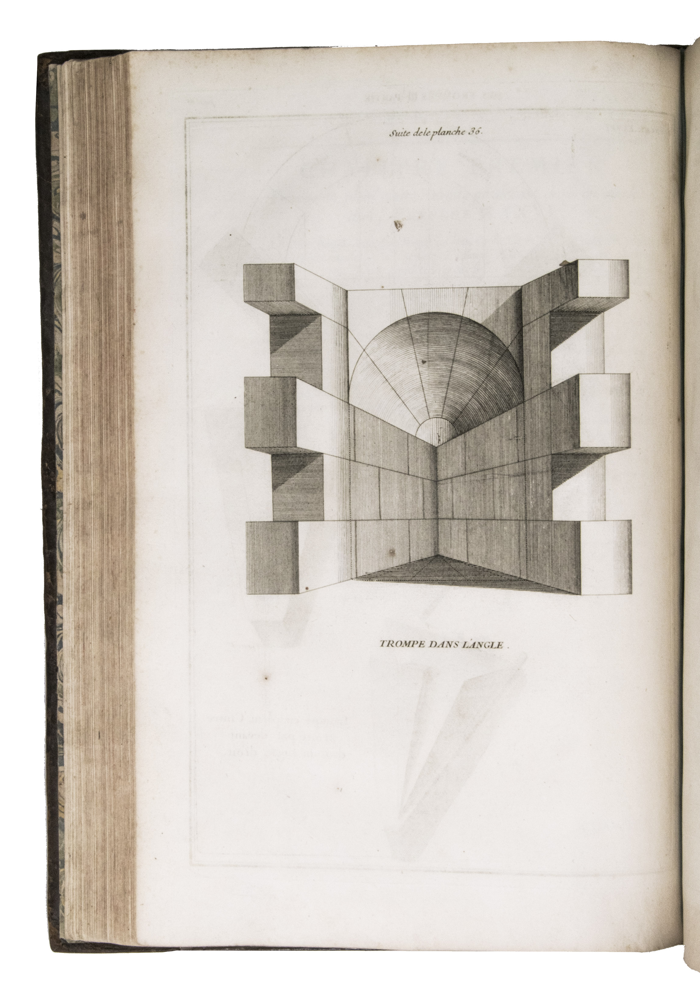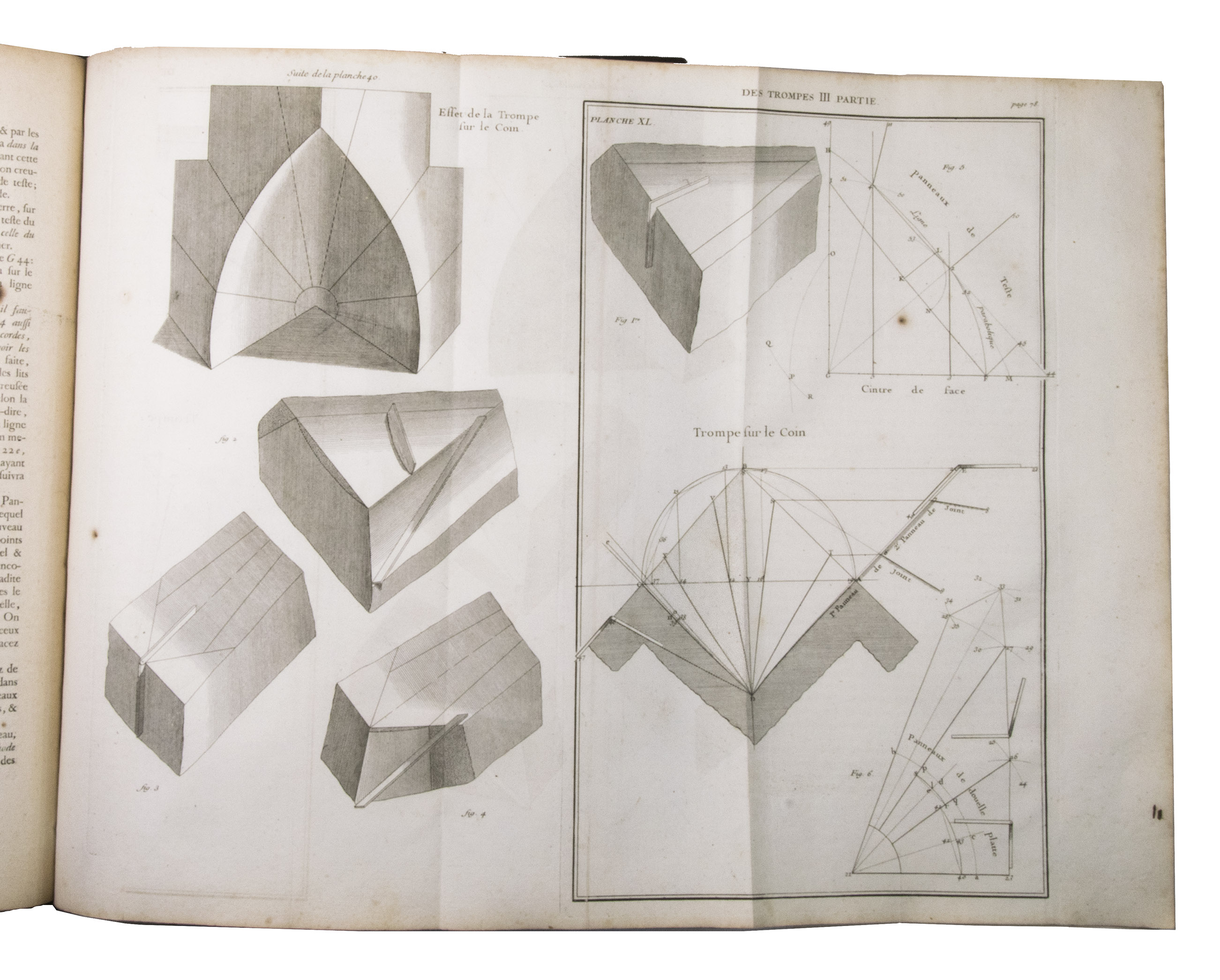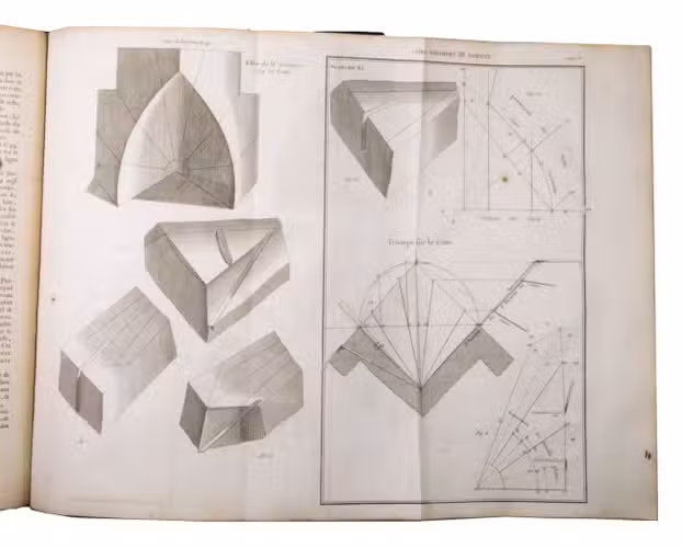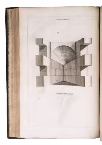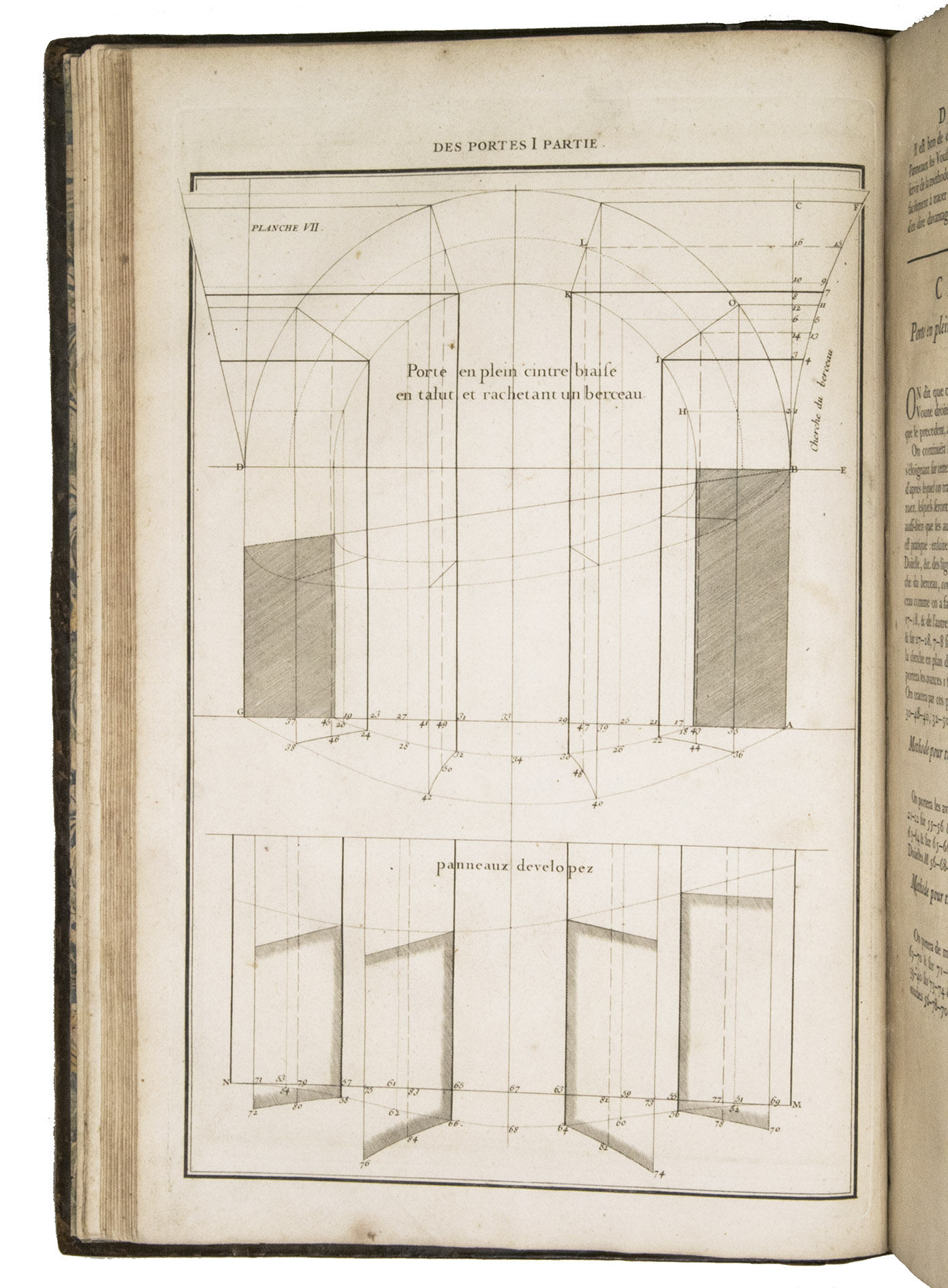Second issue of the first edition (1728) of "the most accurate and complete work on the subject of stone-cutting for building" (BAL). An abundantly and clearly illustrated manual on cutting stone for architectural construction, with meticulously detailed instructions. The main text is divided into five parts covering doorways and entry vaults, other vaults, pendentives (sections of domes), rampant (asymmetrical) arches and spiral stairs. All five parts are extensively illustrated, mostly with one or two plates for every chapter, in total 120 full-page plates and 1 large folding plate (plate size 47.5 x 61 cm) showing plans, cross-sections and views of gates, doorways, halls, tunnels, vaults, domes, corridors, niches, windows, staircases, etc. along with some measuring tools. The present copy is said to be on large-paper: it is in any case about the same size as the BAL copy, giving it generous margins.