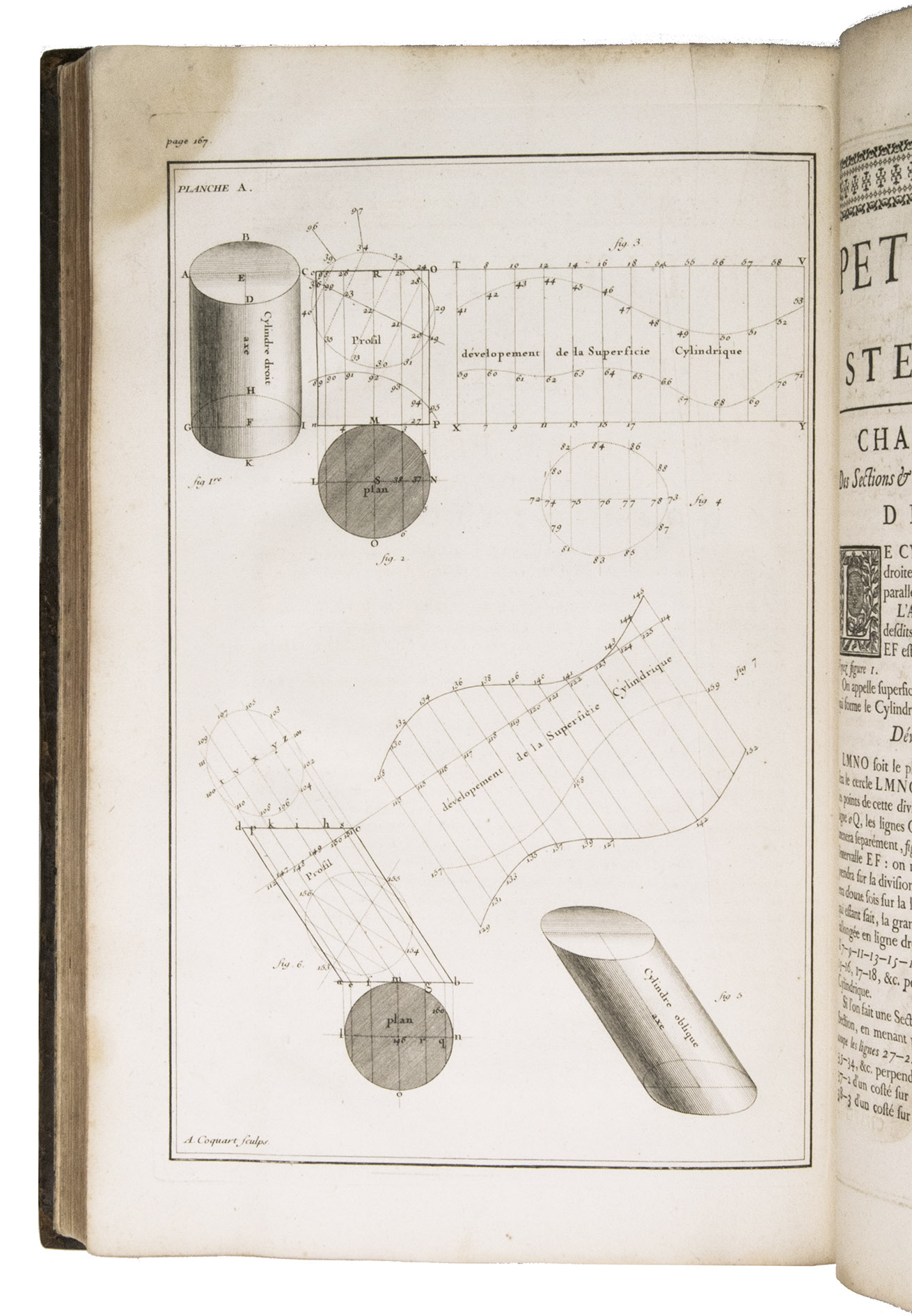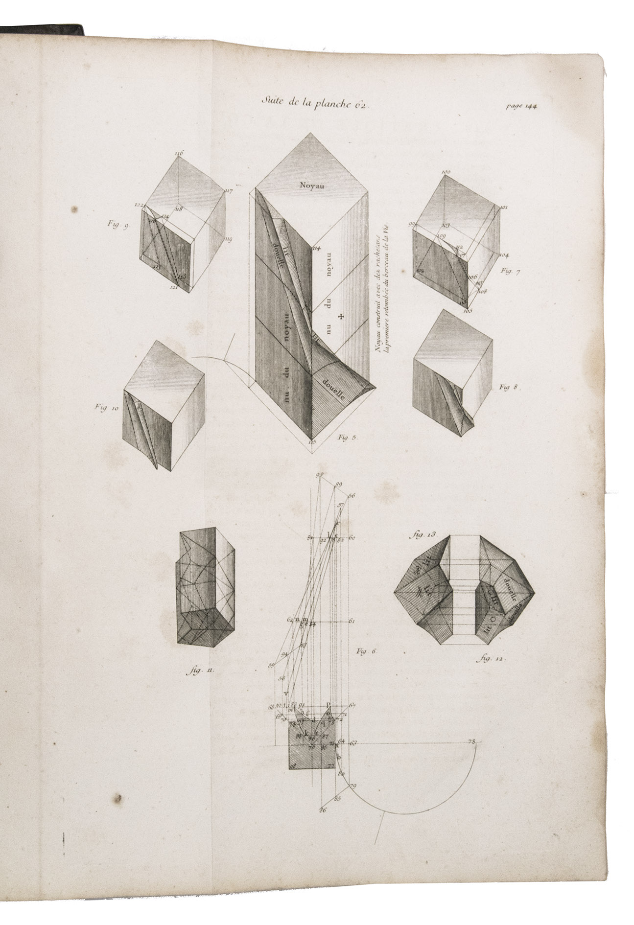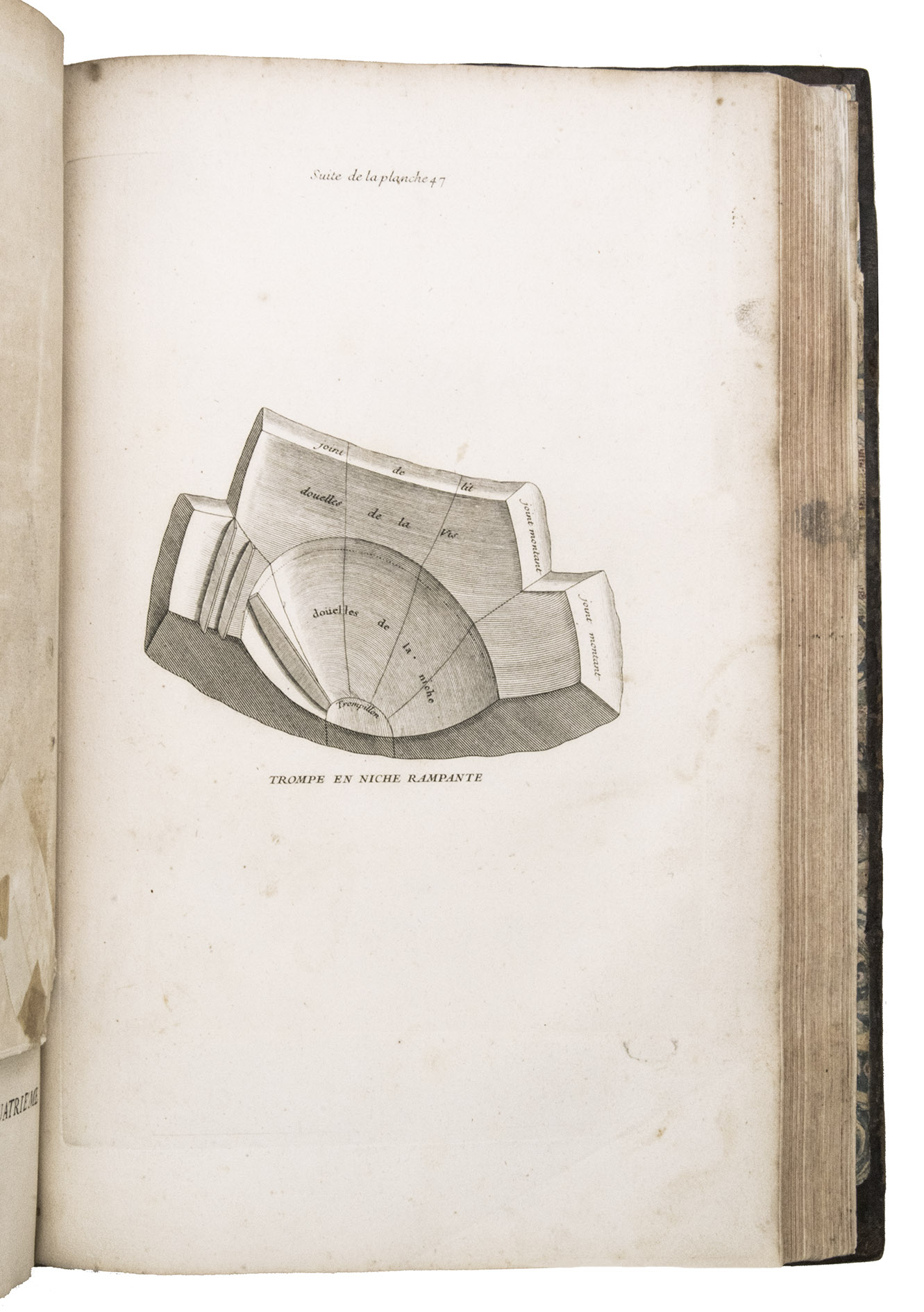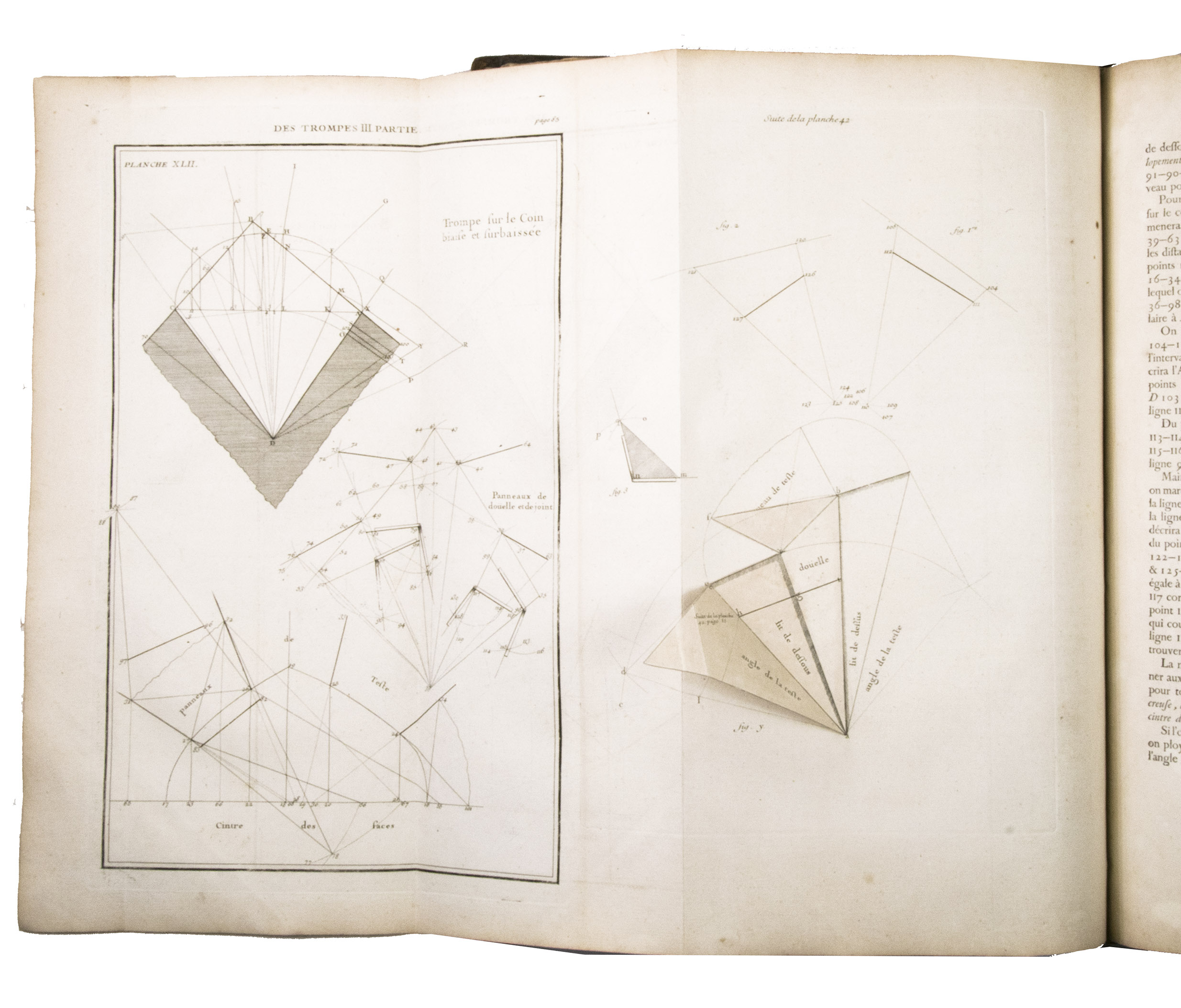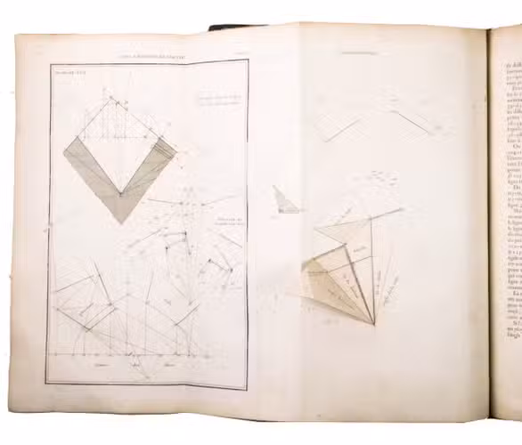 Second issue of the first edition (1728) of "the most accurate and complete work on the subject of stone-cutting for building" (BAL). An abundantly and clearly illustrated manual on cutting stone for architectural construction, with meticulously detailed instructions. The main text is divided into five parts covering doorways and entry vaults, other vaults, pendentives (sections of domes), rampant (asymmetrical) arches and spiral stairs. All five parts are extensively illustrated, mostly with one or two plates for every chapter, in total 120 full-page plates and 1 large folding plate (plate size 47.5 x 61 cm) showing plans, cross-sections and views of gates, doorways, halls, tunnels, vaults, domes, corridors, niches, windows, staircases, etc. along with some measuring tools. The present copy is said to be on large-paper: it is in any case about the same size as the BAL copy, giving it generous margins.