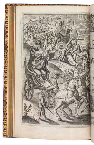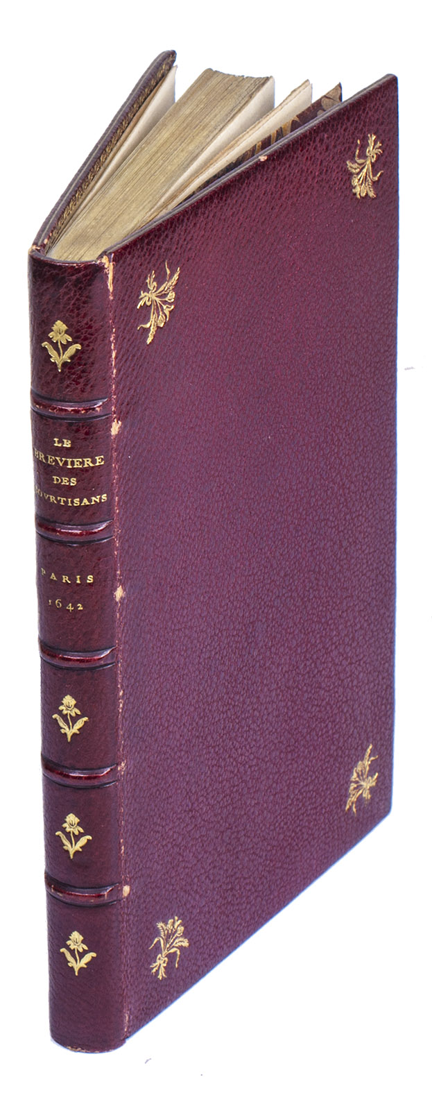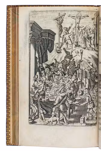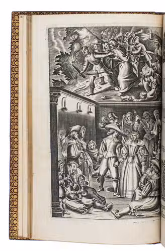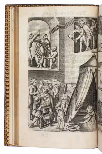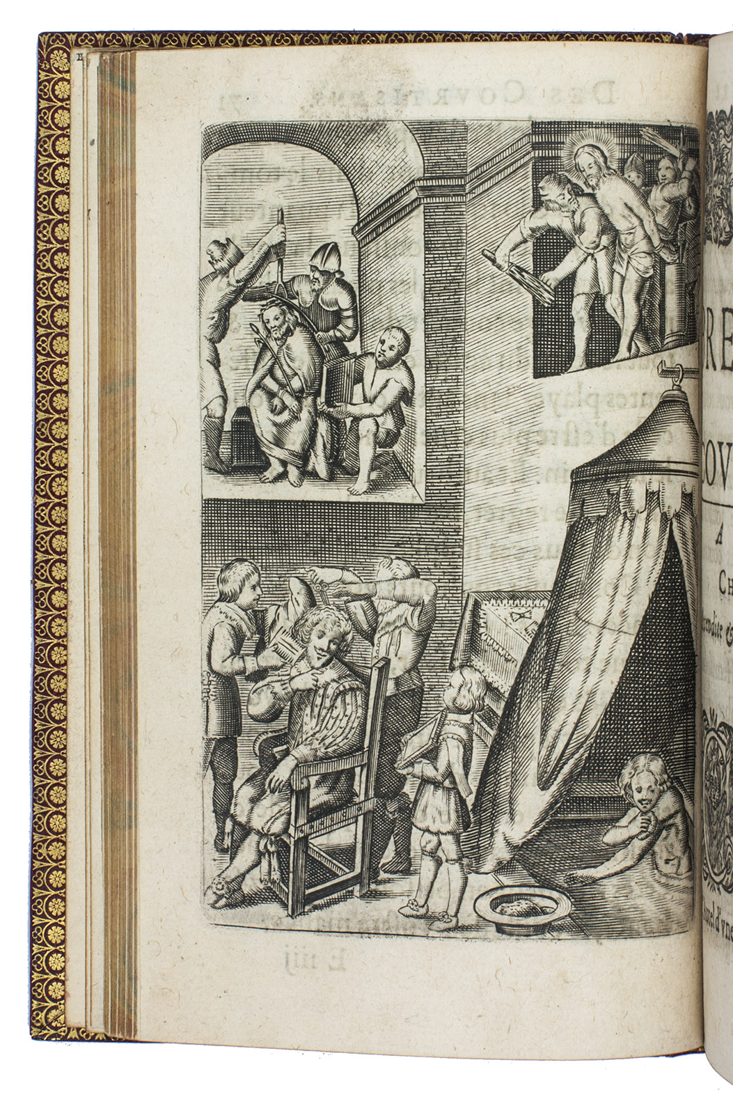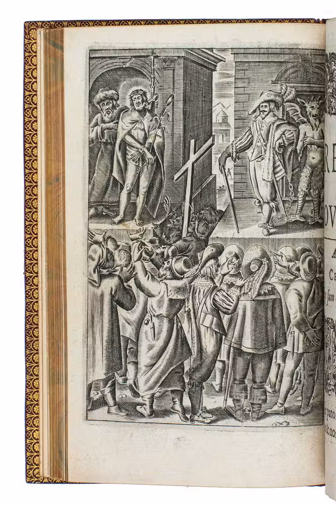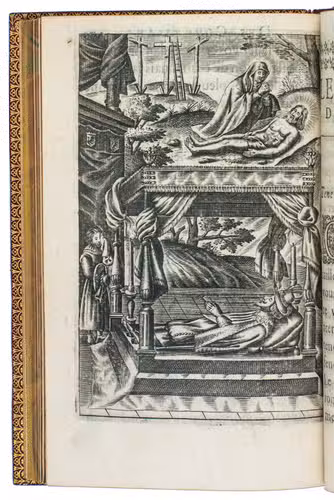 Paris, Jeremie Boüillerot, 1642. 8vo. With woodcut vignette on title page and 7 engraved plates depicting contrasting double-scenes, after designs by Nicolaas van der Horst. Gold-tooled red morocco attributed to Henry Gaillard (active in the third quarter of the 19th century), richly gold-tooled turn-ins, gilt edges. [6], 304 pp.