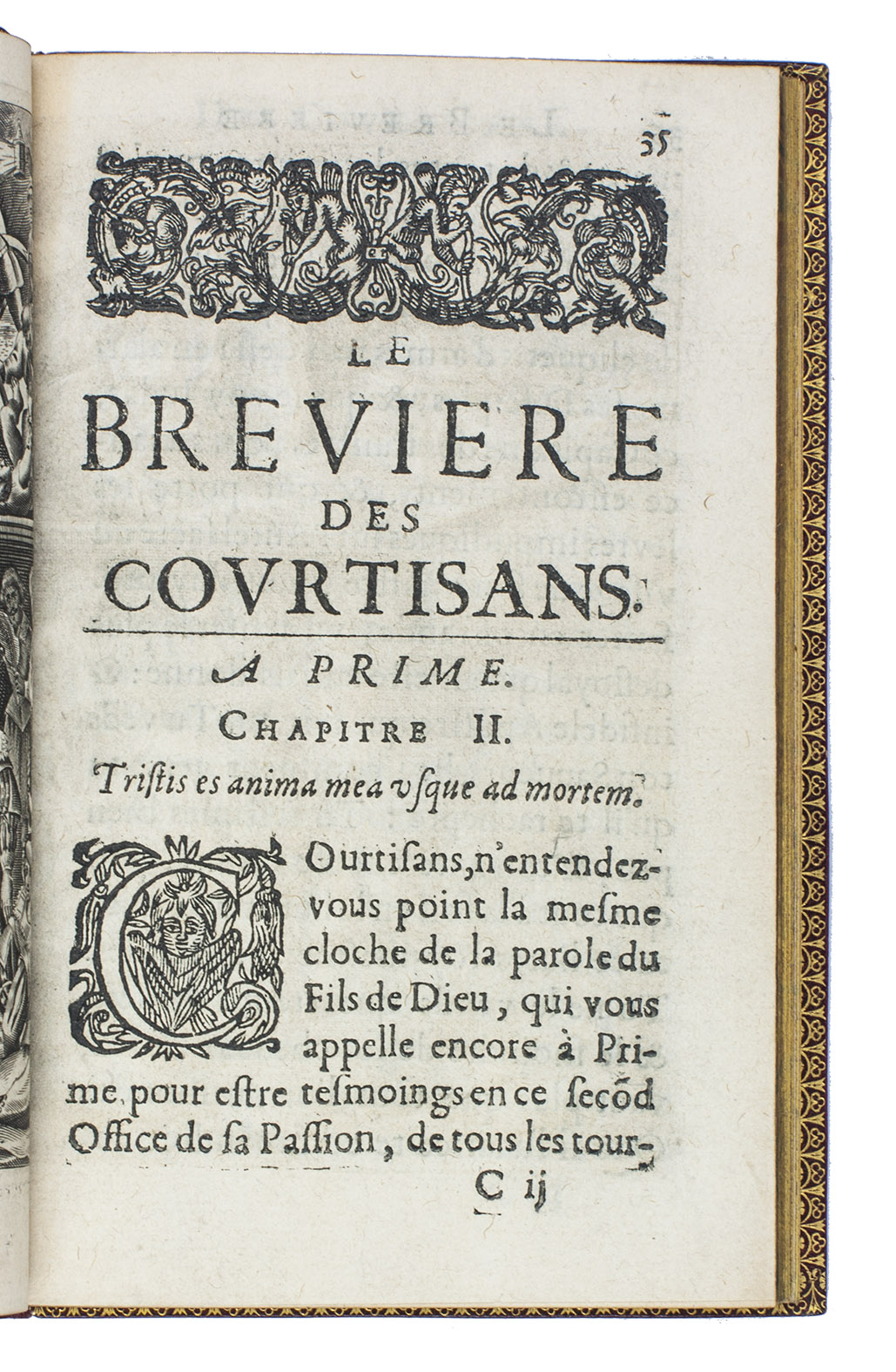 Fourth(?) edition of a rare illustrated "breviary for courtesans", as opposed to the breviary of a priest, by the popular French author Jean Puget de la Serre (1600-1665), librarian to Gaston d'Orléans and official historian of France. The book is divided into 7 parts according to the main devotional hours, from matins to complices, each part illustrated with an engraved plate showing a scene of the life of Christ together with a contrasting scene depicting the wordly pleasures of courtesans. The text also focuses on these contrasts.
